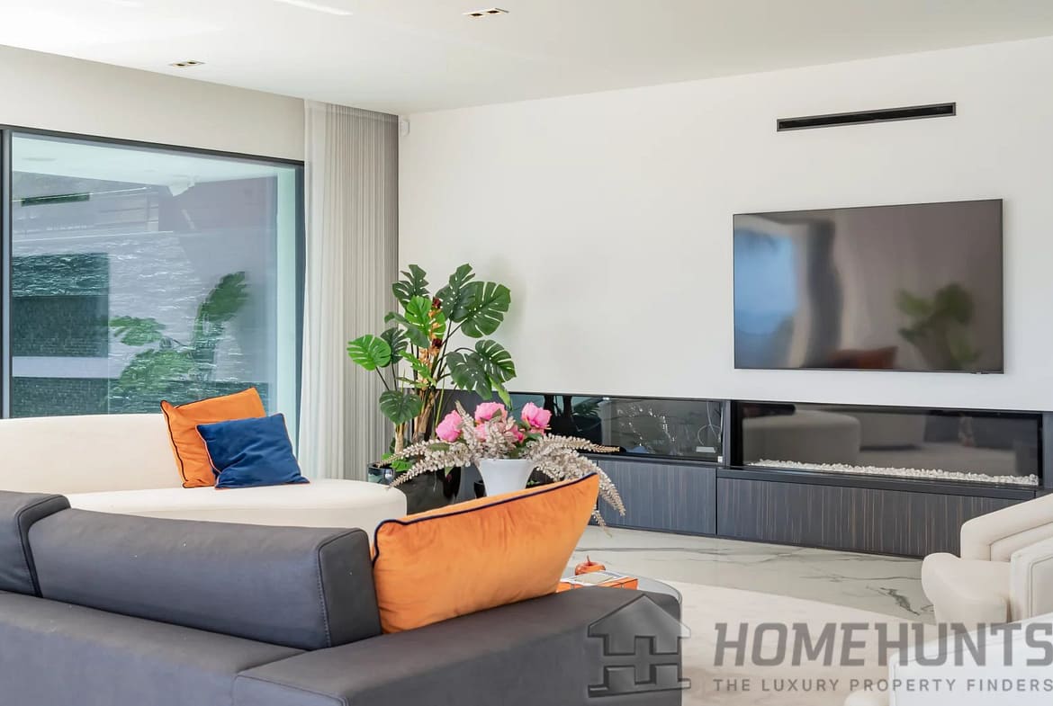 Large kitchen open to the dining room and a double living room with fireplace overlooking a generous terrace by the pool.