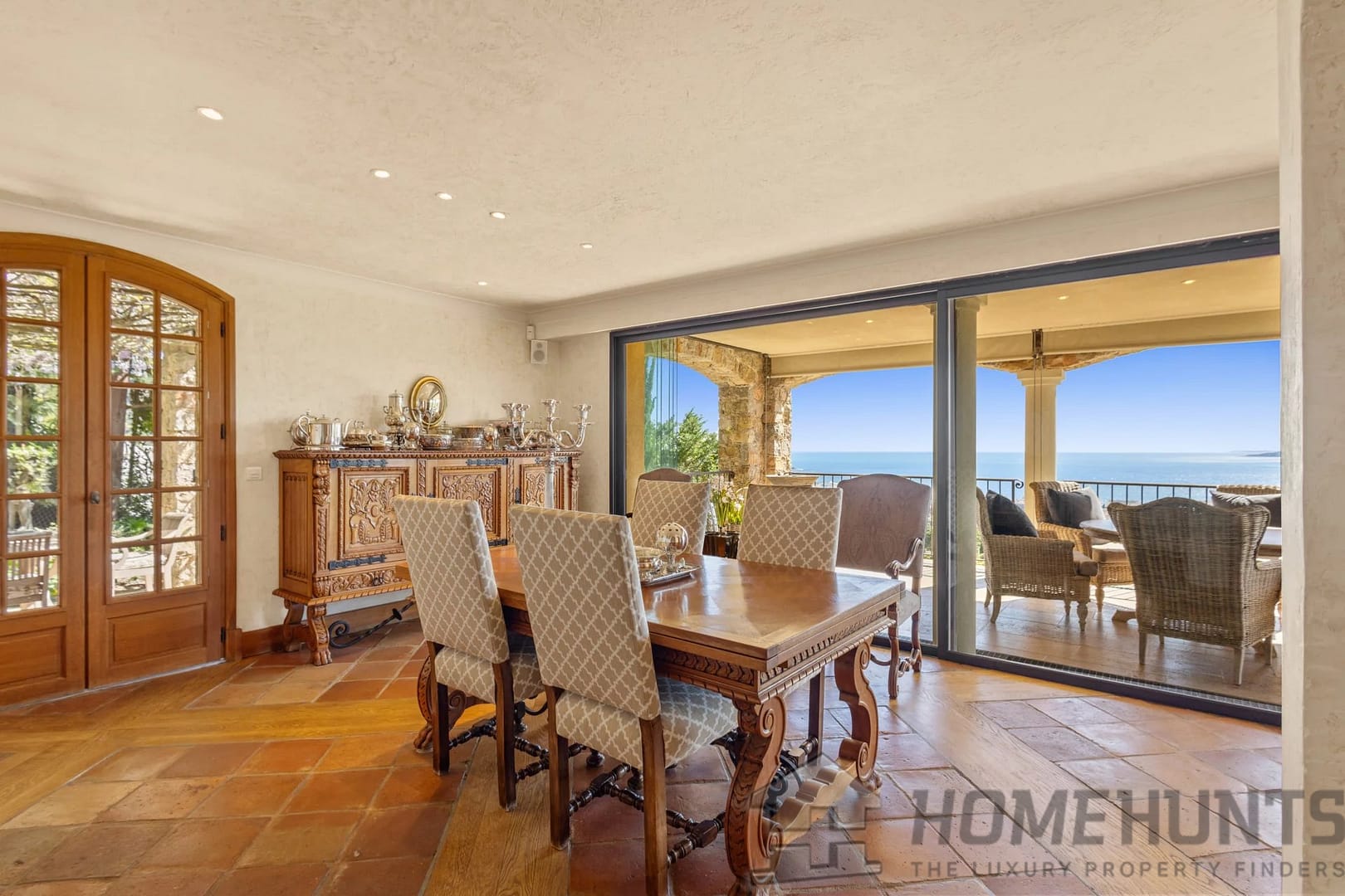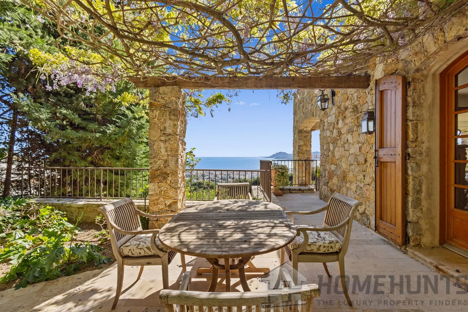 Set within 5,500 m2 of meticulously landscaped gardens, the 650 m2 residence achieves a perfect harmony between rustic authenticity and refined luxury. The interiors showcase magnificent exposed wooden beams and stone archways, while expansive glass doors frame the sea views and flood the living spaces with golden Riviera light.