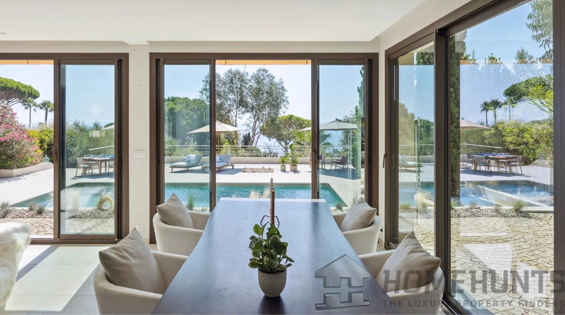Set on an almost flat plot of 1,320 m2, it enjoys a beautiful view of Cap d’Antibes and the sea.
