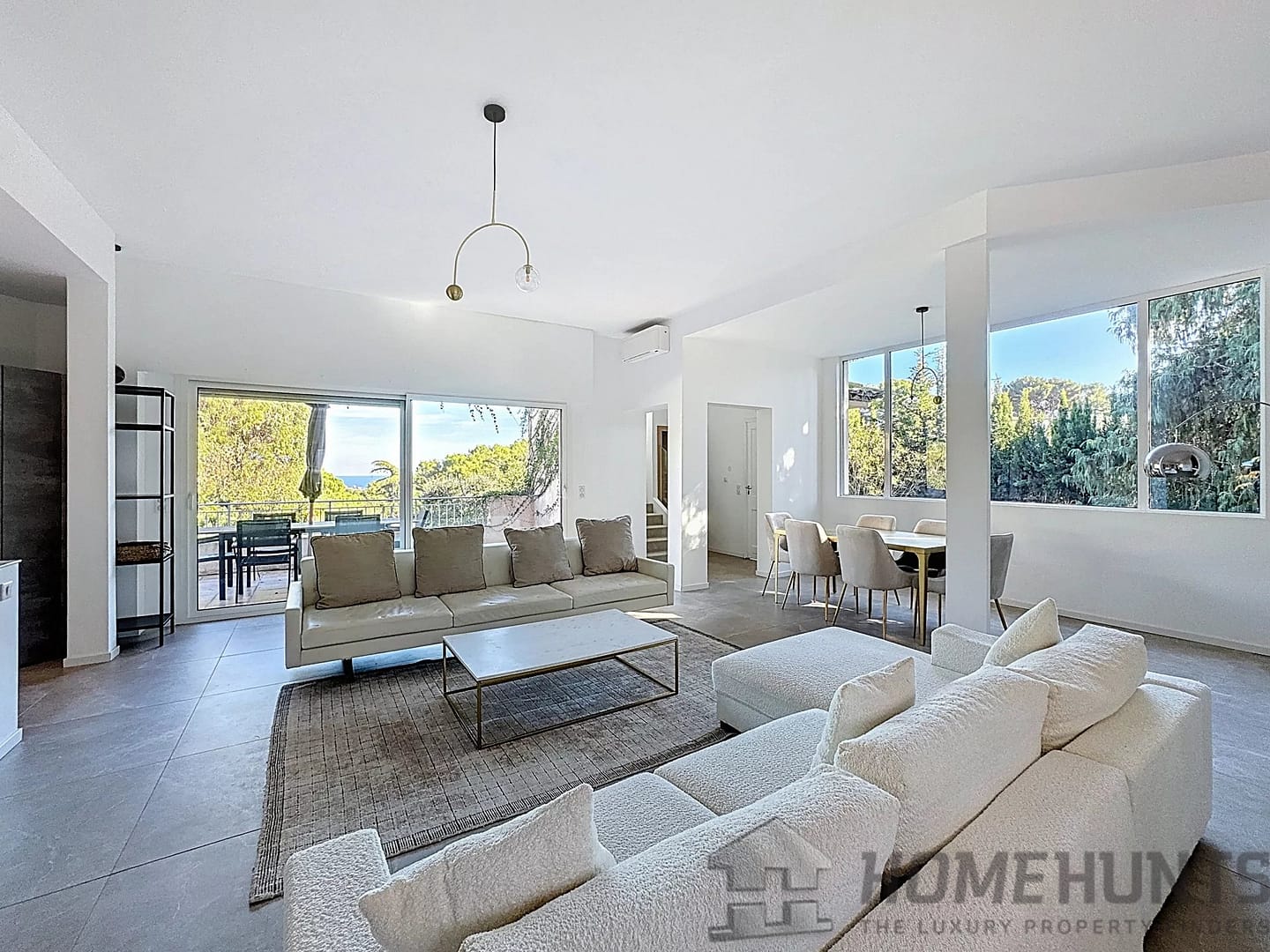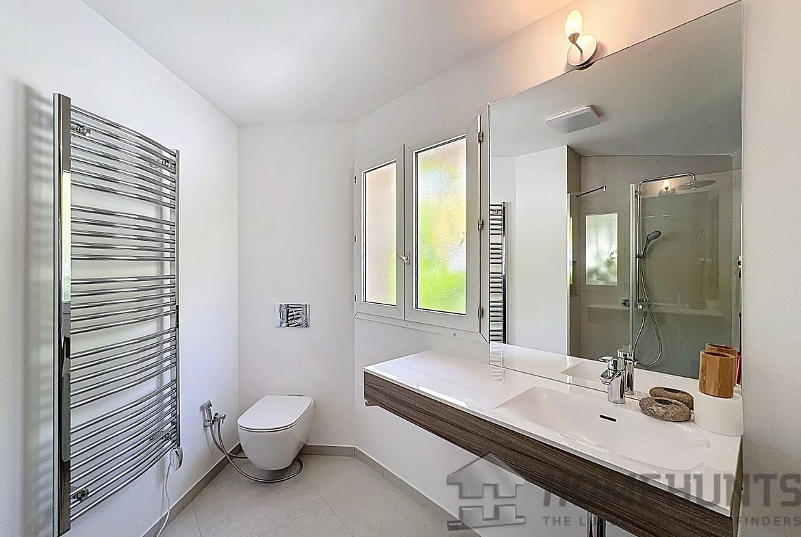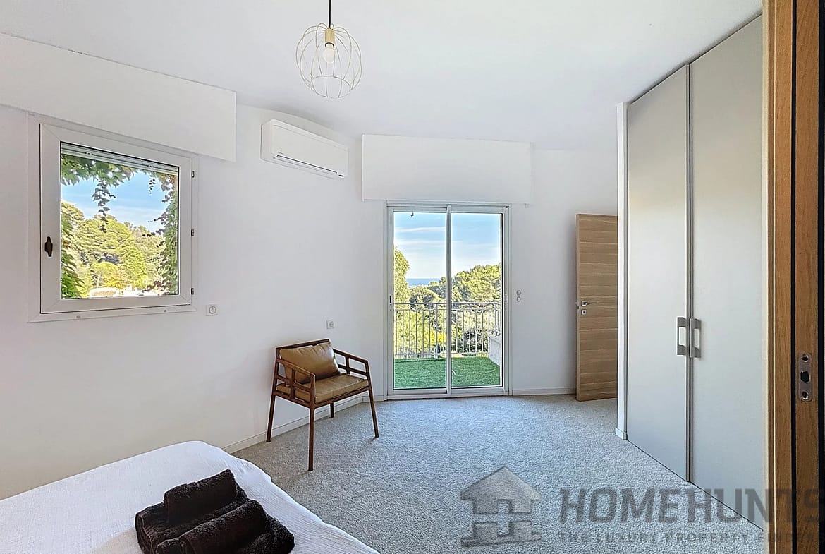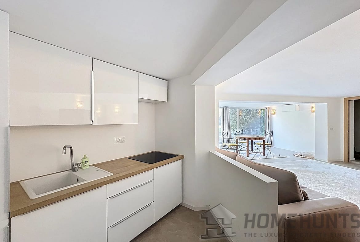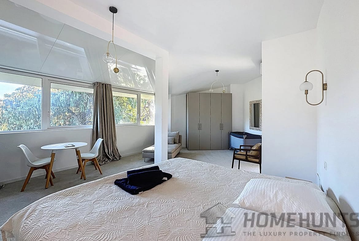 Both residences enjoy plenty of natural light with large “postcard” windows framing beautiful garden views as well as a glimpse of the sea from certain rooms. The main villa features three spacious bedrooms, each with its own en-suite bathroom, alongside generous living areas.