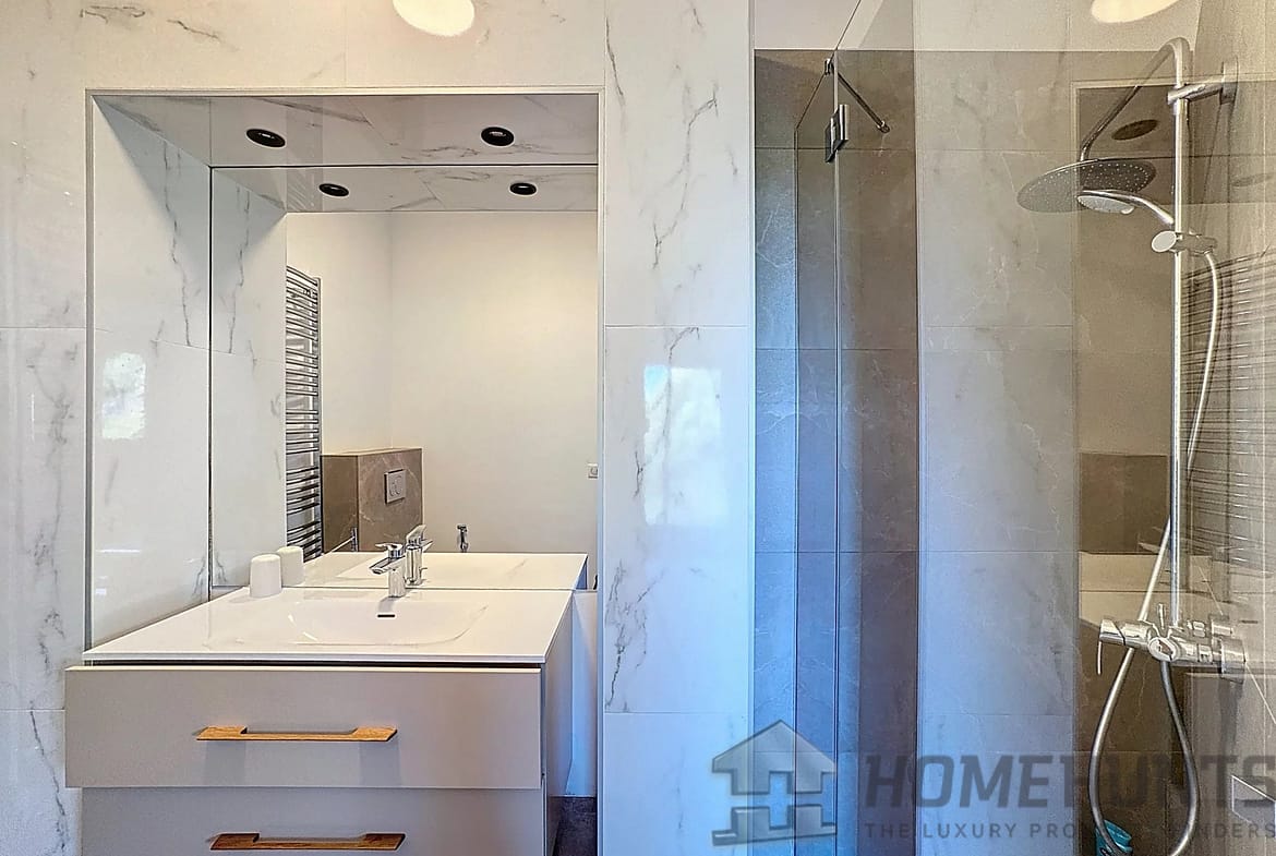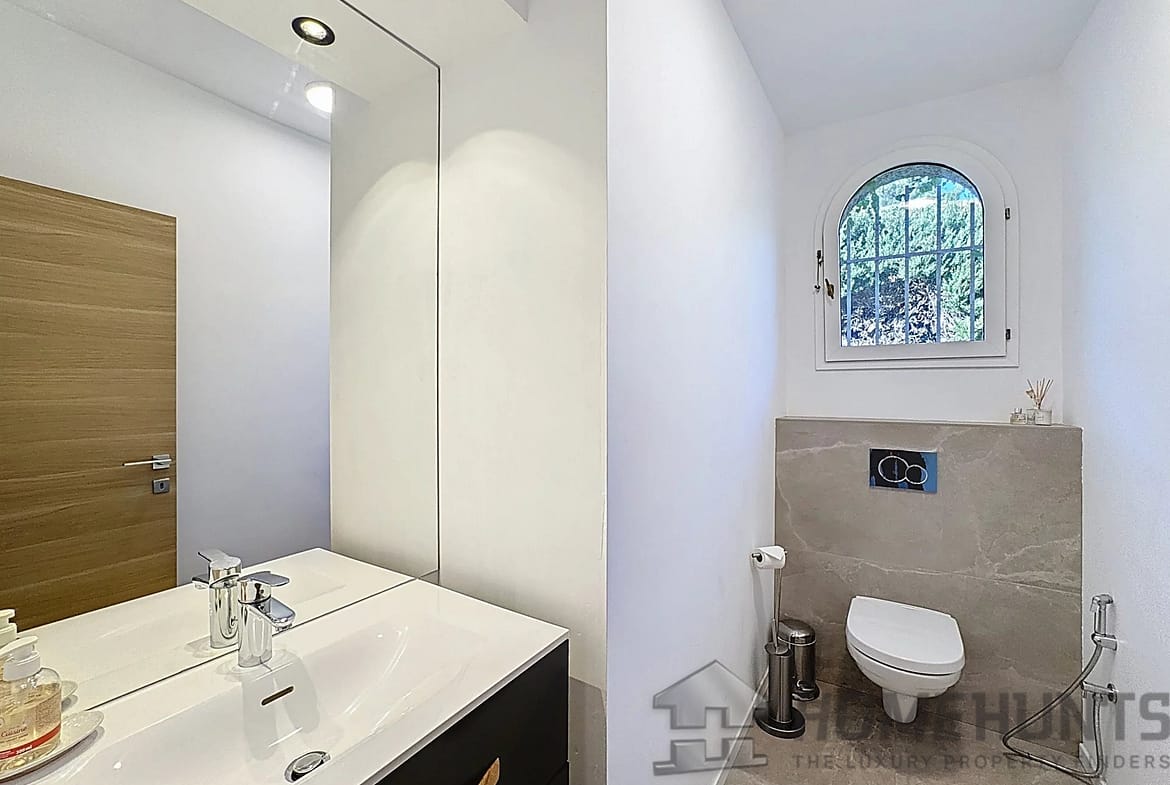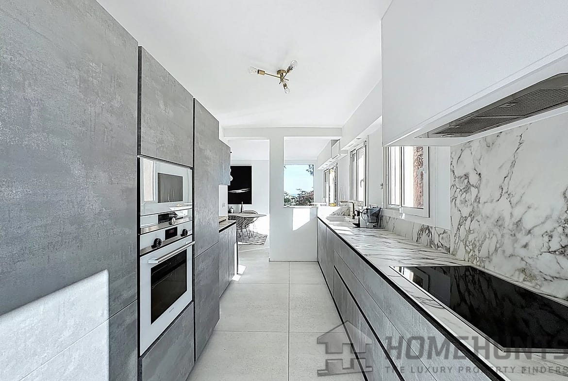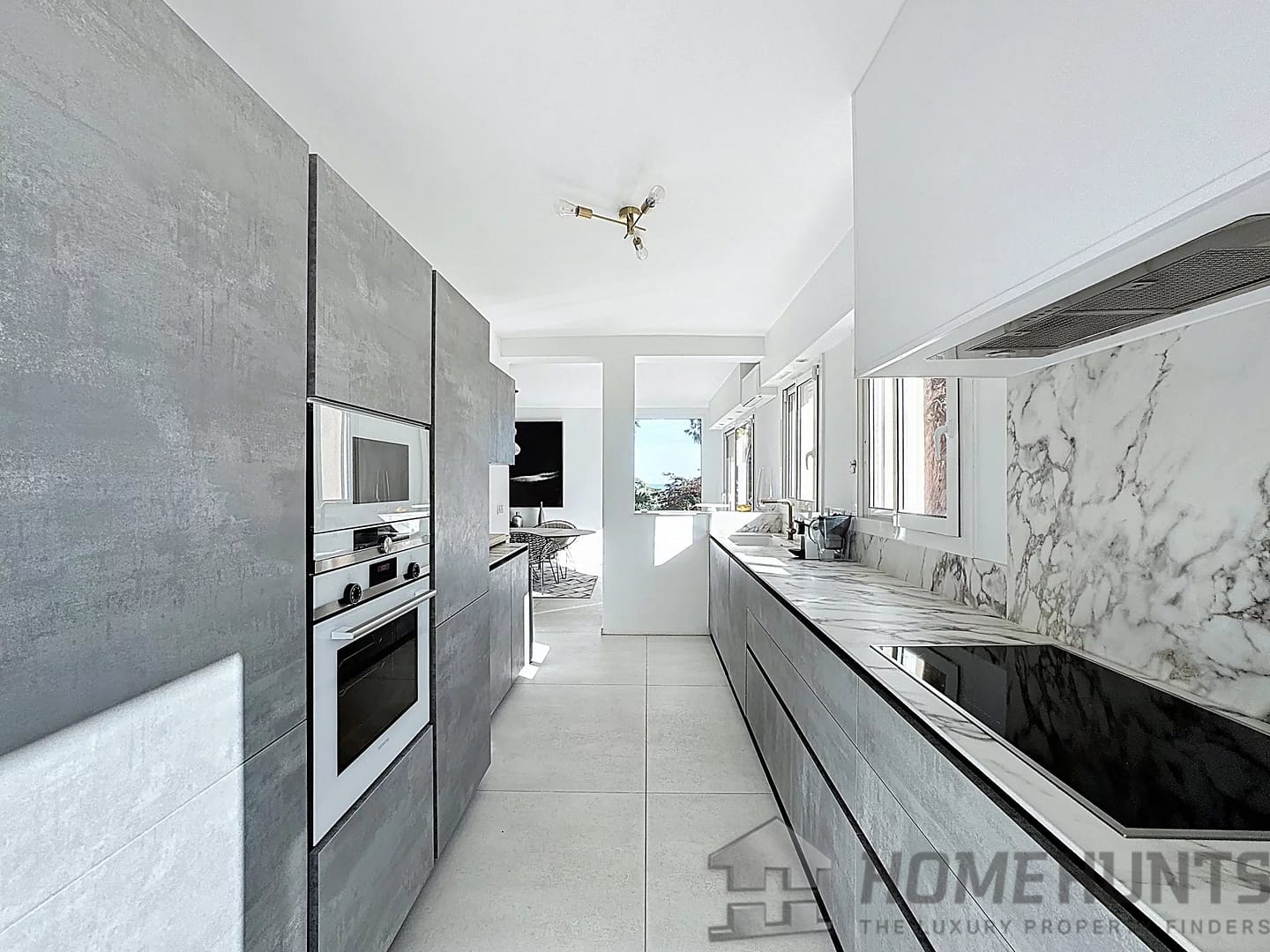 Both residences enjoy plenty of natural light with large “postcard” windows framing beautiful garden views as well as a glimpse of the sea from certain rooms. The main villa features three spacious bedrooms, each with its own en-suite bathroom, alongside generous living areas.