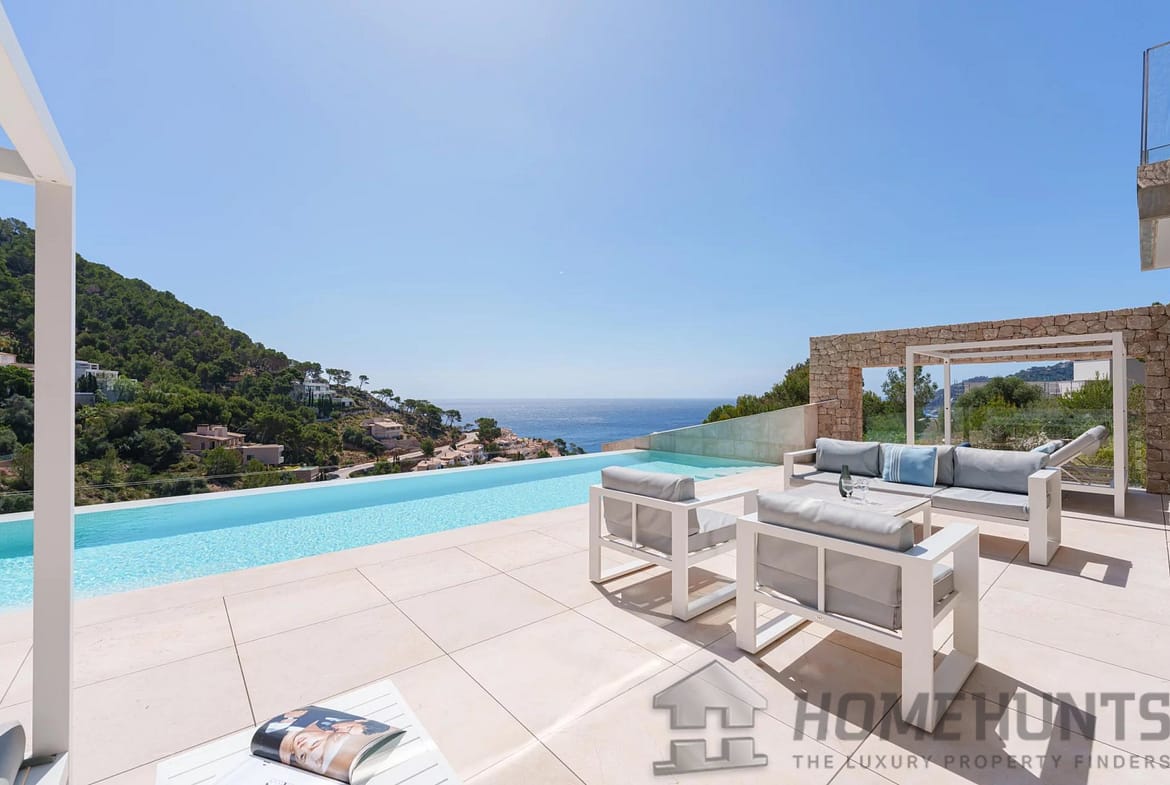 The property stands out for its impressive architectural design and glass faíçade facing the sea, ensuring maximum natural light and sea views from every room. Upon driving into the private garage, you have both elevator and stair access to the lower floors. The second level includes three bedrooms, each with ensuite bathrooms. The third level is dedicated entirely to daily living. The fully fitted kitchen and dining room flow effortlessly into the living room, which has direct access to the outdoor lounge with a cosy fireplace, terrace, and pool area. The lower level includes a home cinema and private gym. Built using only the highest quality materials, the villa features central air conditioning, underfloor heating, an osmosis system, and home automation.