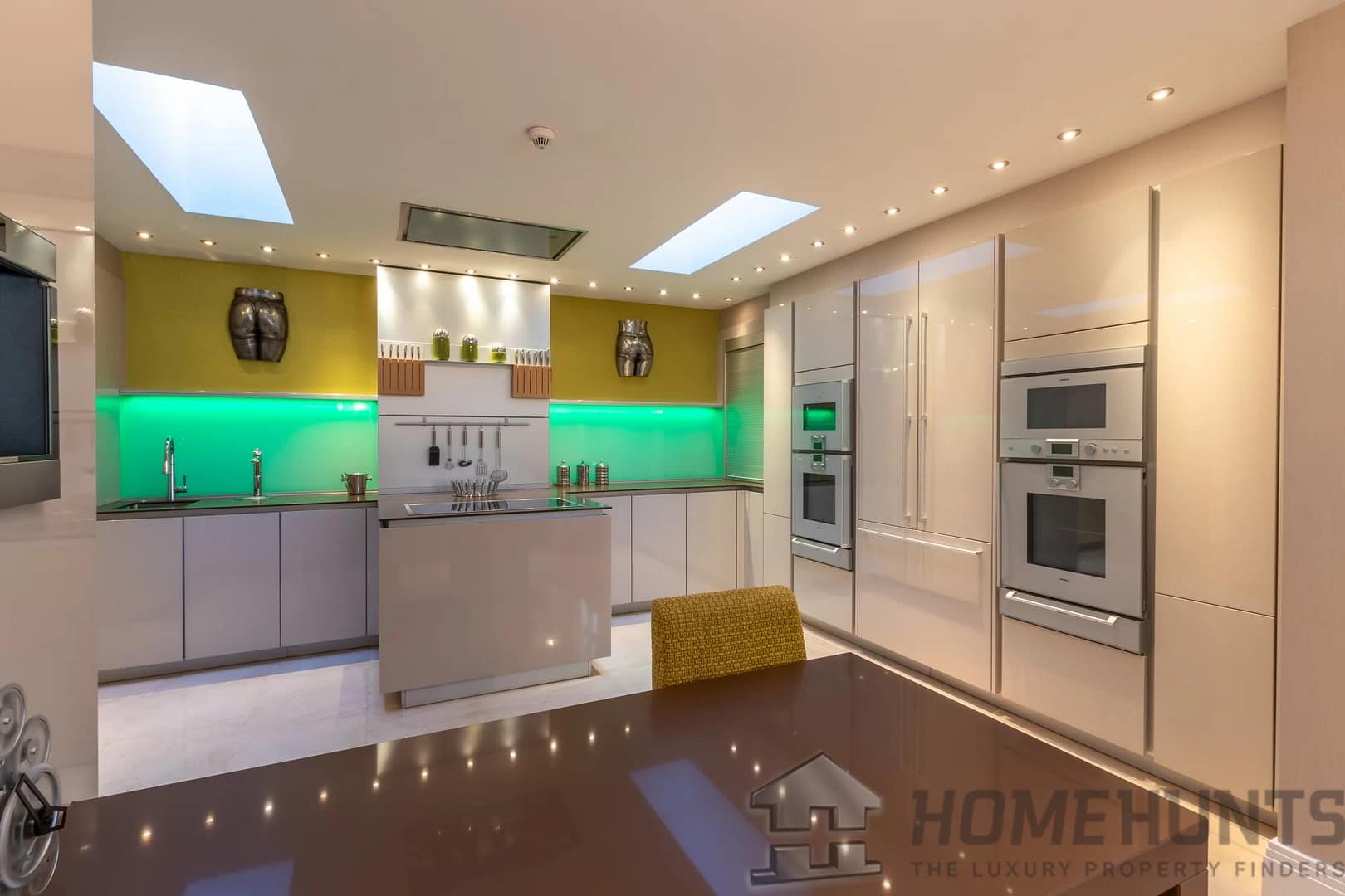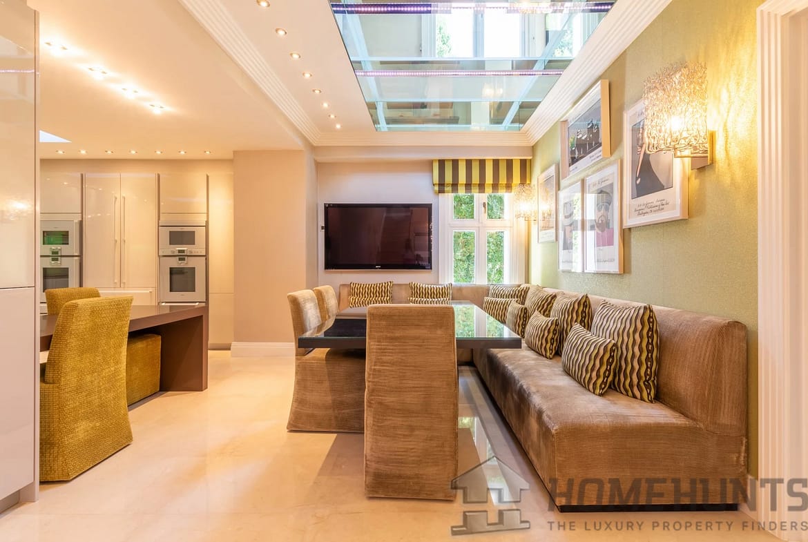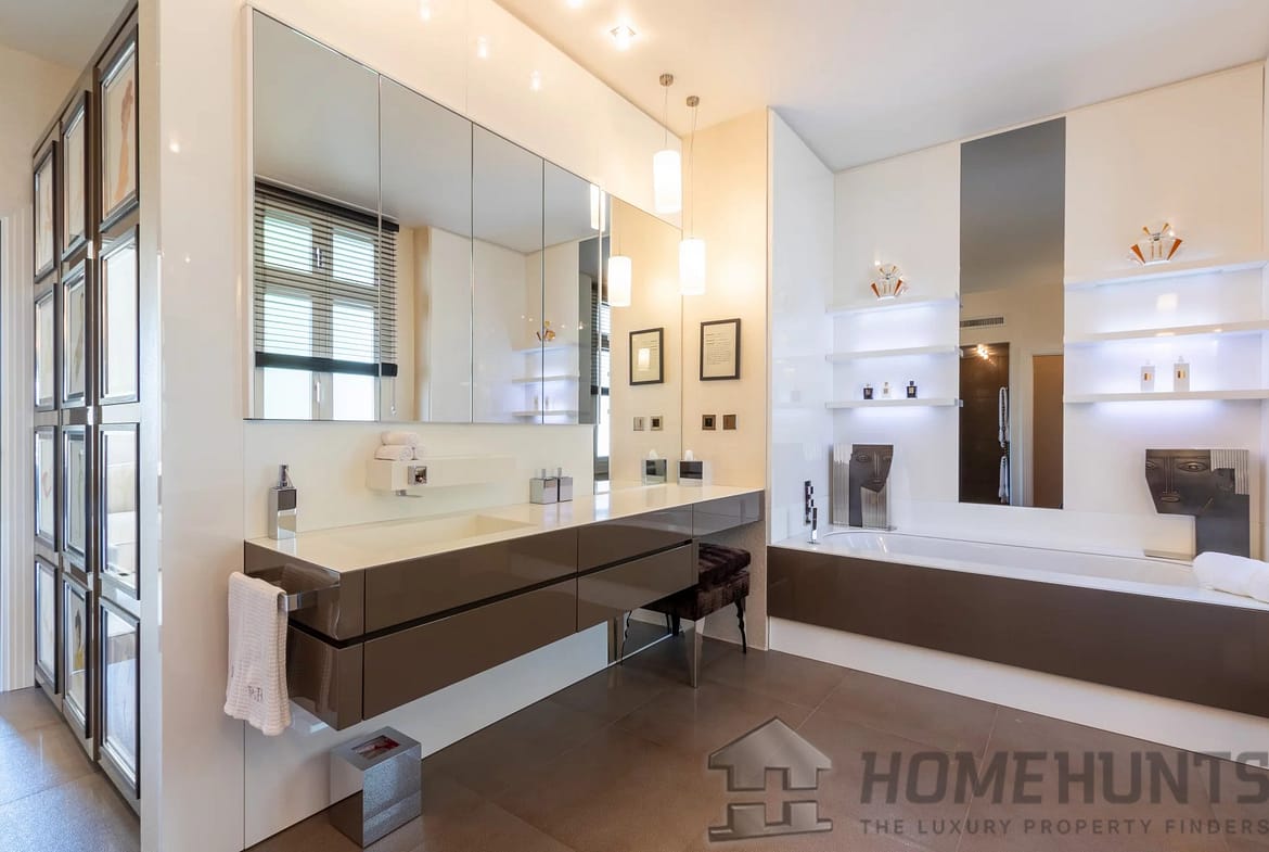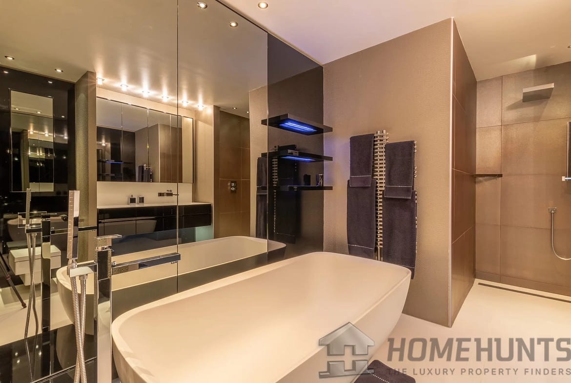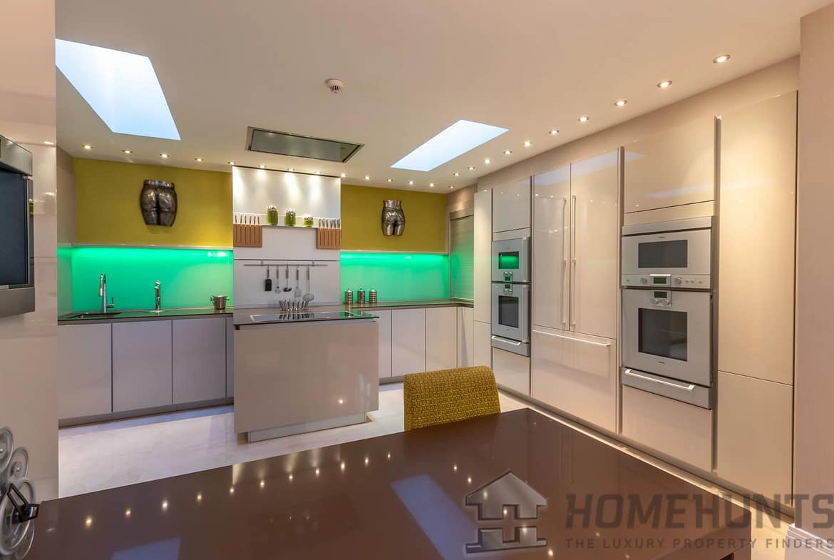 The kitchen was designed by Nicholas Anthony of Knightsbridge and is fitted with Poggenpohl units with electrically operated drawers and remote controlled color changing panels and Gaggenau appliances.