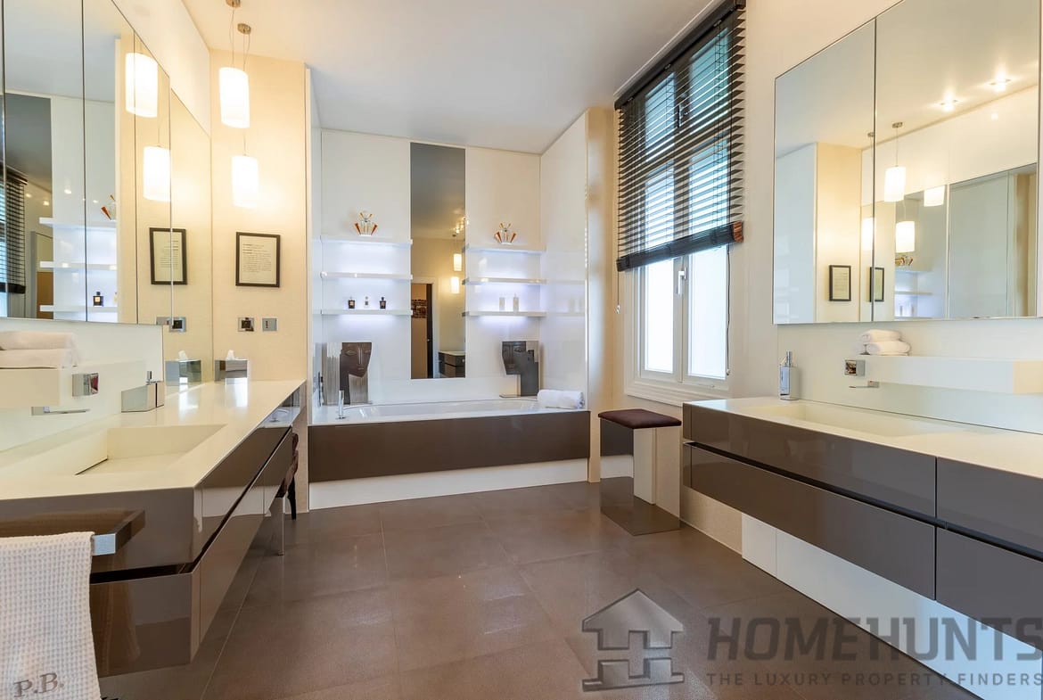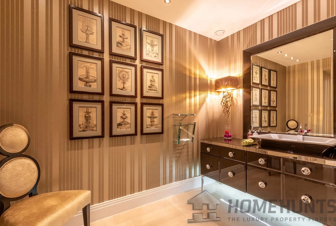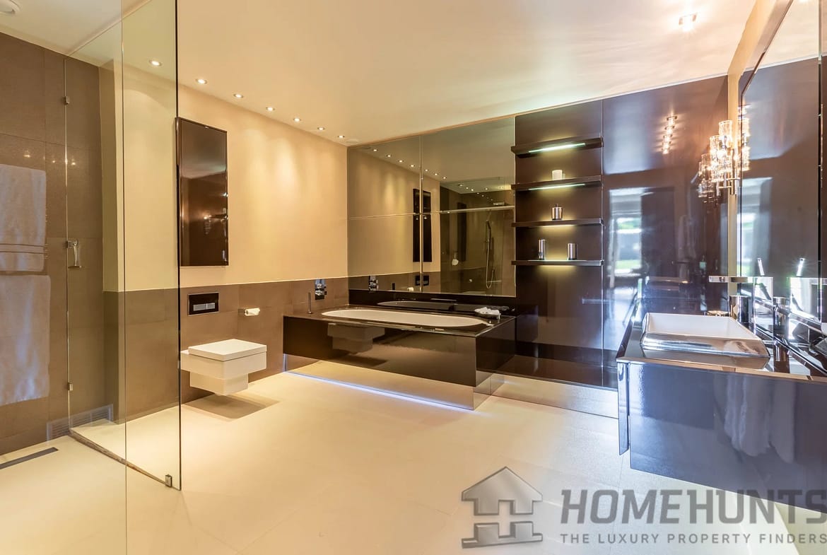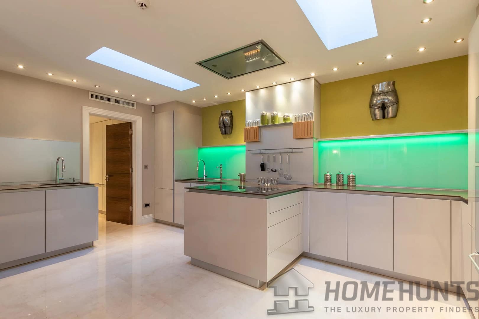 The kitchen was designed by Nicholas Anthony of Knightsbridge and is fitted with Poggenpohl units with electrically operated drawers and remote controlled color changing panels and Gaggenau appliances.