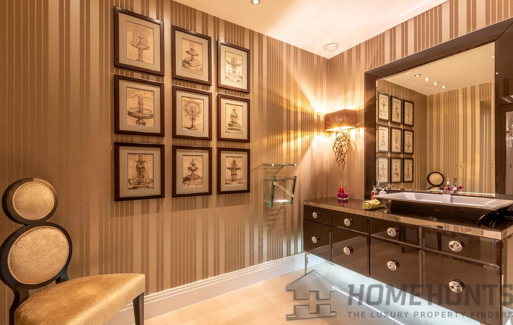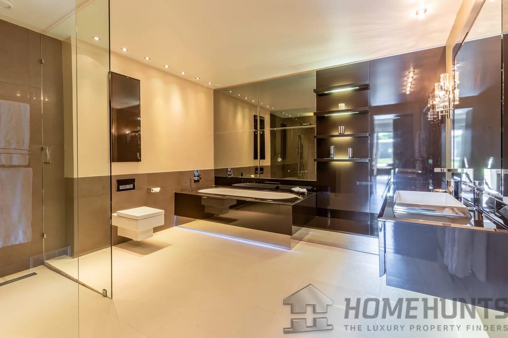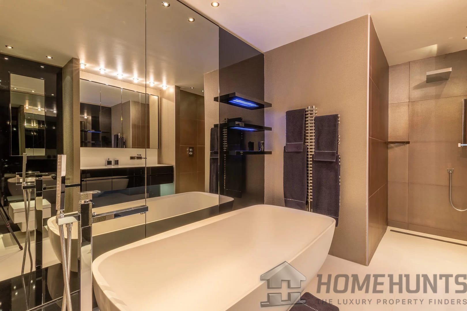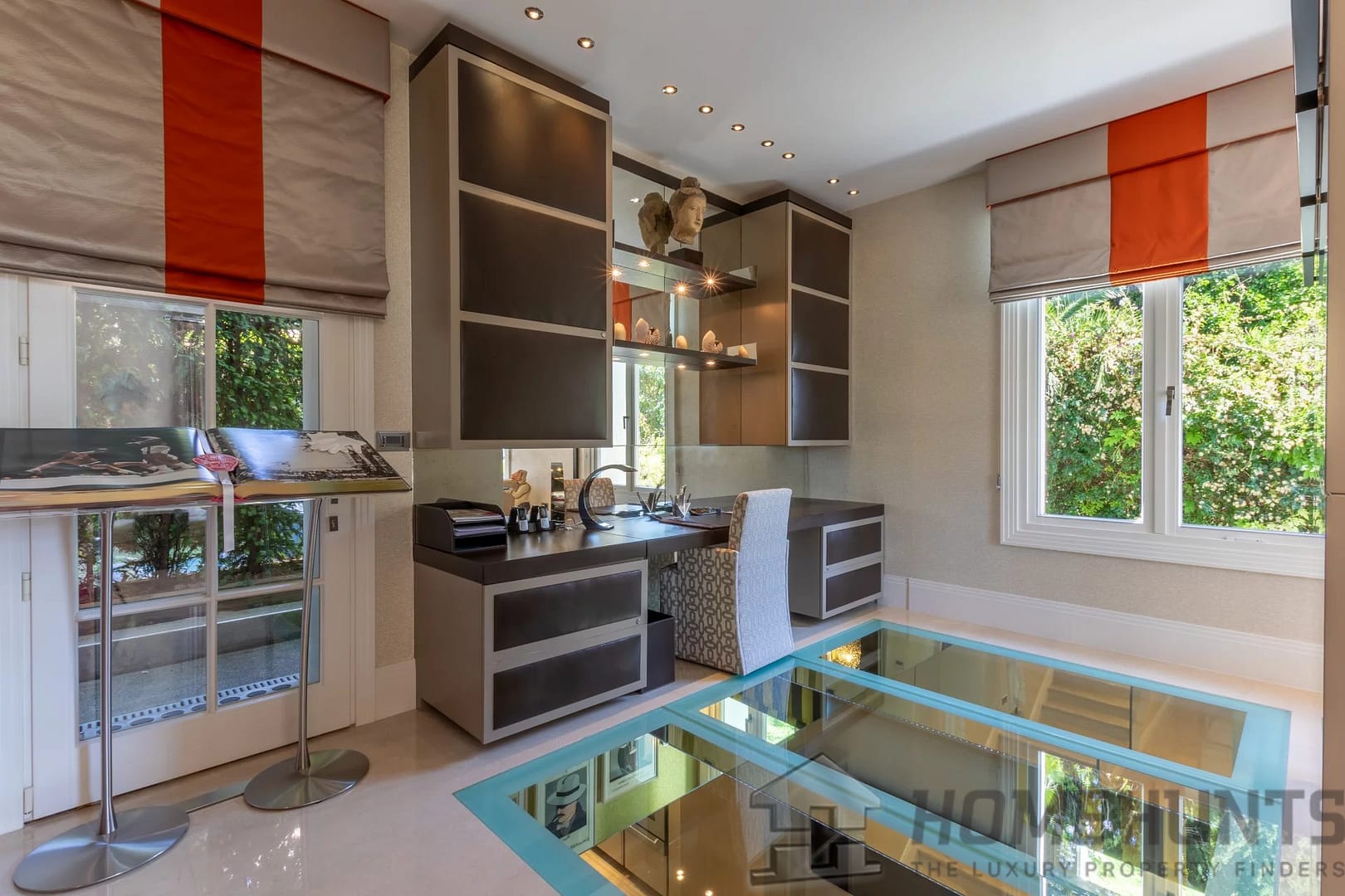 The kitchen was designed by Nicholas Anthony of Knightsbridge and is fitted with Poggenpohl units with electrically operated drawers and remote controlled color changing panels and Gaggenau appliances.