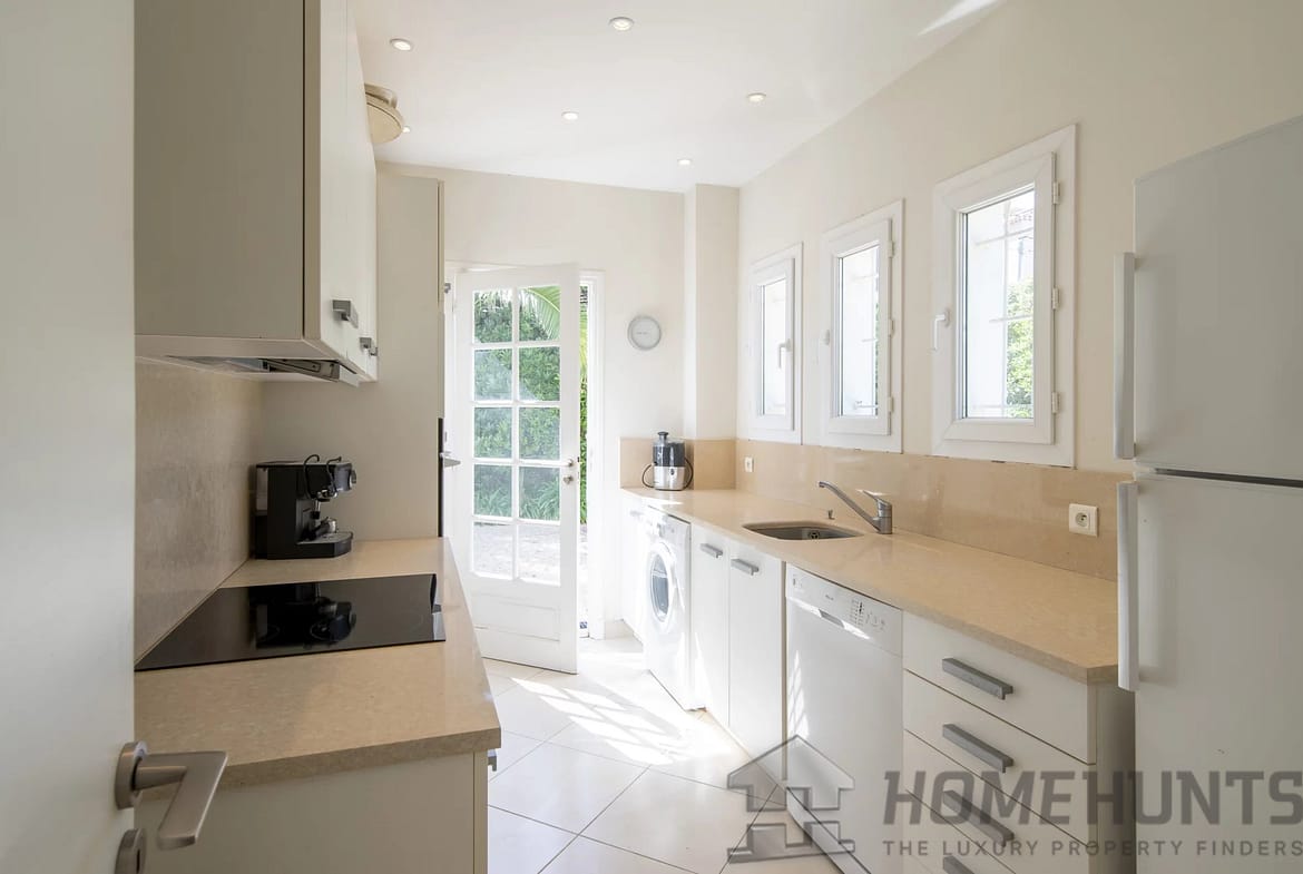 The villa features an entrance hall, a reception room opening onto the terrace and the garden, a dining room and a separate kitchen on the ground floor.