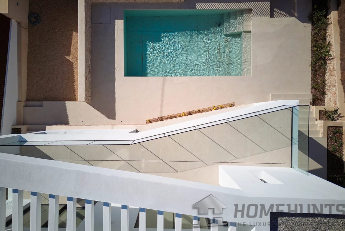 Upstairs, there are two bedrooms, each with en suite bathrooms and access to a spacious terrace that offers breathtaking views of the sea and pool. One bedroom includes fitted closets, while the master bedroom boasts a dressing room.