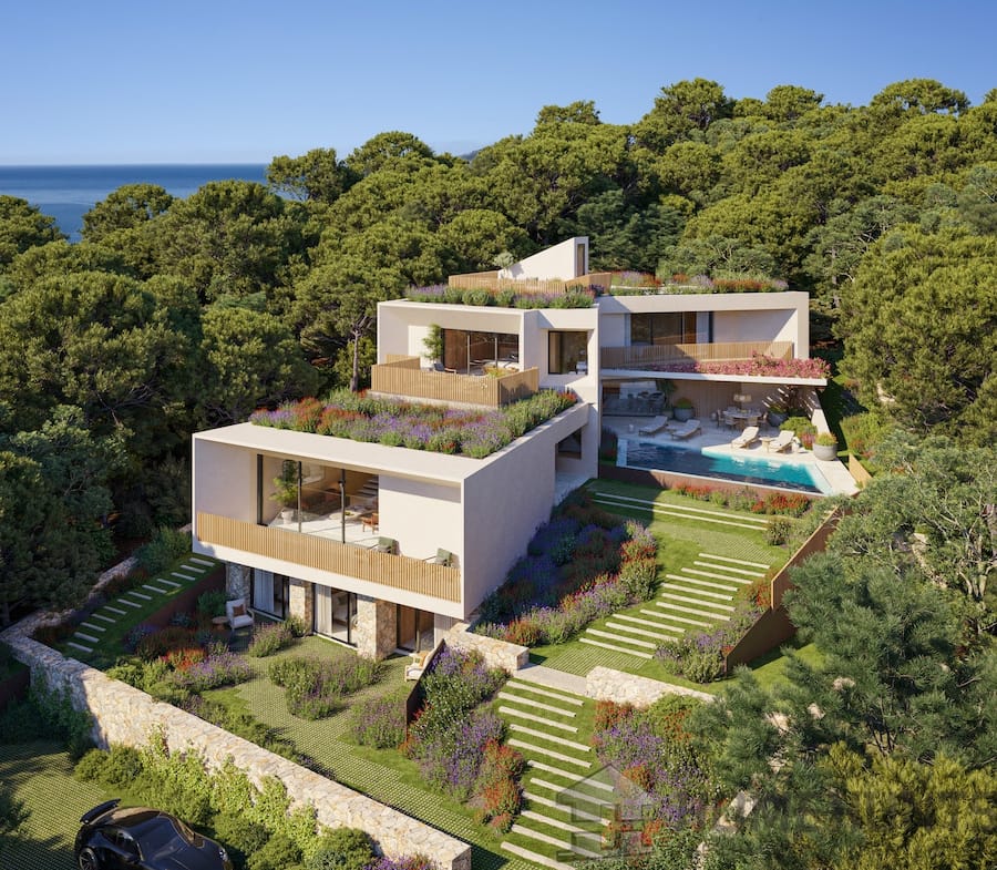 The existing stone walls have been carefully restored, emphasizing the ascending path that guides you up to the villa. Its design is structured around a split longitudinal axis, where several lines of force converge at a vanishing point, creating an architectural language that draws you in from the moment you arrive.