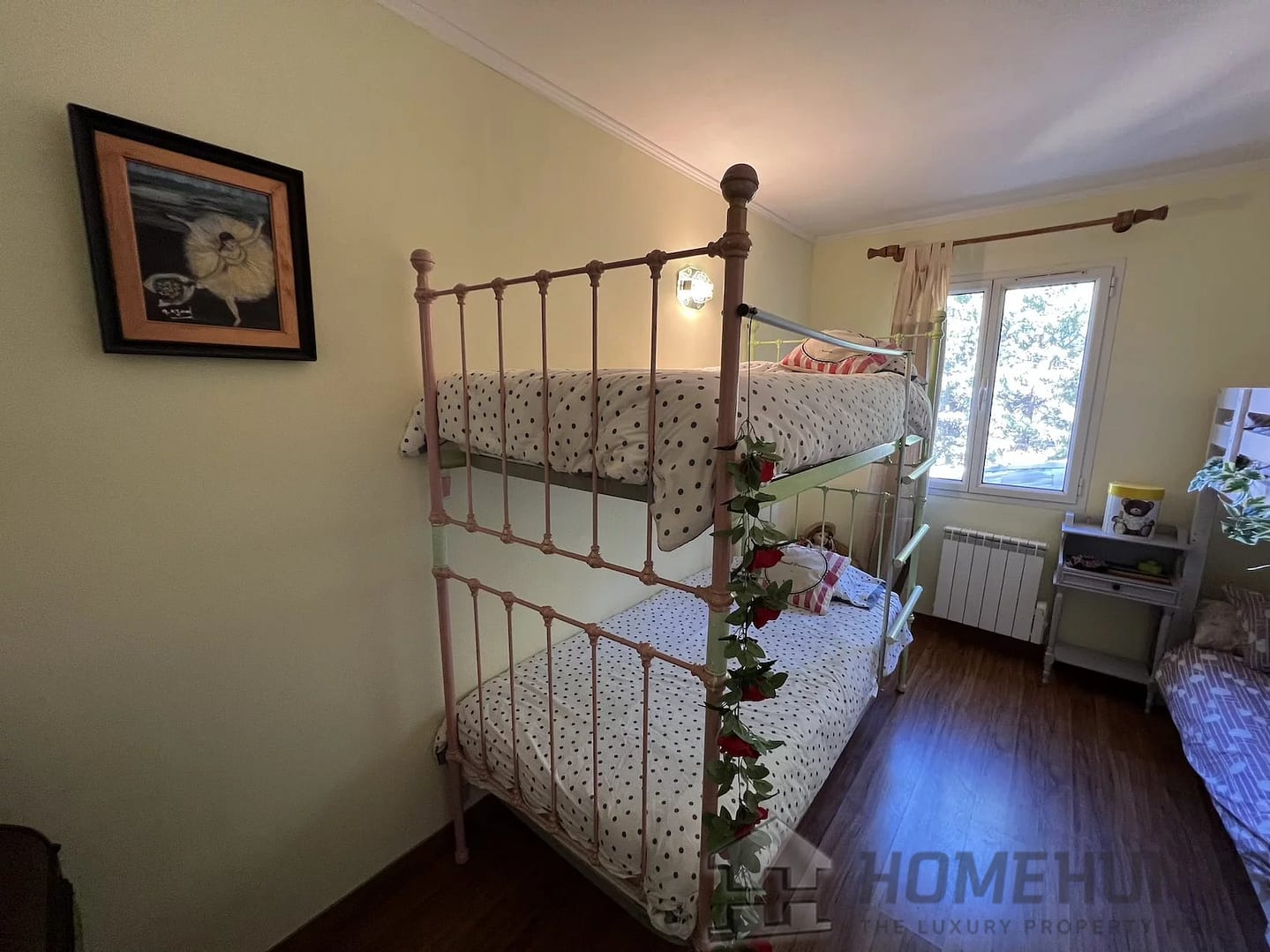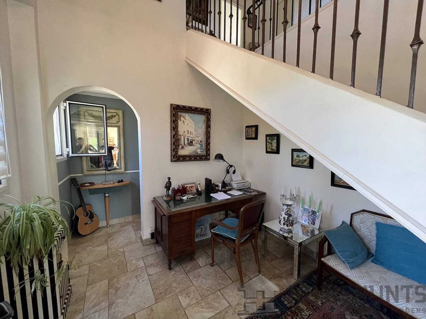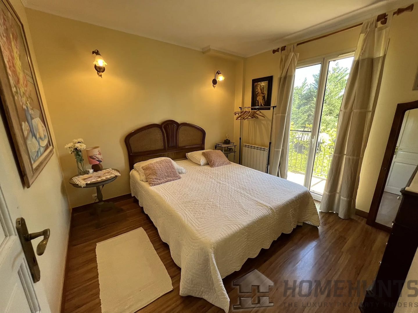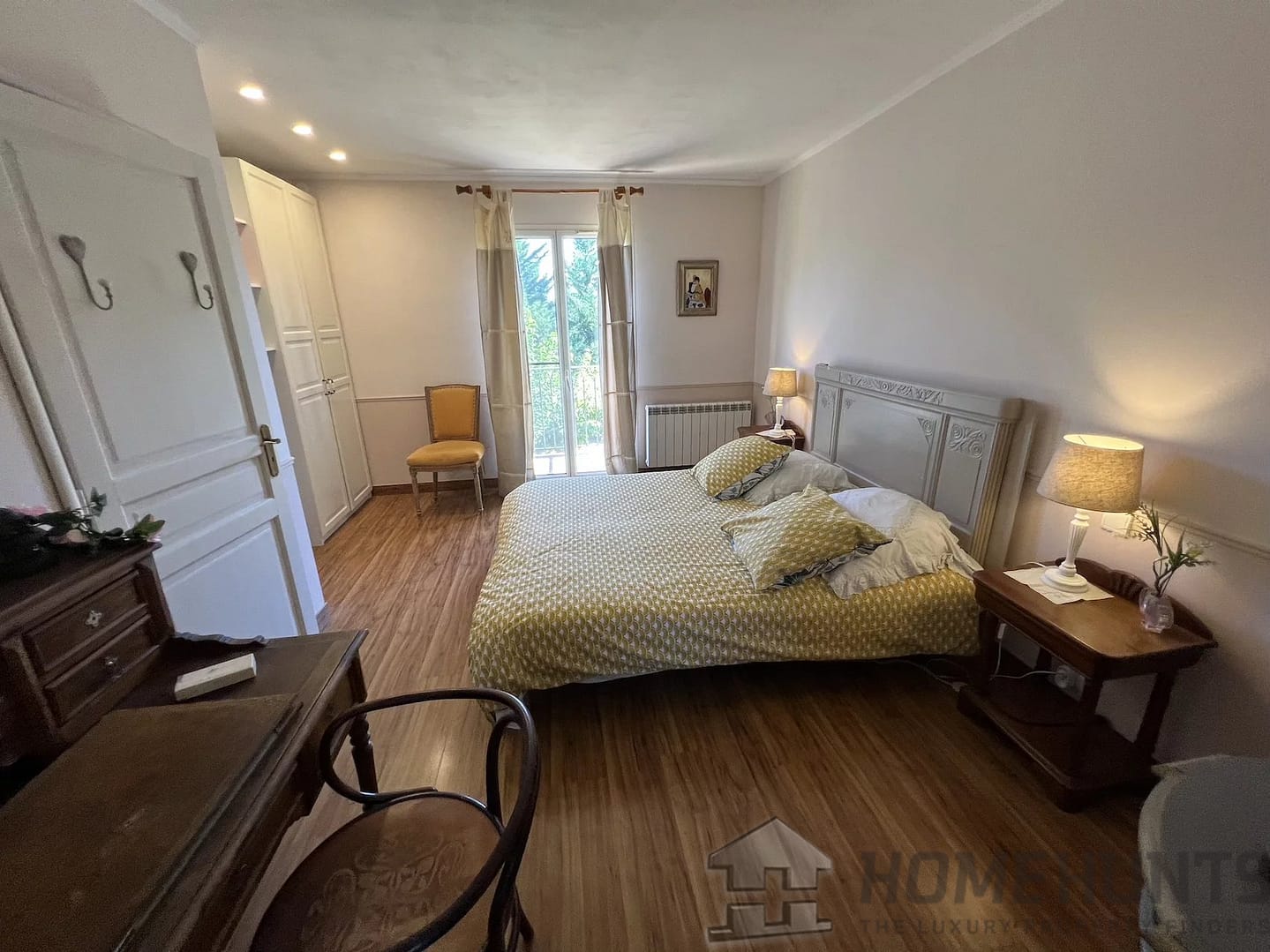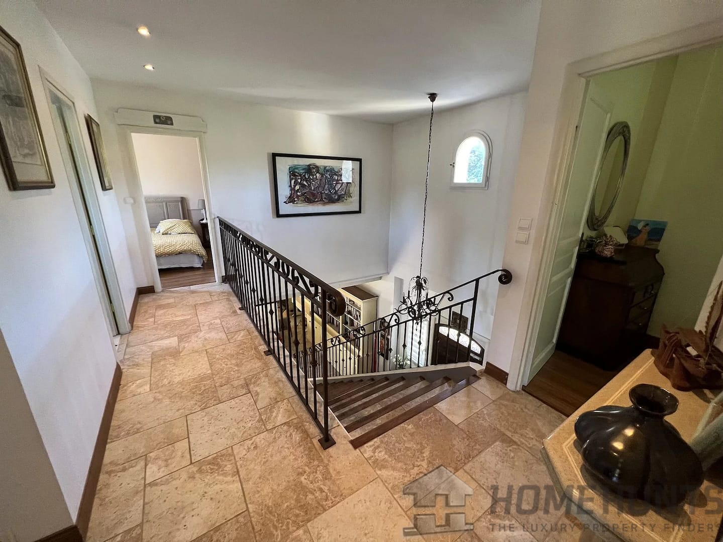 Upstairs : 1 spacious bedroom, opening on a balcony terrace on the south with a dominant view on the garden, with cupboards and private bathroom. 2 other bedrooms, one also with a south balcony, shower room, toilet.