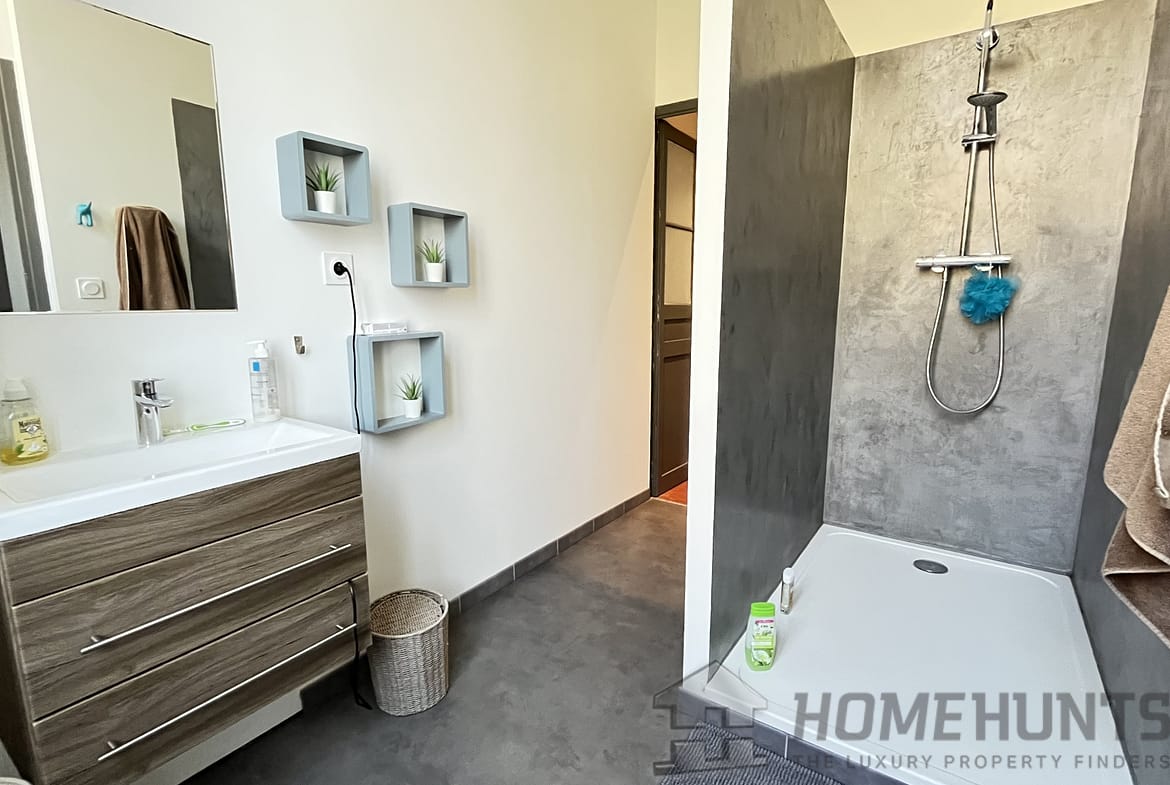 On the garden level there is a large living room, a modern kitchen opening onto the dining room, a large master bedroom with adjoining bathroom, as well as a laundry room.