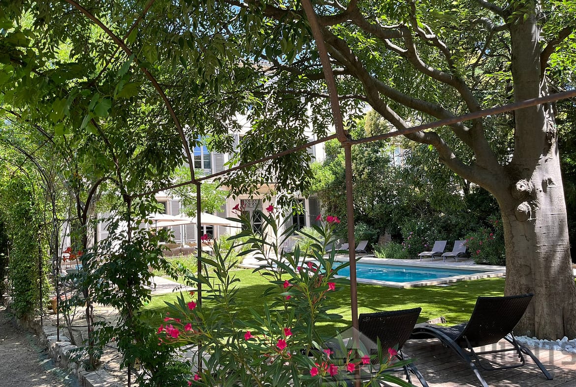 The garden is subtly landscaped with a heated swimming pool and a shaded terrace.