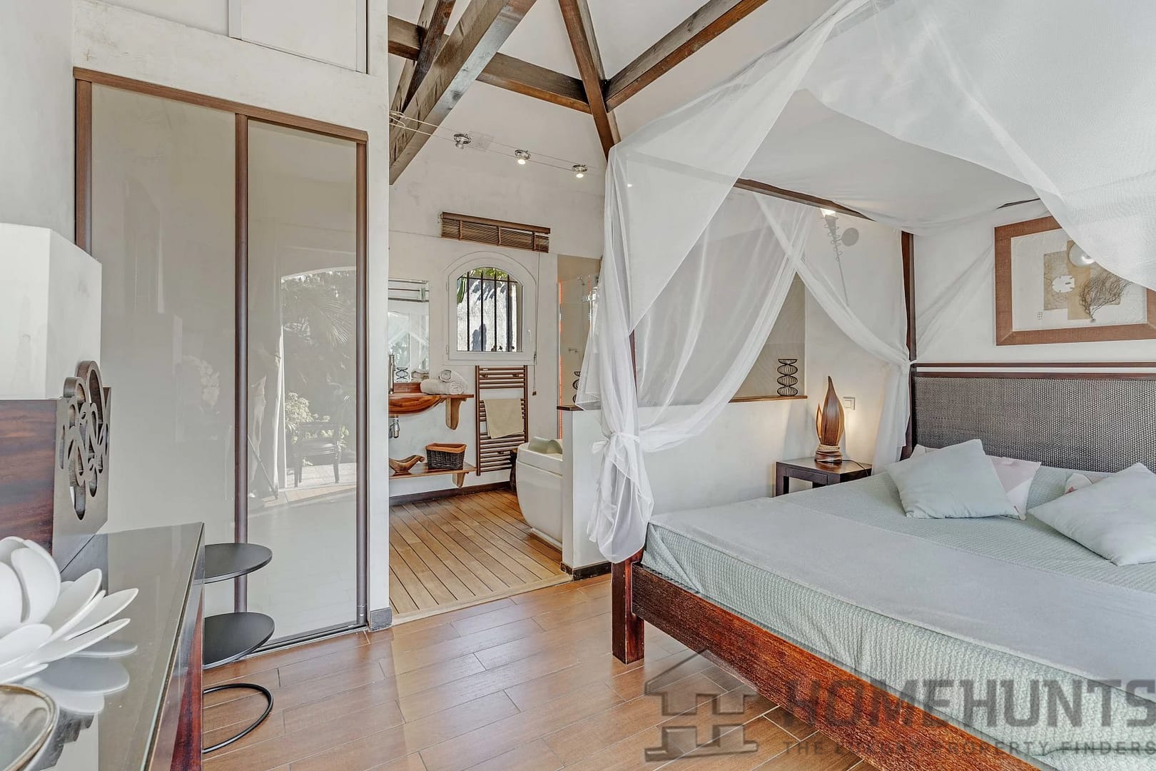 The villa opens onto a bright, open-plan living area with a modern kitchen, designed for elegant and convivial entertaining. It features seven bedrooms, all with their own en-suite bathrooms, including an independent apartment ideal for hosting guests or for rental use.