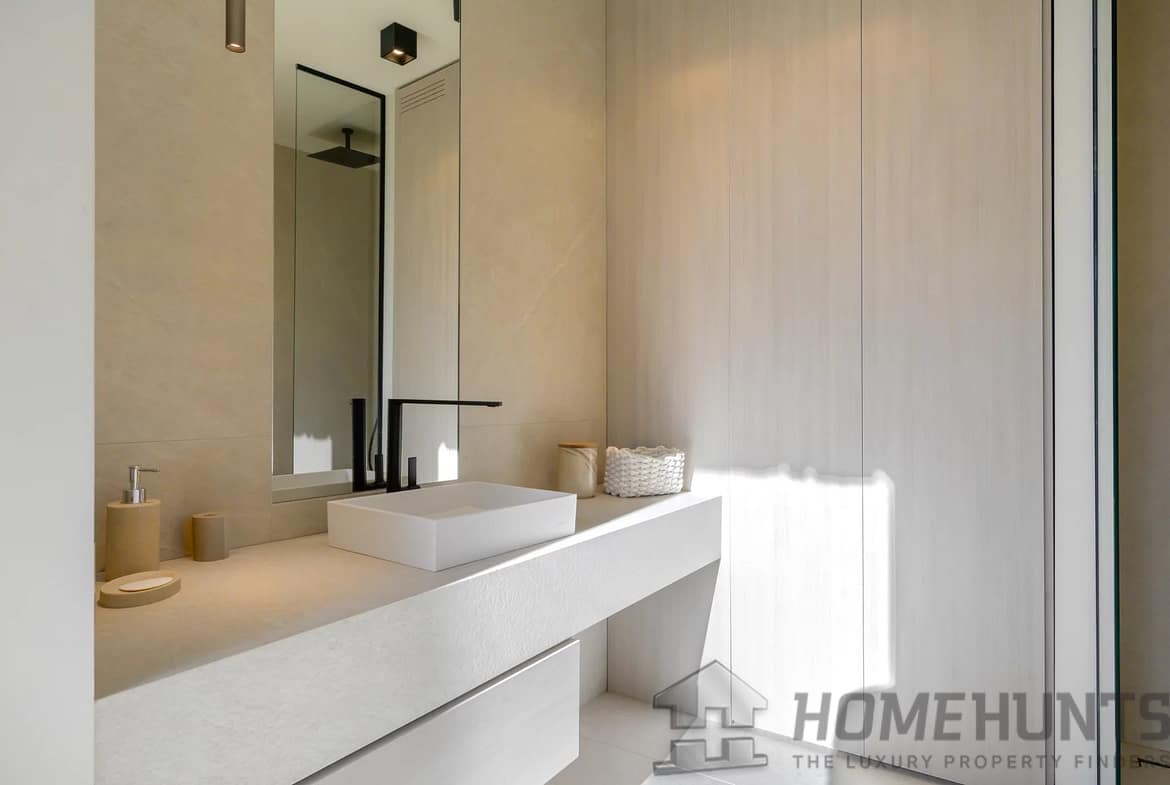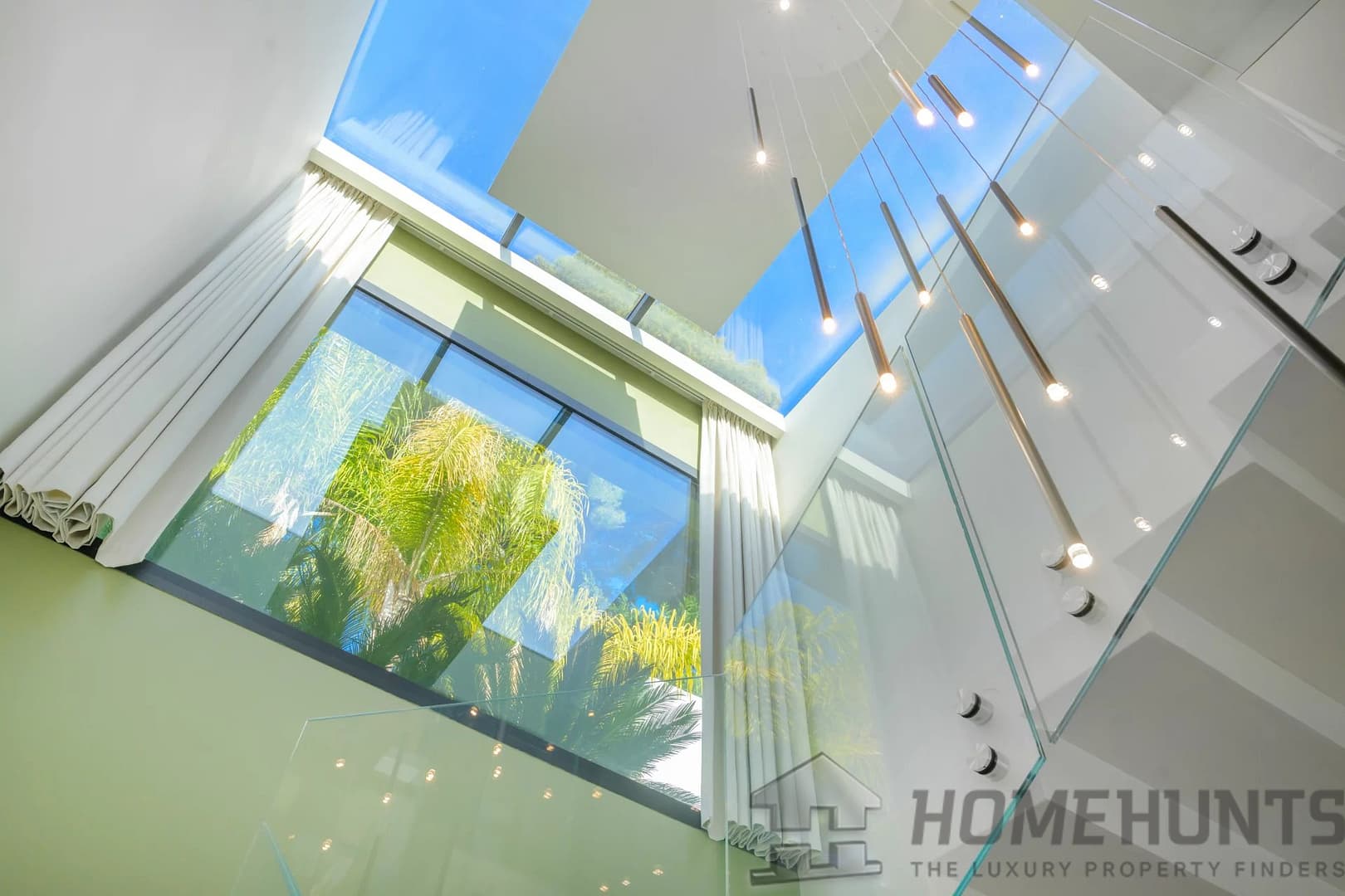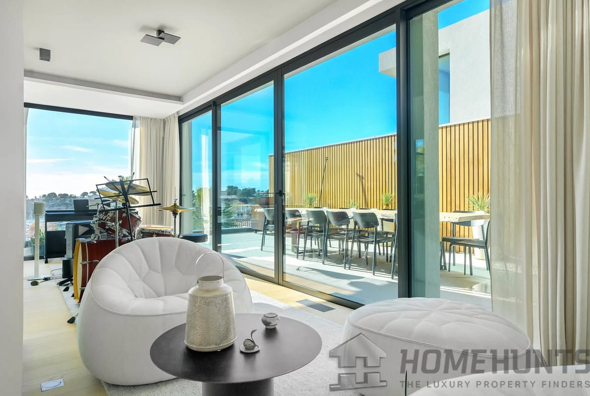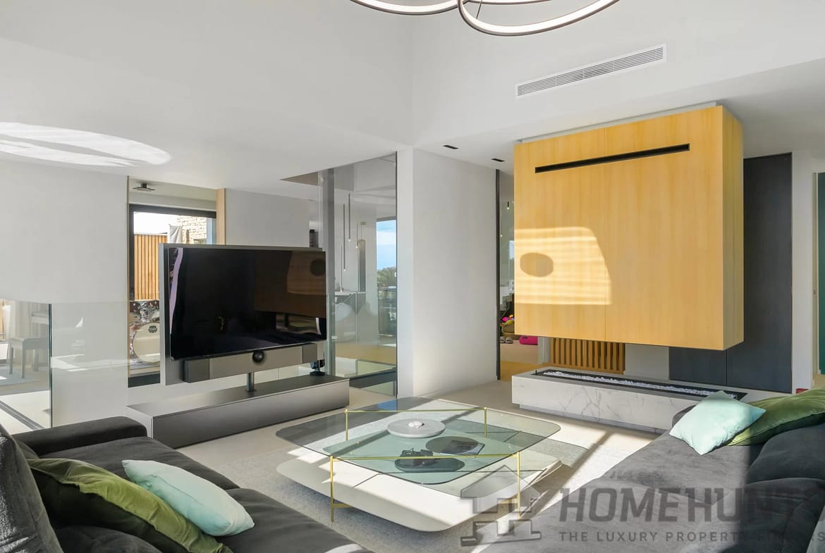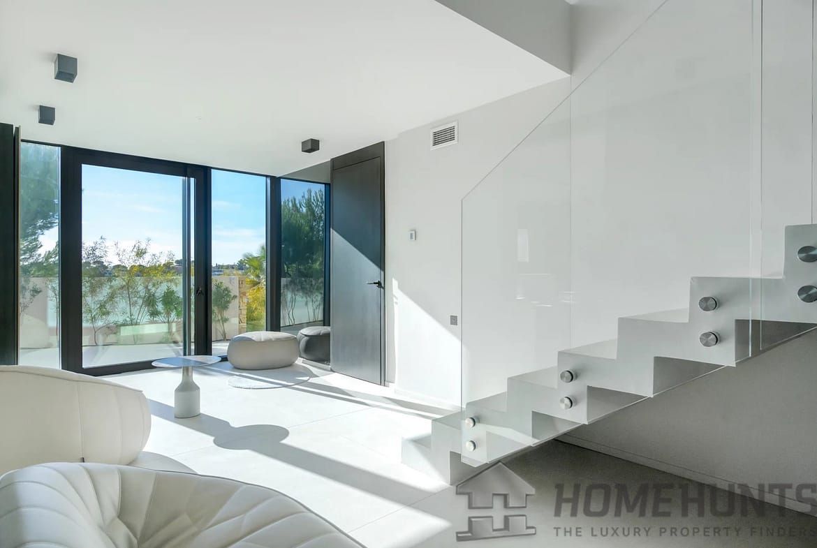 Once inside this stunning family home you are welcomed by a majestic entrance hall featuring a glass elevator shaft. This level includes a private office with a porthole overlooking the pool, a fully equipped gym with a dedicated spa area featuring a jacuzzi, sauna, and shower, a state-of-the-art home cinema with a retractable screen and large TV, a games room, and a spacious 50 m2 garage.
