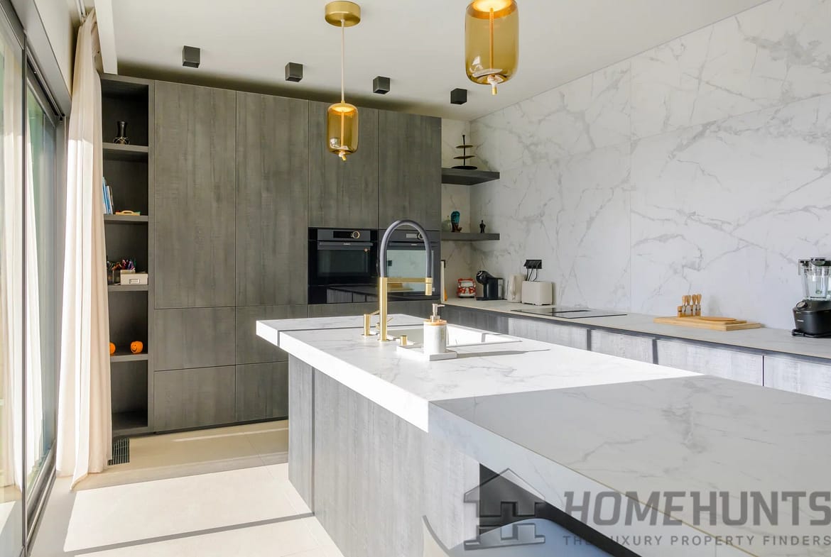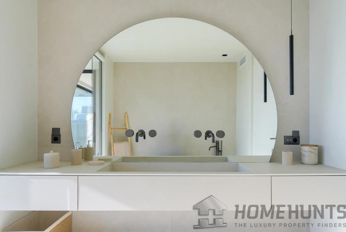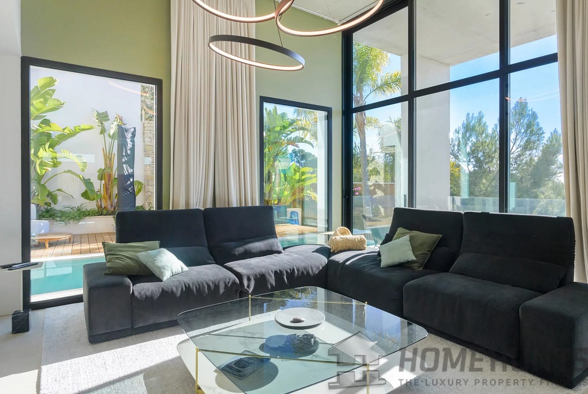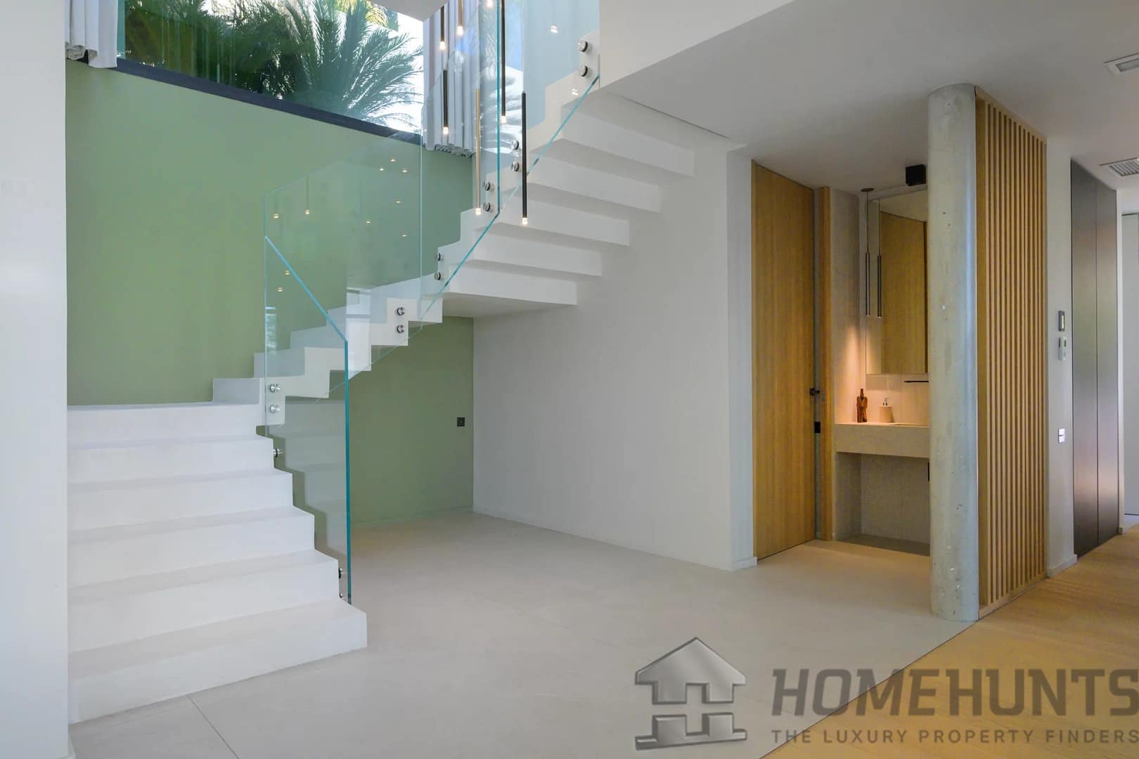 Once inside this stunning family home you are welcomed by a majestic entrance hall featuring a glass elevator shaft. This level includes a private office with a porthole overlooking the pool, a fully equipped gym with a dedicated spa area featuring a jacuzzi, sauna, and shower, a state-of-the-art home cinema with a retractable screen and large TV, a games room, and a spacious 50 m2 garage.