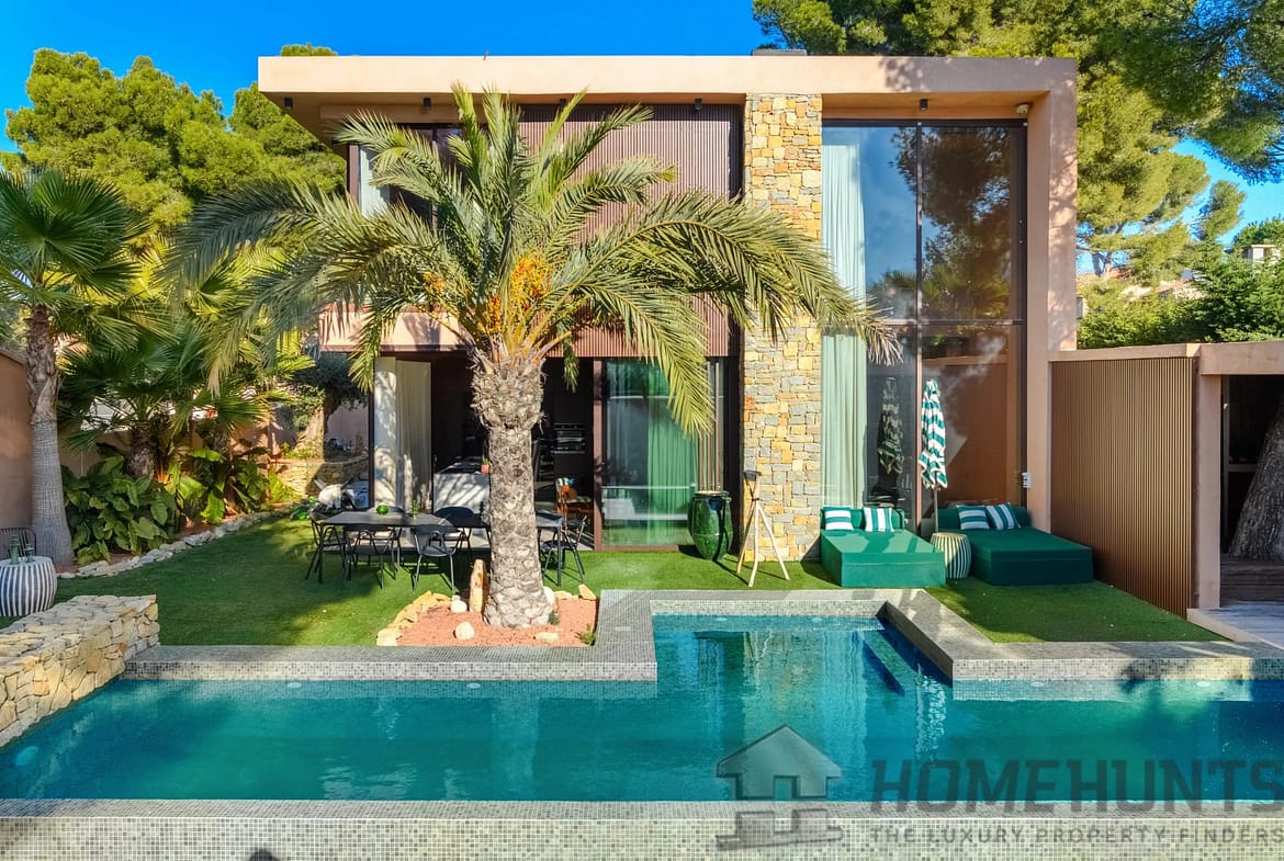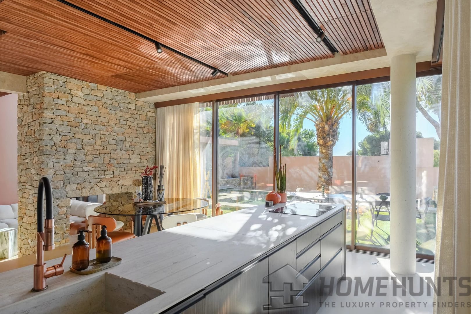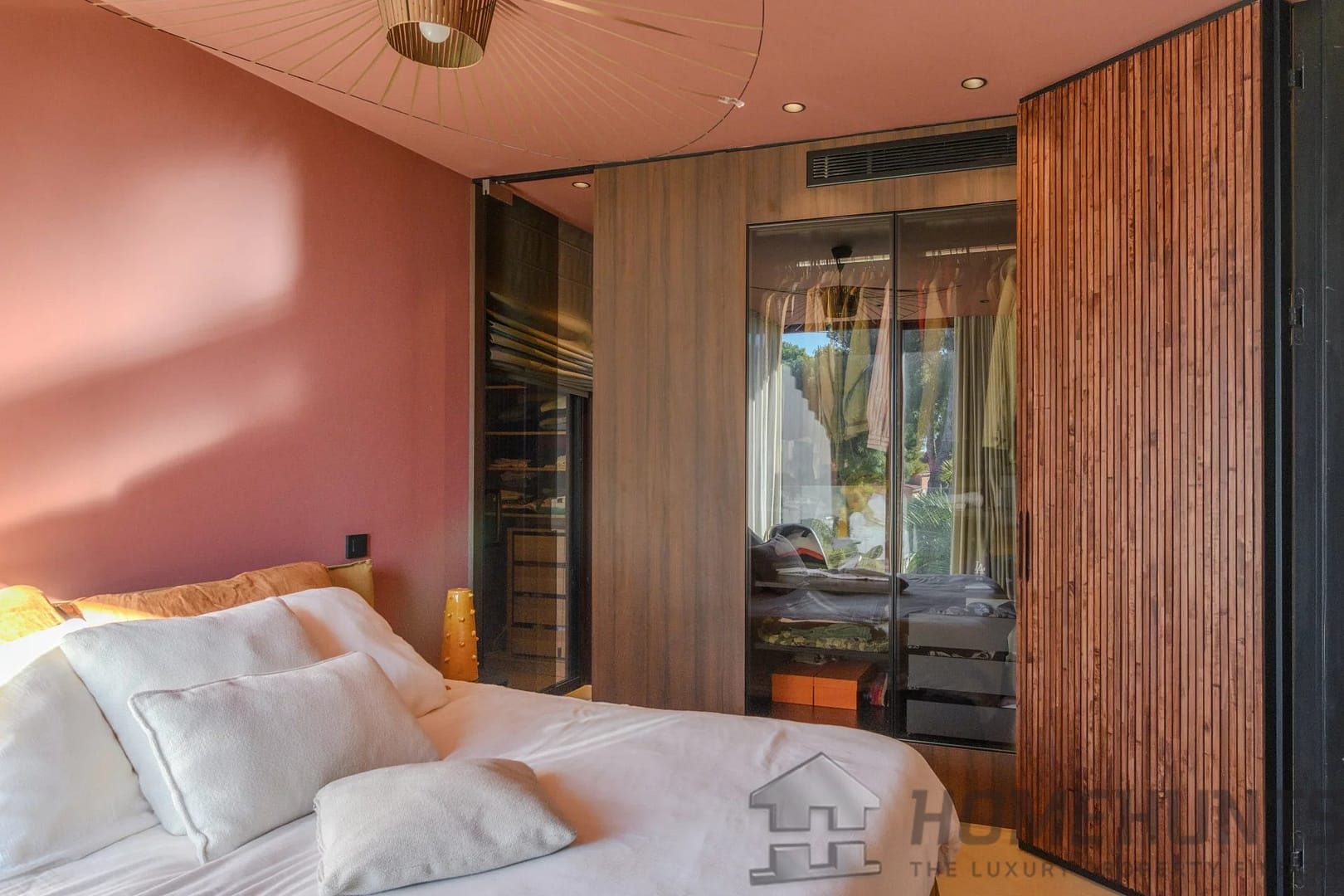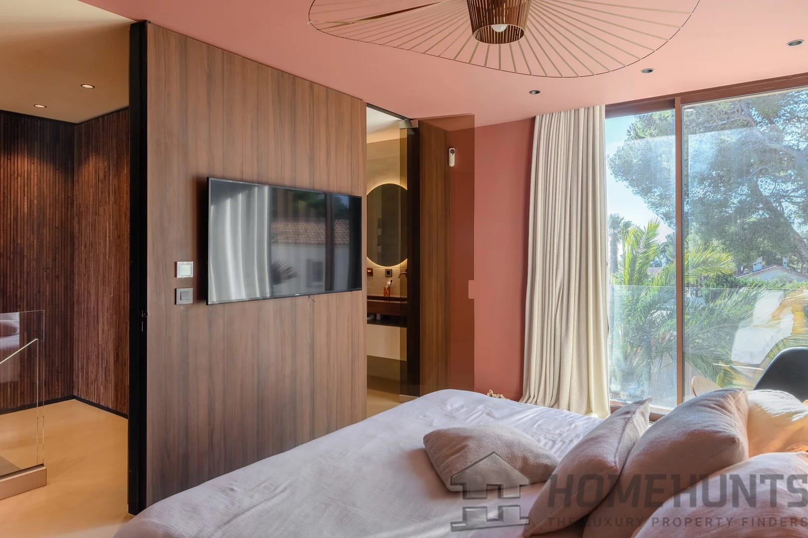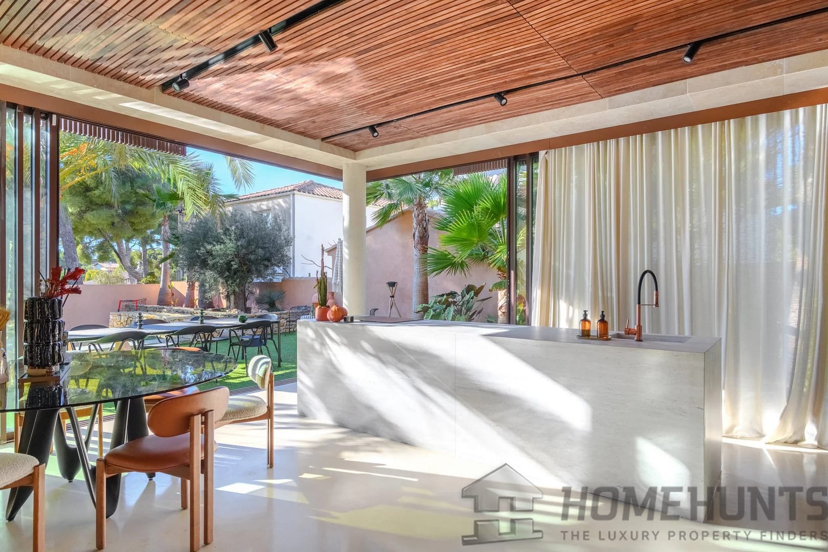 The entrance leads to a first bedroom with its own private shower room perfect for welcoming guests along with a laundry room and guest toilet. A few steps down, the home opens onto a stunning living area where floor-to-ceiling bay windows blur the lines between indoor and outdoor living, overlooking the landscaped garden and swimming pool.