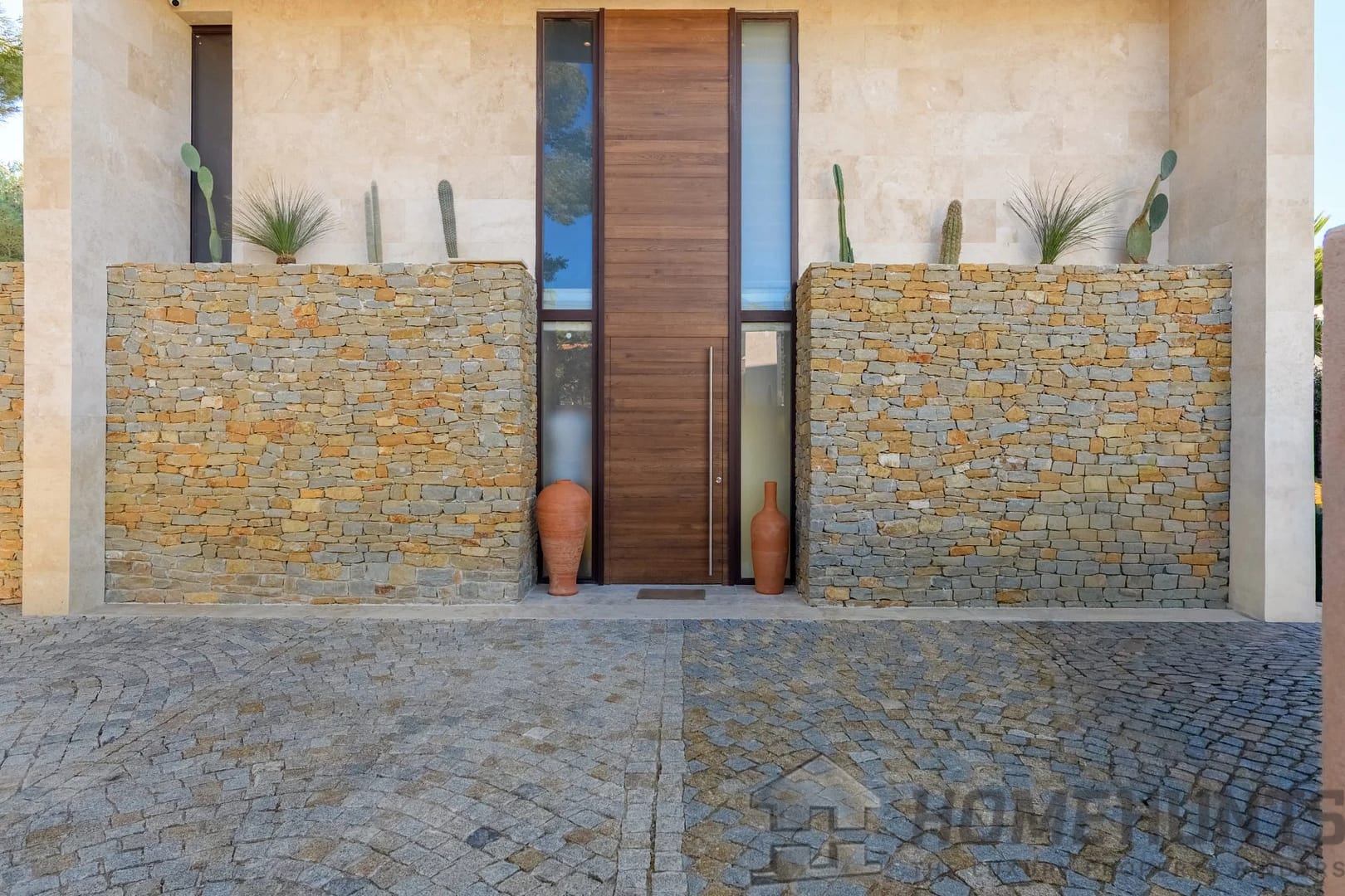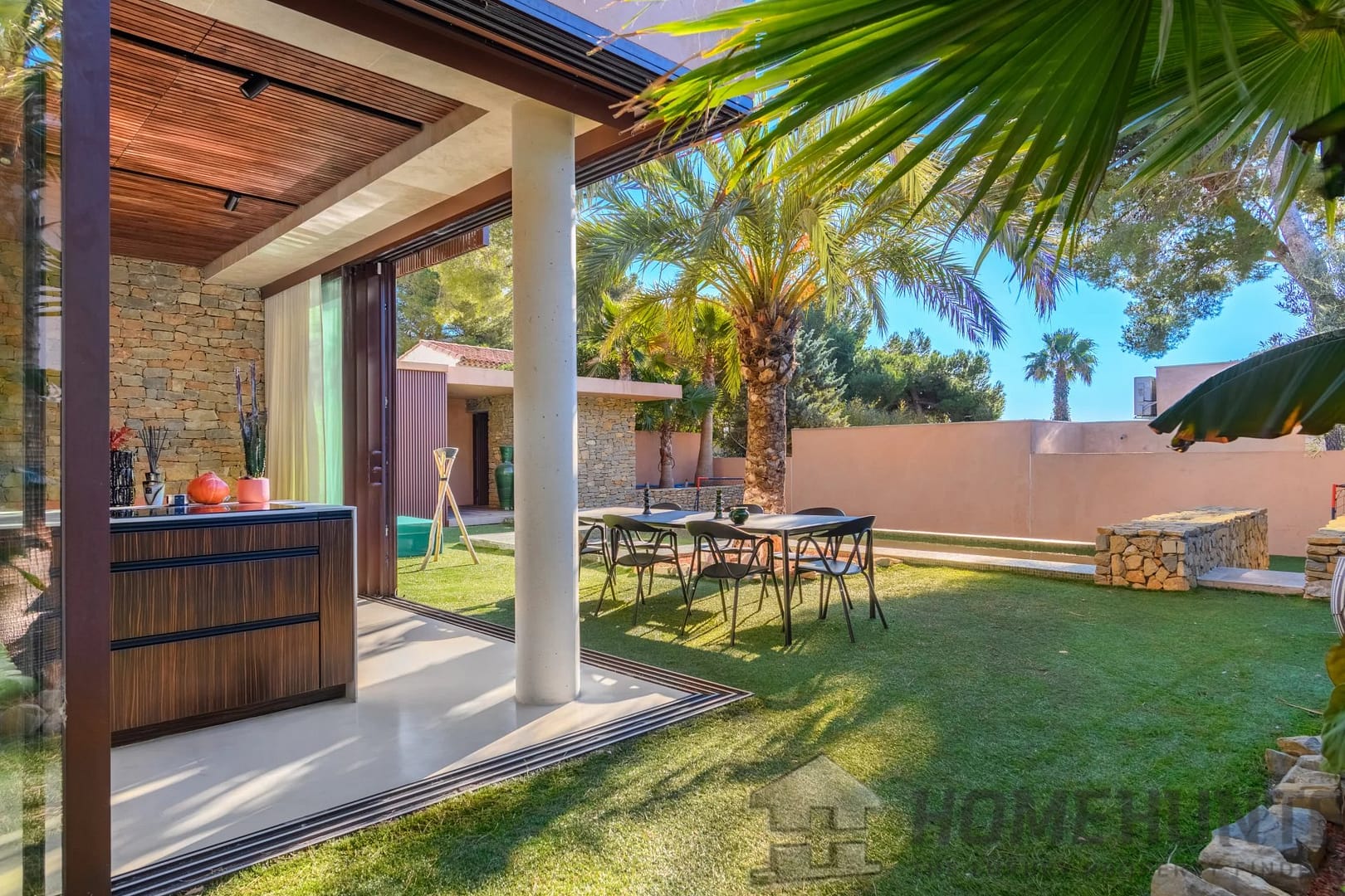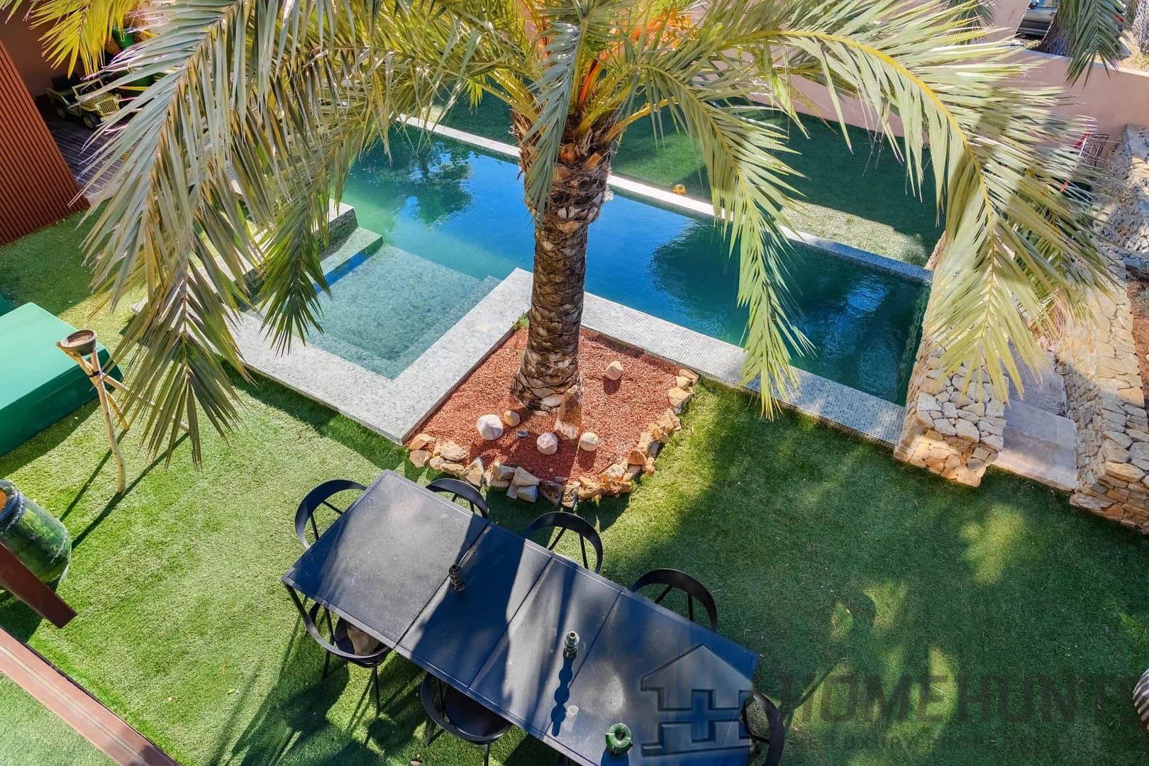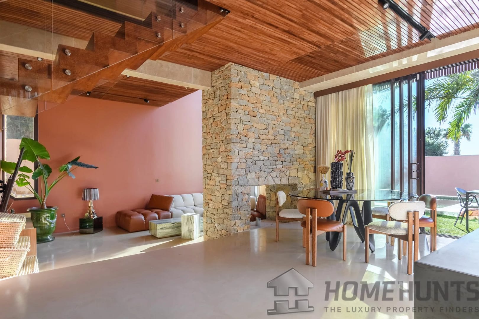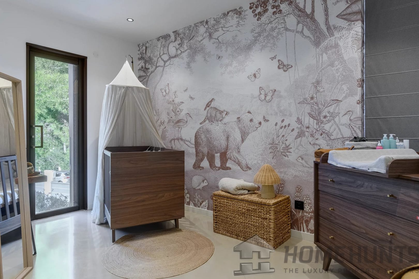 The entrance leads to a first bedroom with its own private shower room perfect for welcoming guests along with a laundry room and guest toilet. A few steps down, the home opens onto a stunning living area where floor-to-ceiling bay windows blur the lines between indoor and outdoor living, overlooking the landscaped garden and swimming pool.