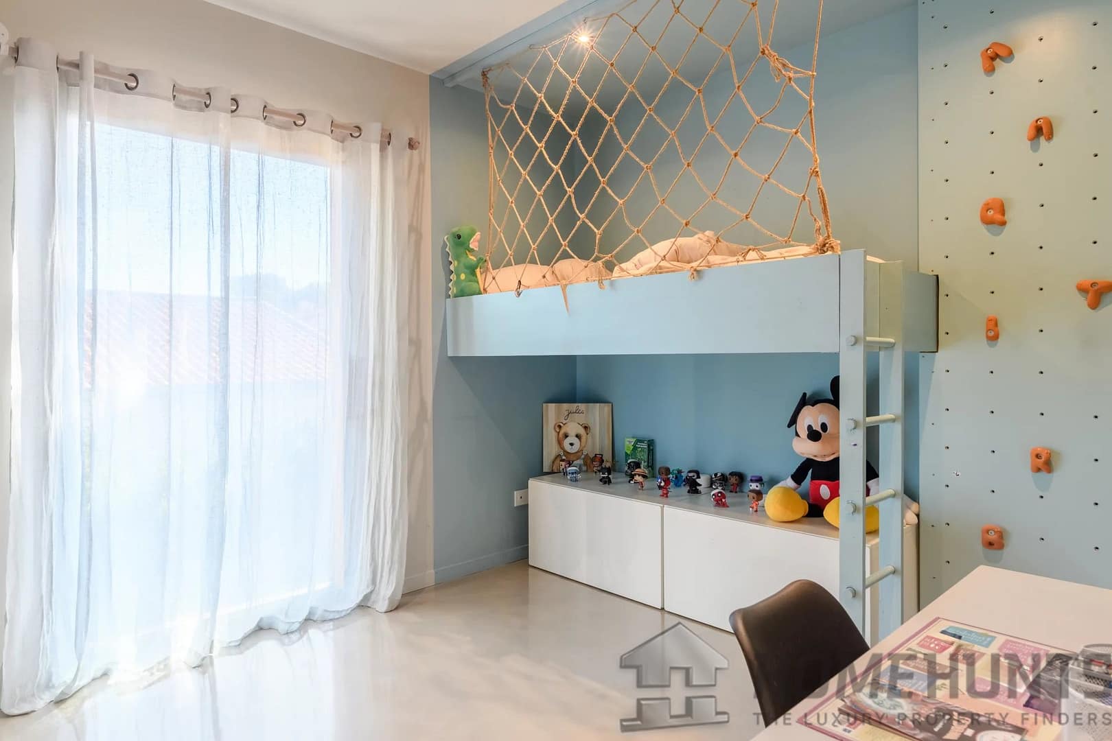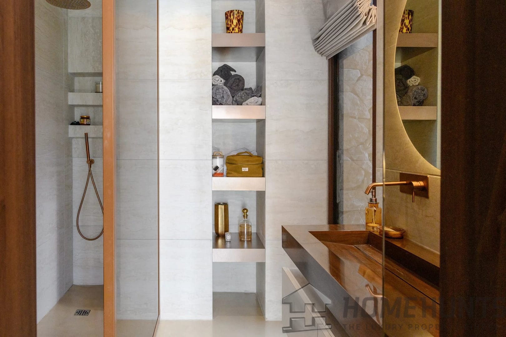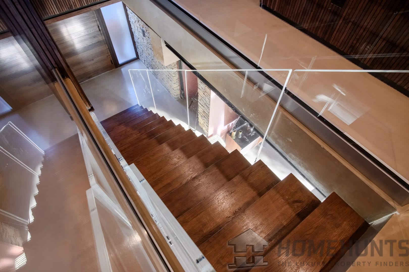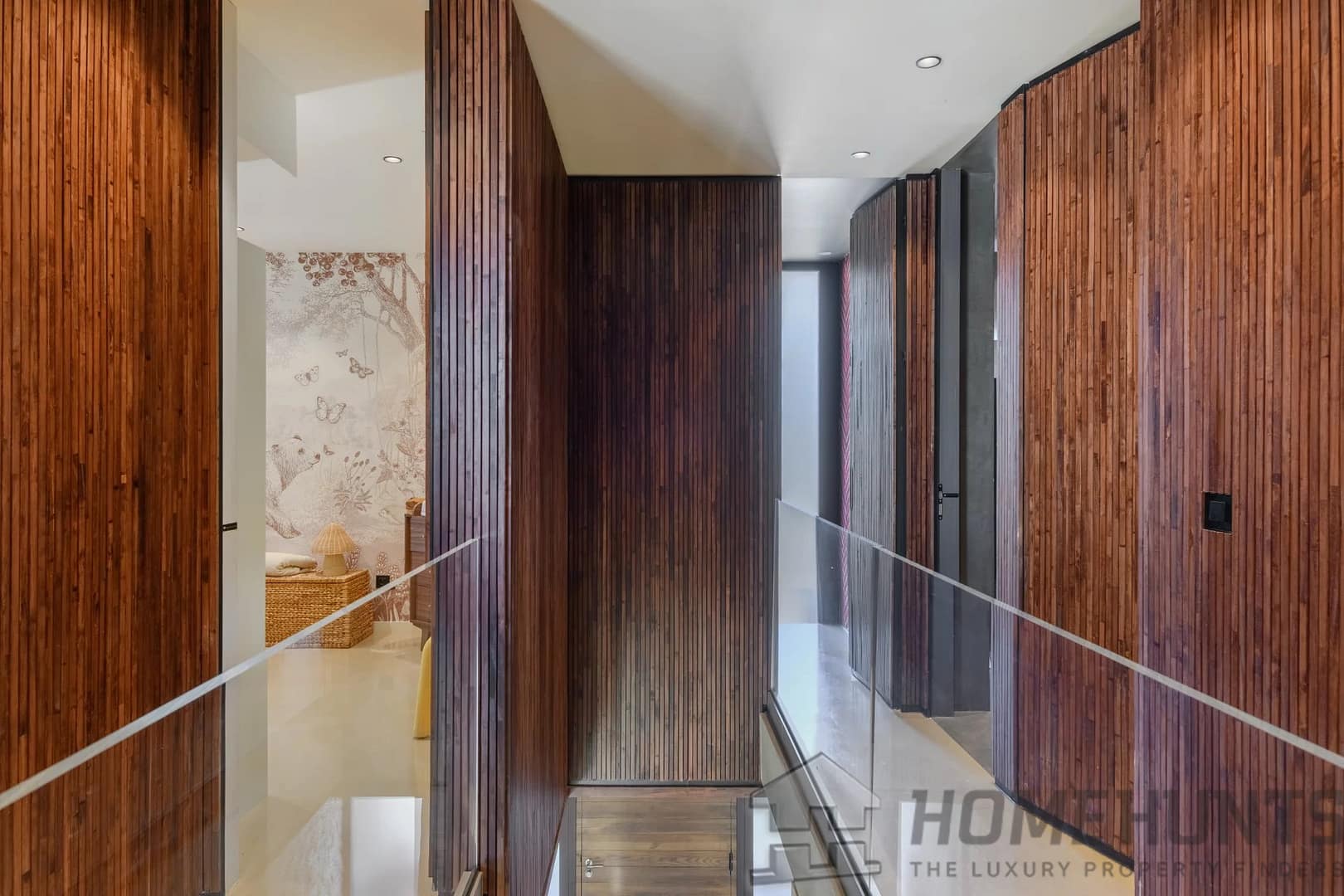 Upstairs, an elegant wooden-clad hallway discreetly conceals the entrances to two additional bedrooms, as well as the master suite featuring a dressing room and ensuite shower room. A separate bathroom and toilet complete this level.