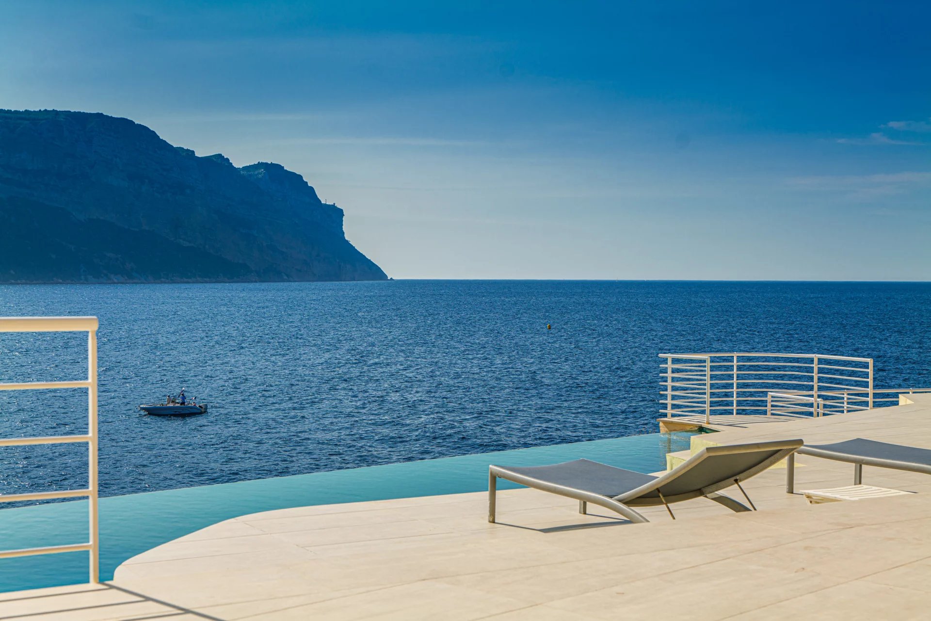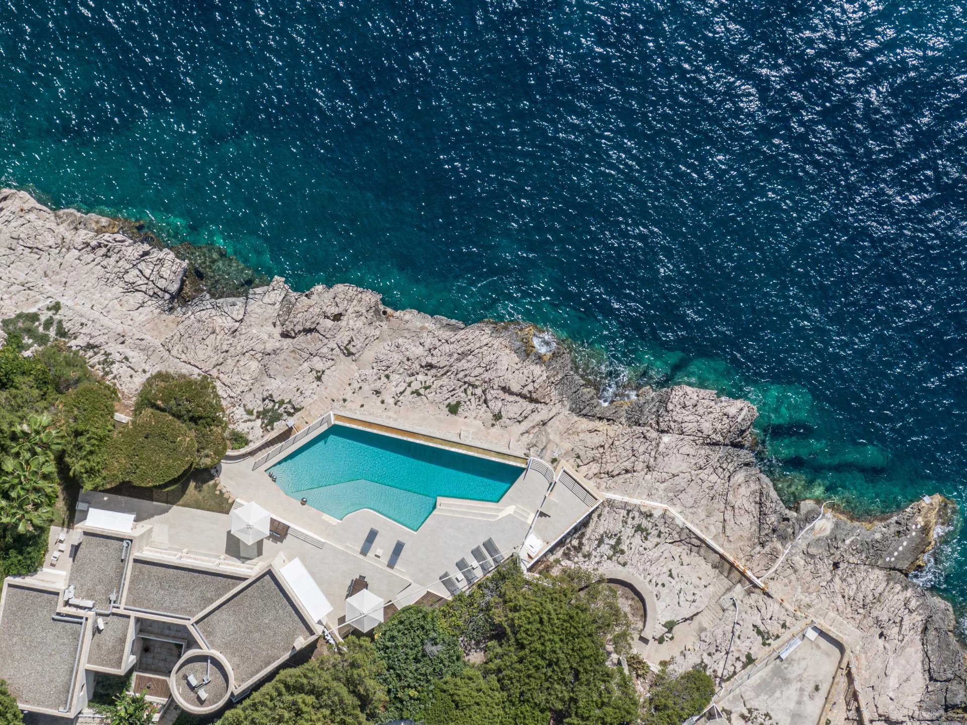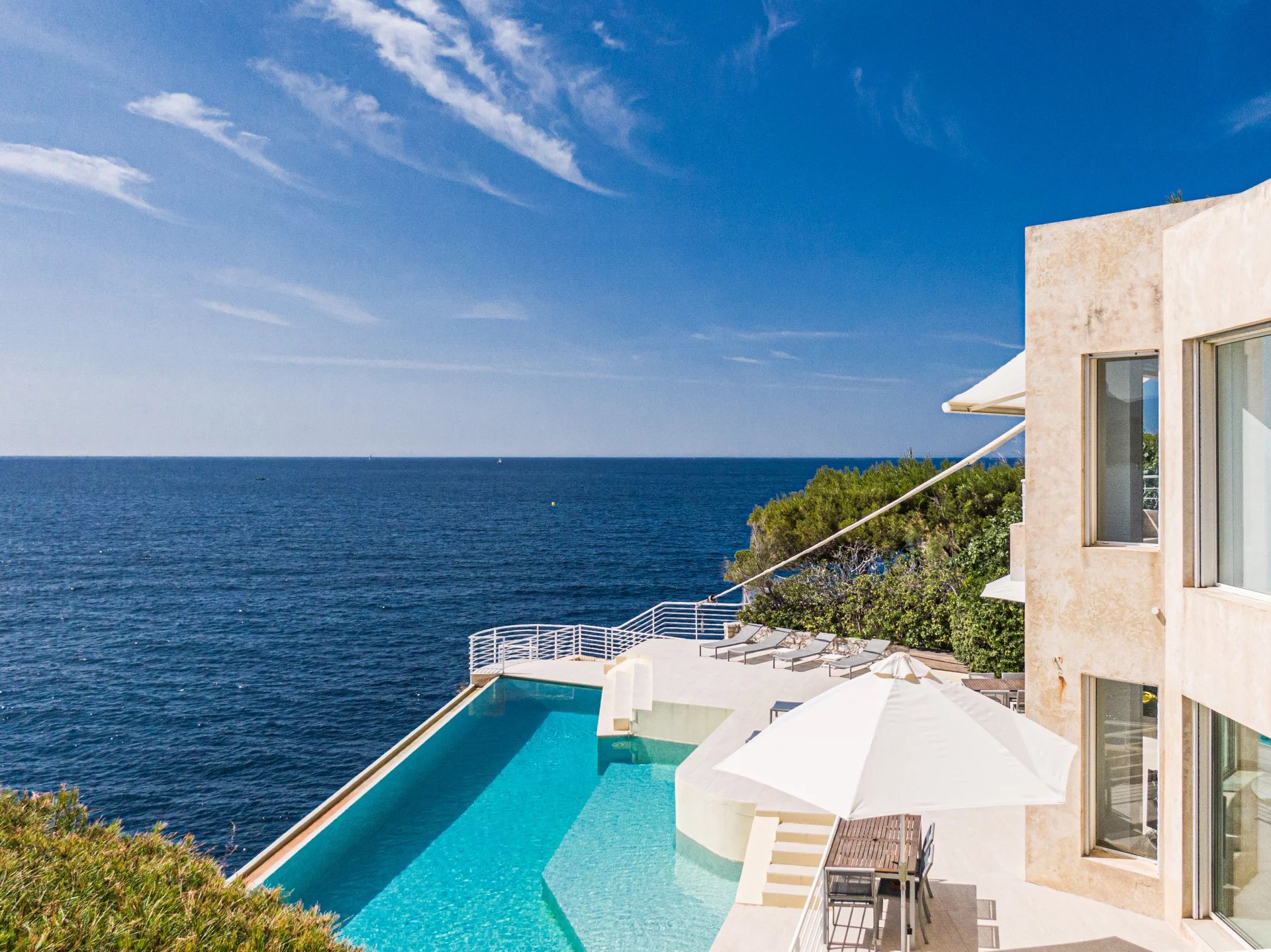 The impressive flat-roofed house recalls the timeless, sought-after allure of modernist homes from the 1950s. Its terrace and spectacular infinity pool were carved out of the rock, overlooking the sea.