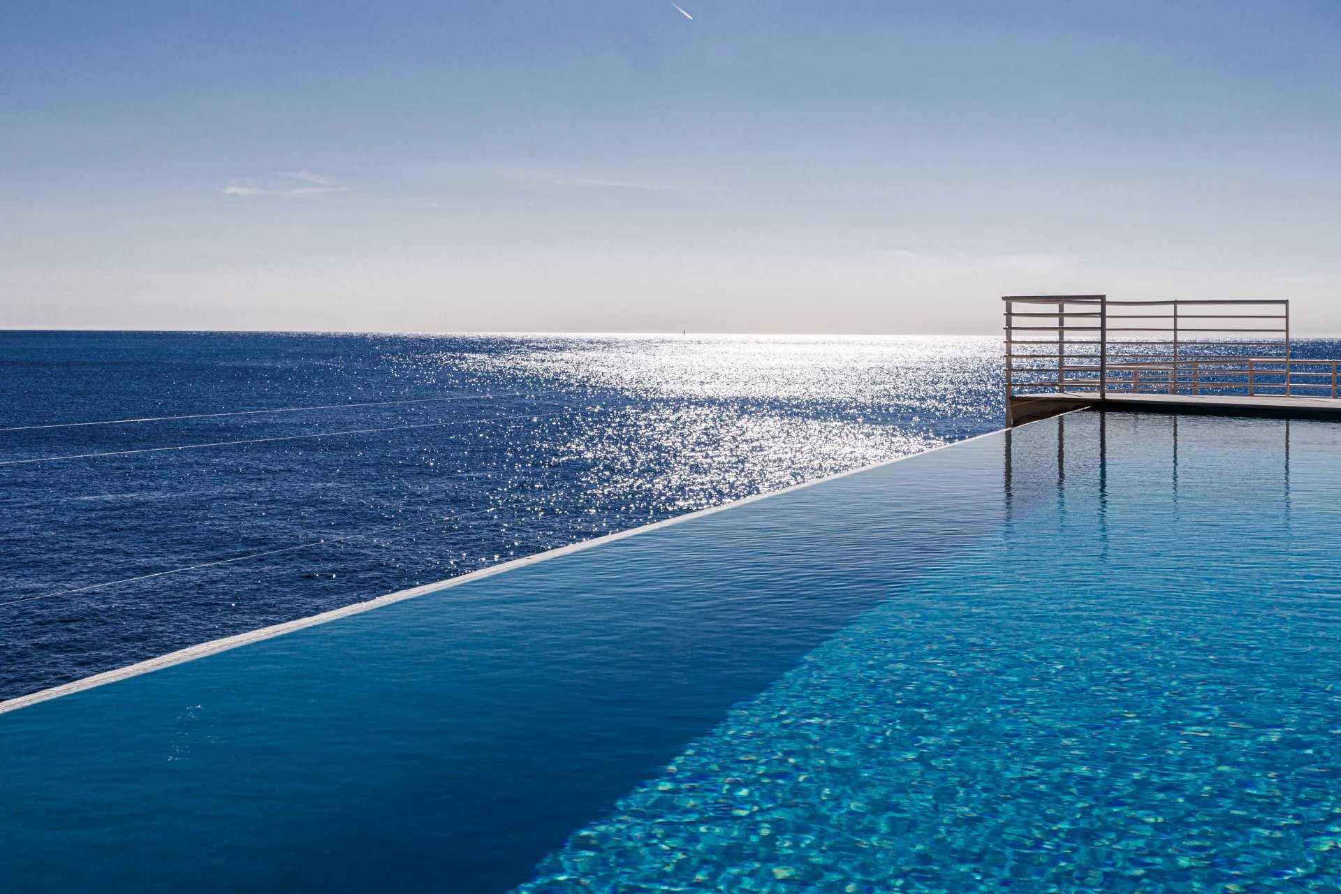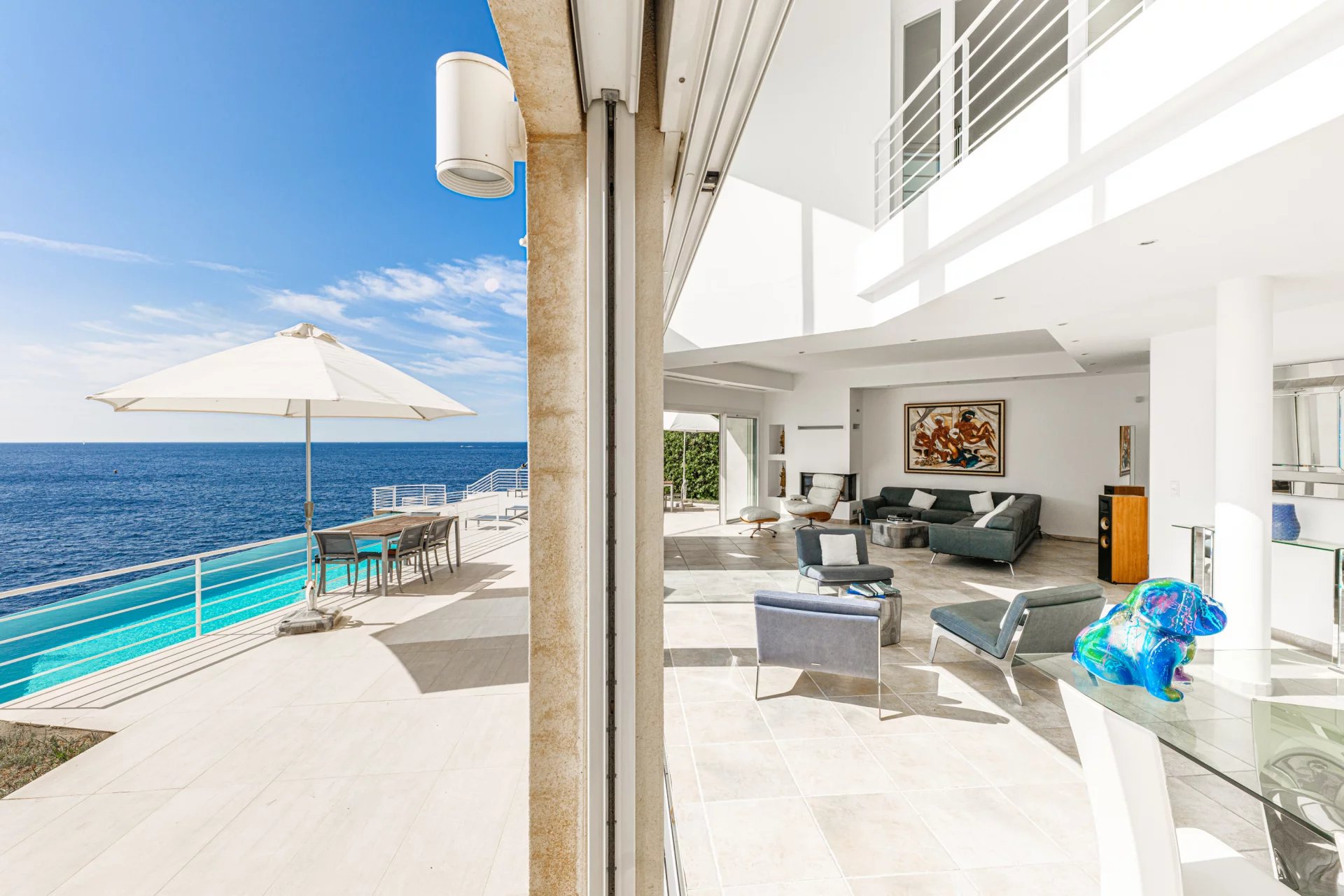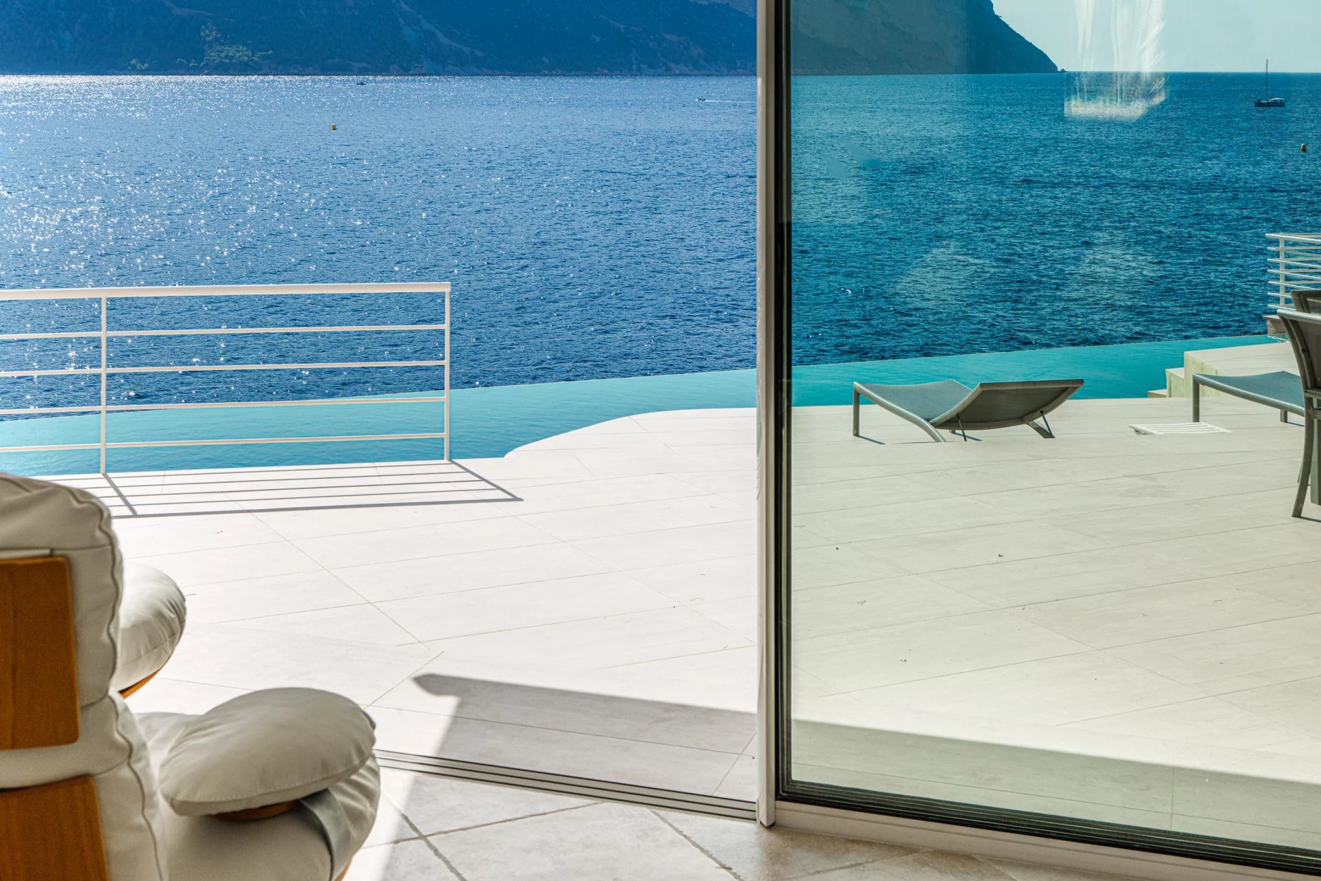 The impressive flat-roofed house recalls the timeless, sought-after allure of modernist homes from the 1950s. Its terrace and spectacular infinity pool were carved out of the rock, overlooking the sea.
