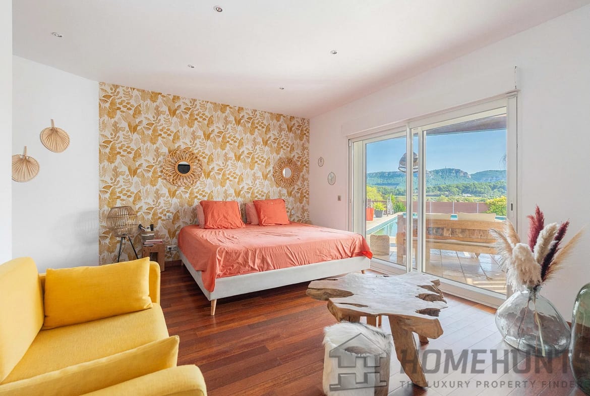 On the upper level, an independent apartment includes 3 bedrooms, one of which is a master suite, along with a 46 m2 living room/kitchen opening onto a 65 m2 south-facing terrace.