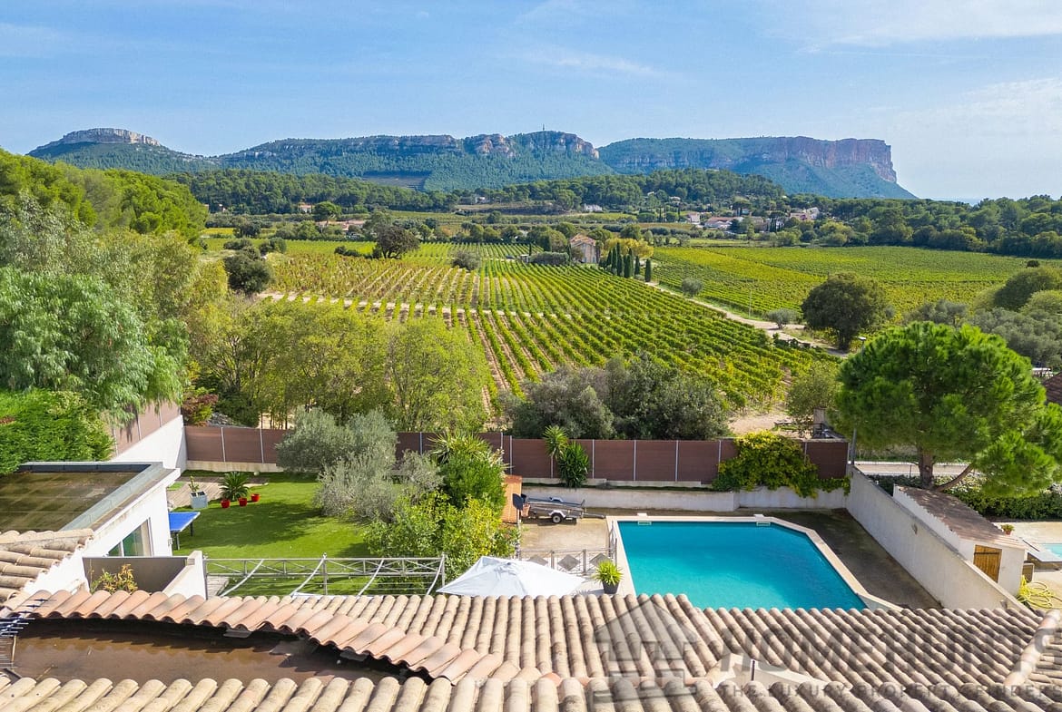 Outside, enjoy a large terrace with a fully equipped summer kitchen, barbecue, a 200 m2 garden, and a heated pool facing south, offering stunning views of the vineyards and Cap Canaille.