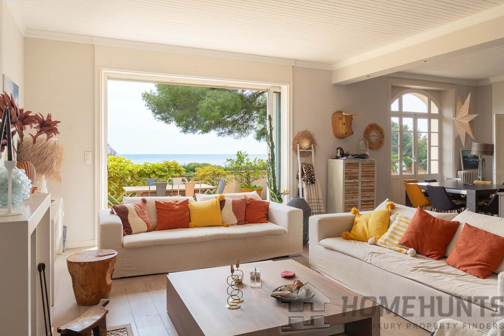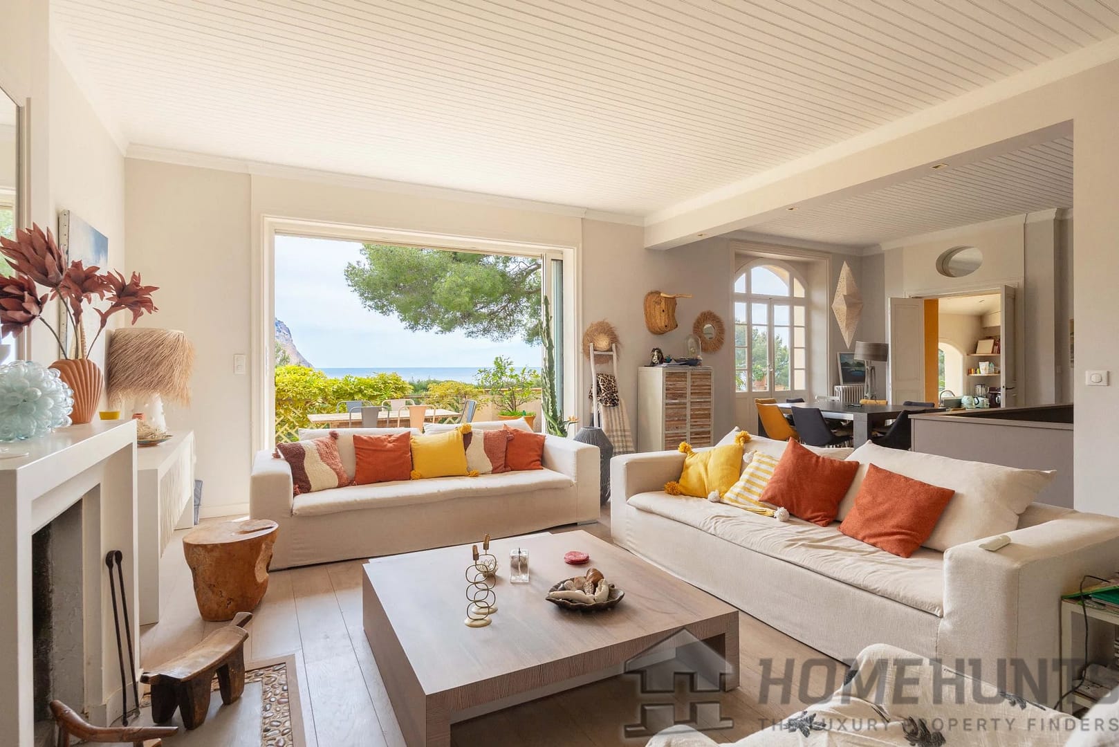 – A bright, open-plan living and dining room with fireplace, opening directly onto a terrace with sweeping sea views