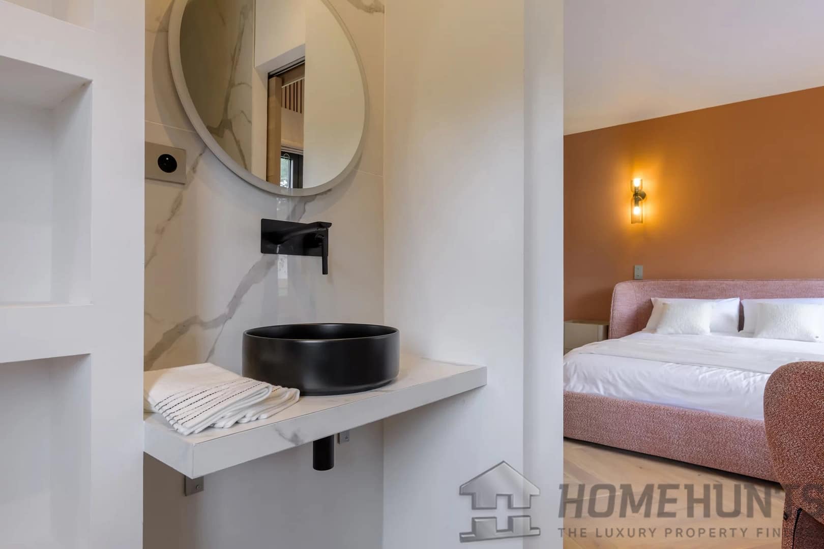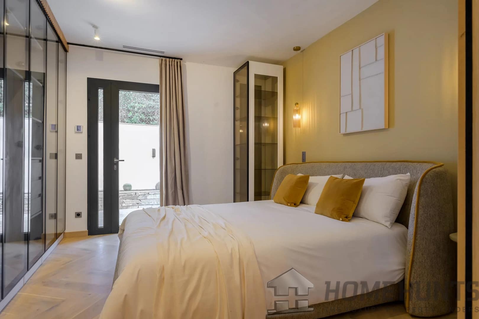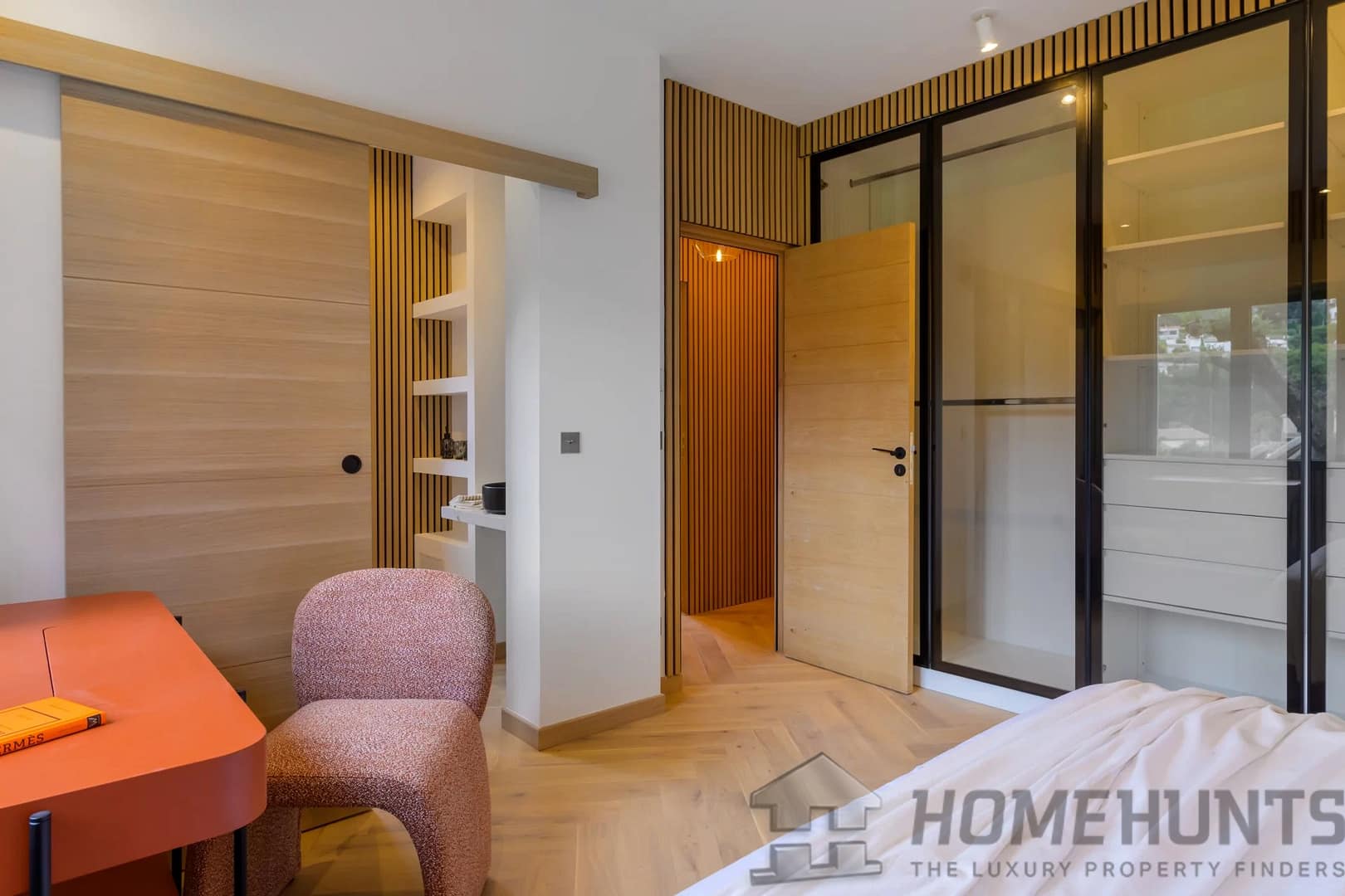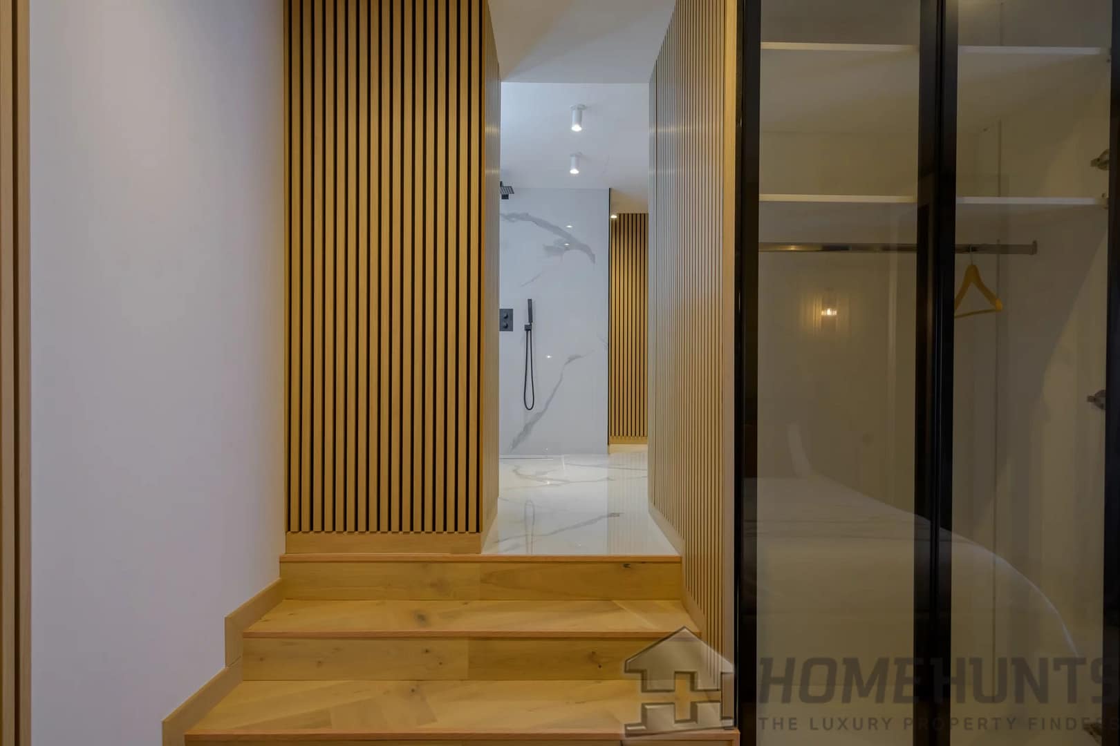 Designed to embrace indoor-outdoor living, the main garden level features a spacious 56 m2 living area with a sleek open-plan kitchen, opening directly onto a vast terrace with views toward the pool and gardens. This level also includes three generously sized en-suite bedrooms, each with bespoke dressing rooms and stylish shower rooms.