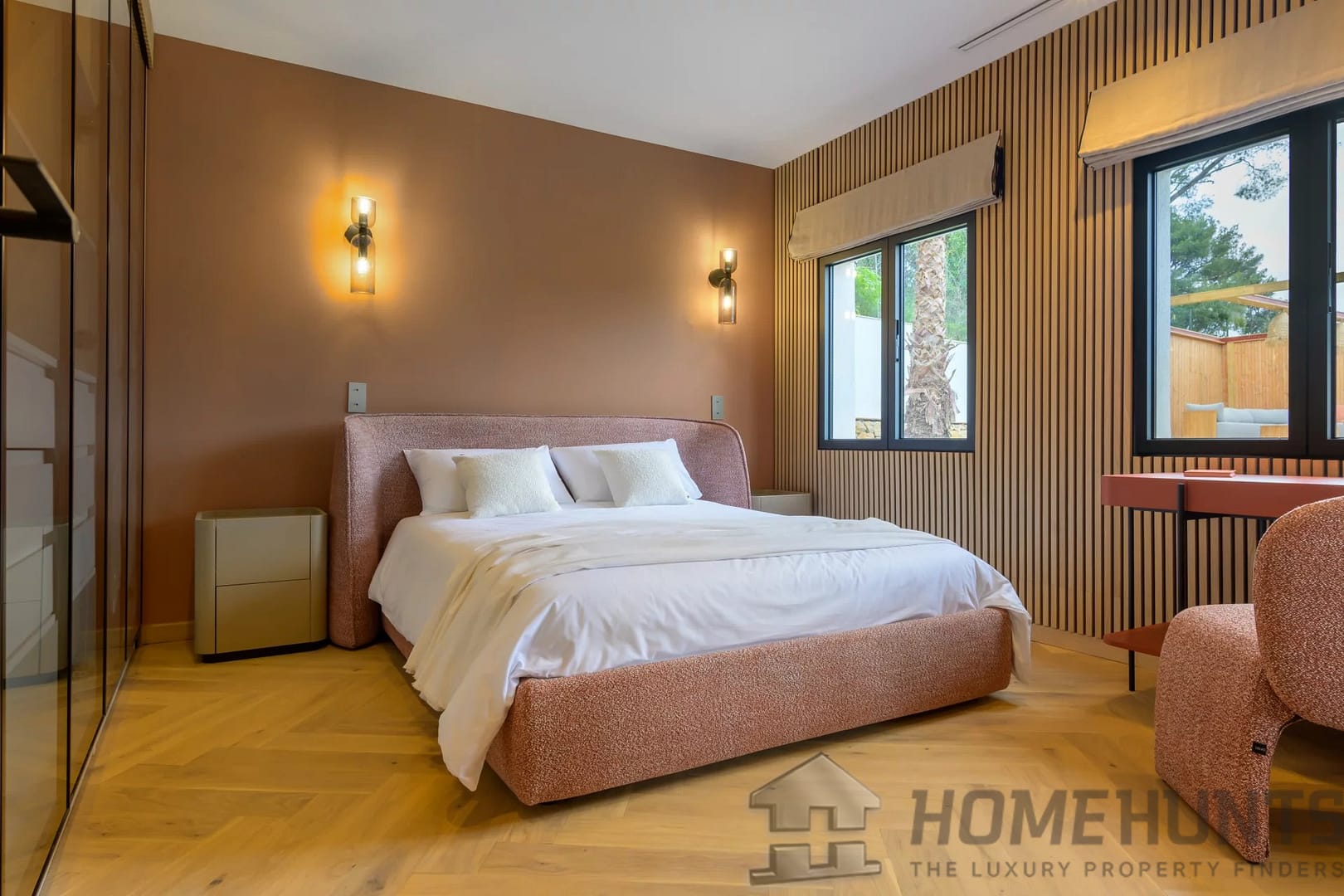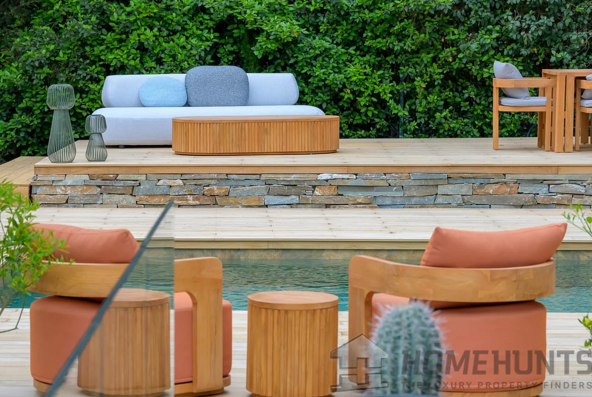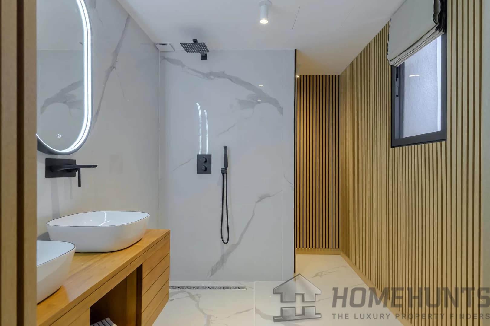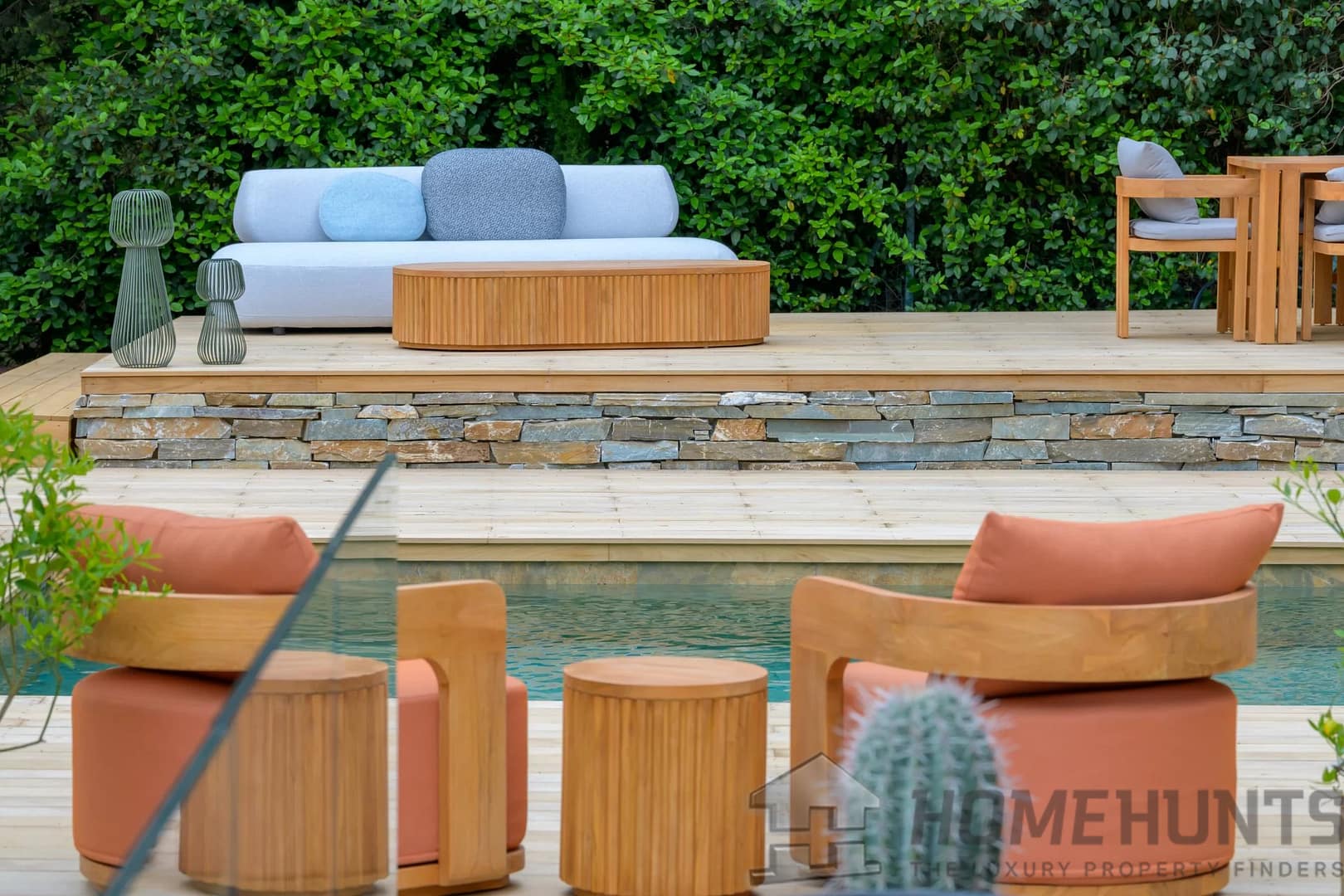 Designed to embrace indoor-outdoor living, the main garden level features a spacious 56 m2 living area with a sleek open-plan kitchen, opening directly onto a vast terrace with views toward the pool and gardens. This level also includes three generously sized en-suite bedrooms, each with bespoke dressing rooms and stylish shower rooms.