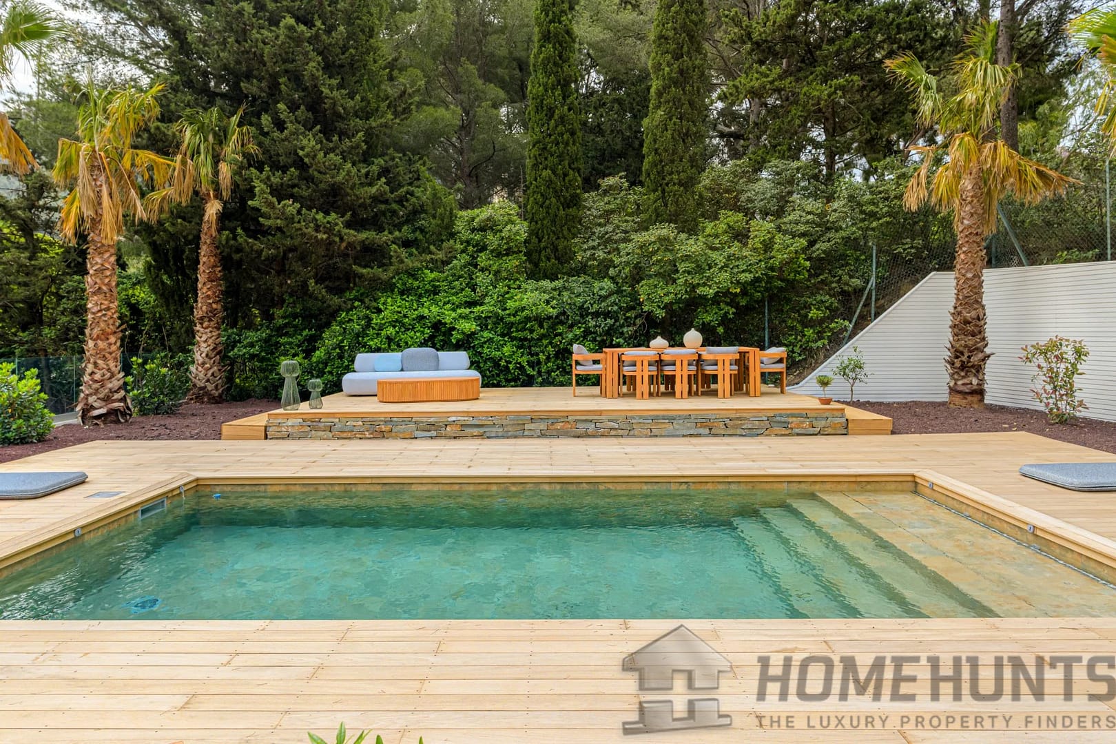 Outdoors, a generous 6.80 x 3.80 m swimming pool with wooden deck provides a peaceful retreat, while various garden areas offer a true celebration of Provencal living: summer lounges and dining spaces, manicured lawns, a petanque court, and shaded areas framed by majestic palm trees and lush Mediterranean and exotic vegetation.