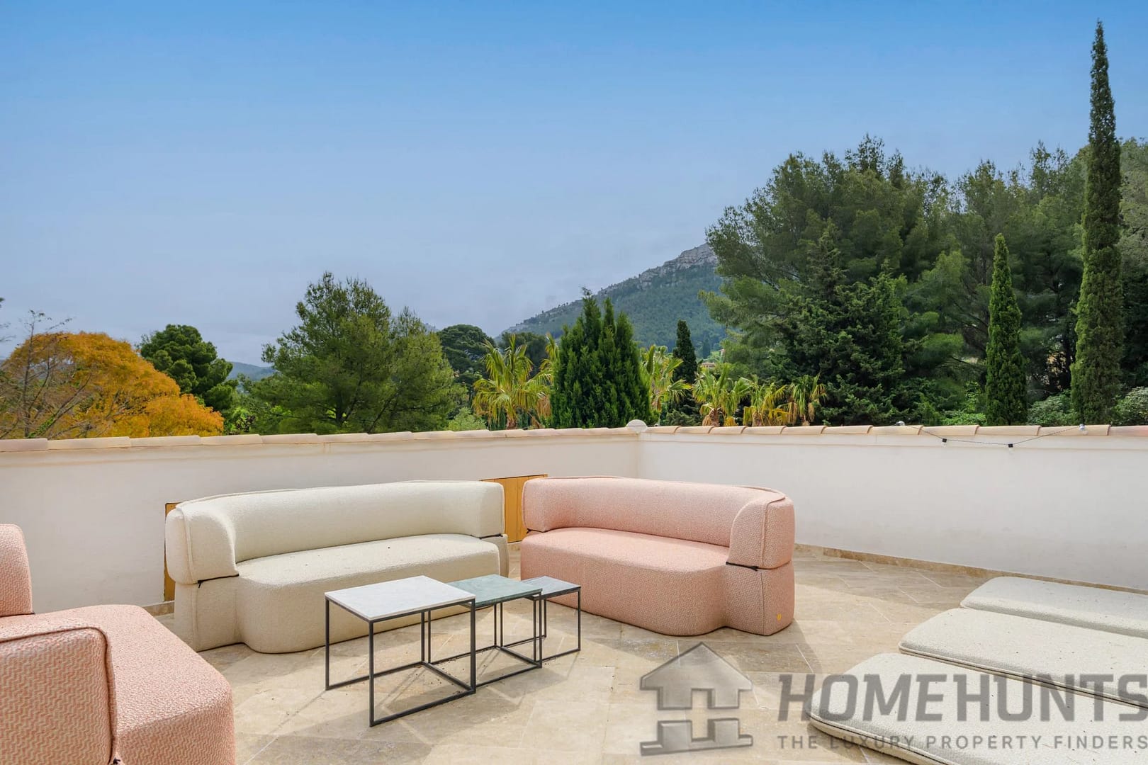 An exterior staircase leads to a panoramic rooftop solarium, where one can enjoy views stretching towards the sea and the dramatic cliffs of Cap Canaille—Cassis’ iconic landmark.