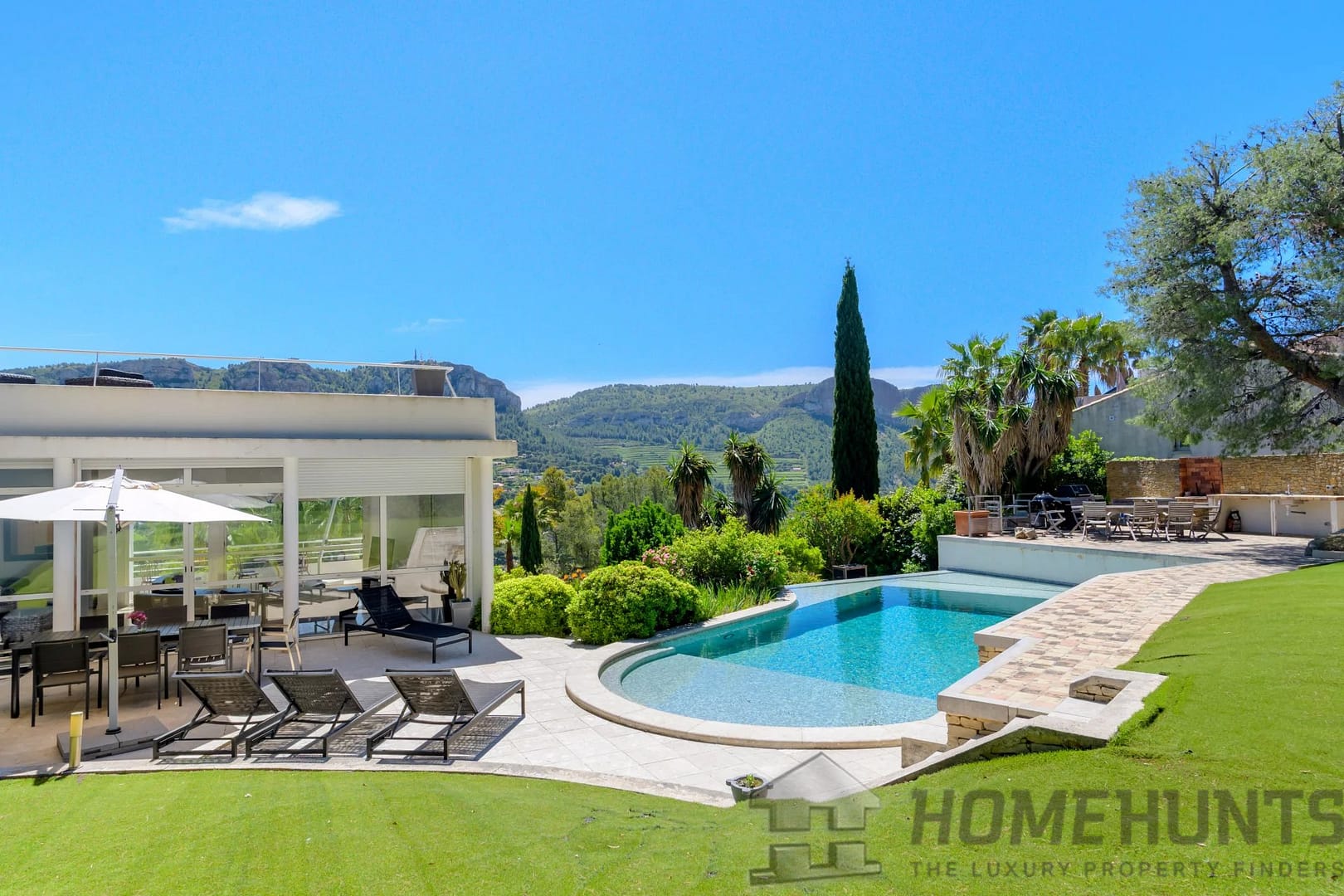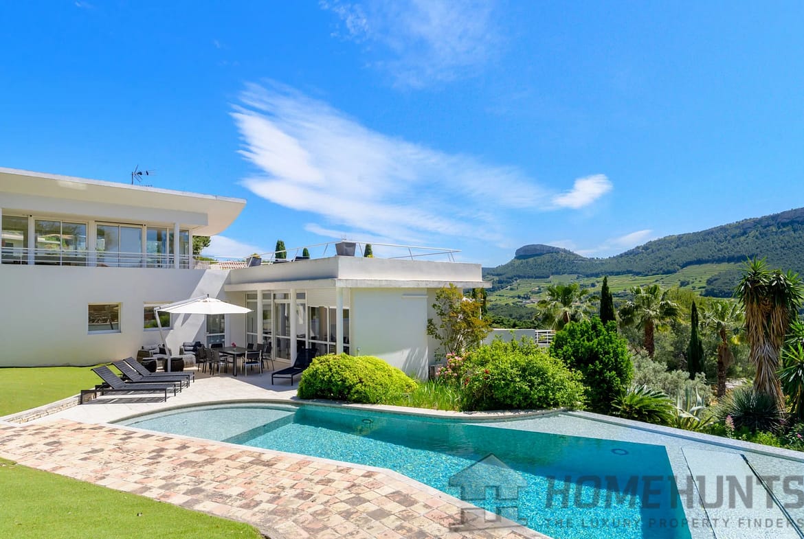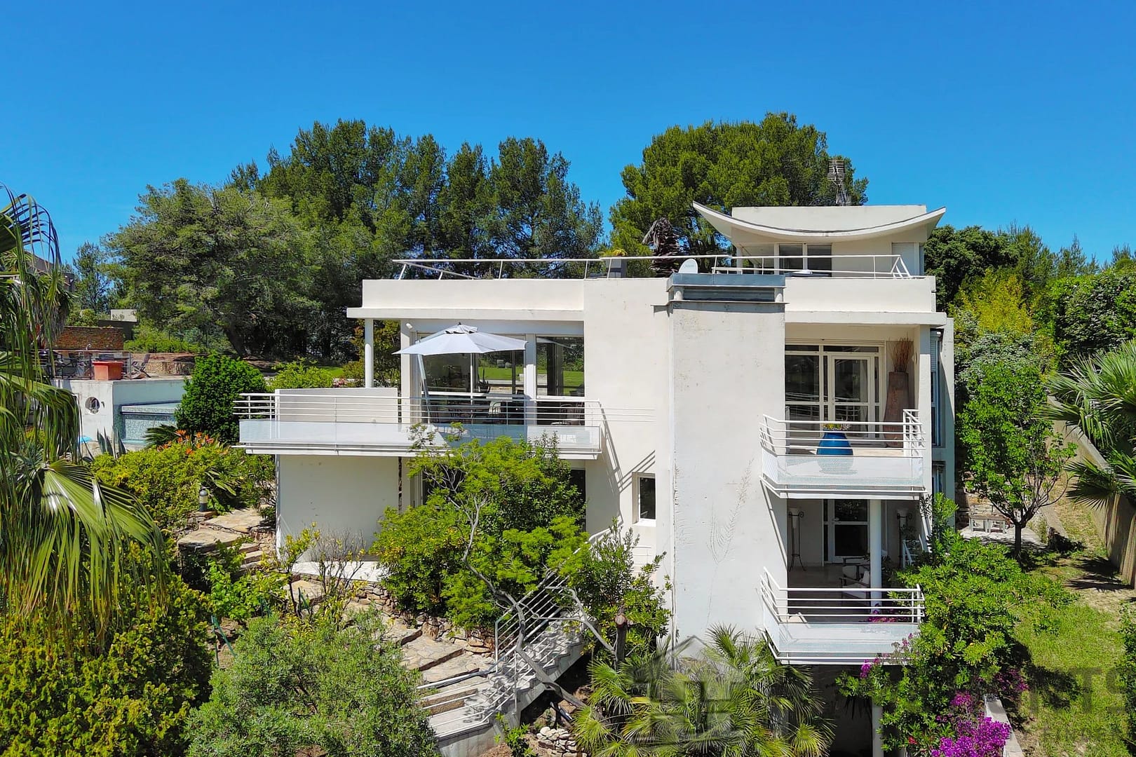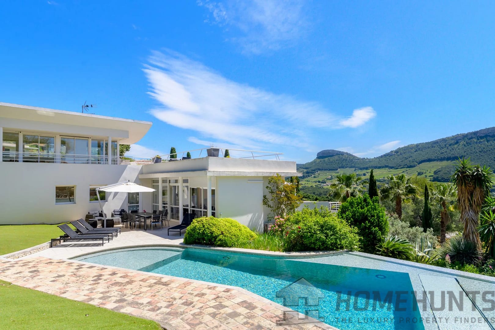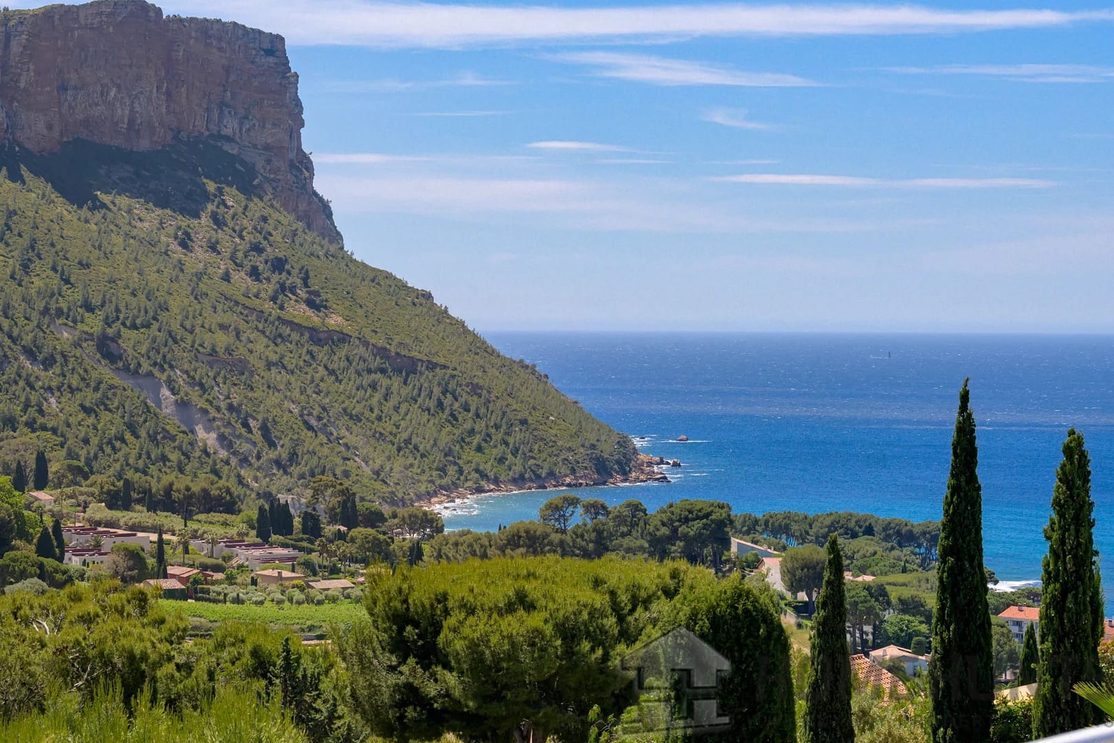 Original architect-designed house located in a secure residence, boasting spectacular views of the sea, Cap Canaille, Cassis Castle, Charlemagne’s Crown, and the vineyards, within a landscaped plot of 1600m2.