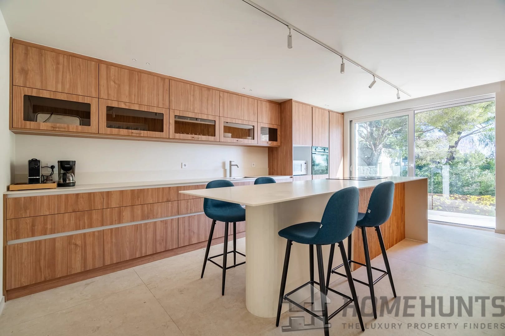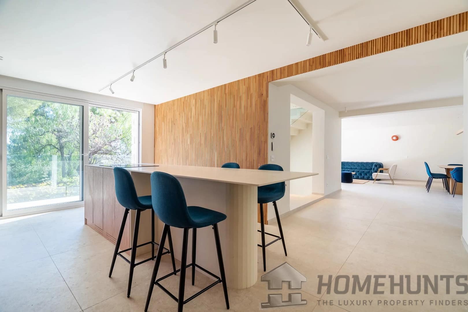 Bathed in natural light, the main level features a spacious living area facing the sea, a fully equipped modern kitchen, and a laundry room — all opening onto the outdoor terraces that invite seamless indoor–outdoor living.
