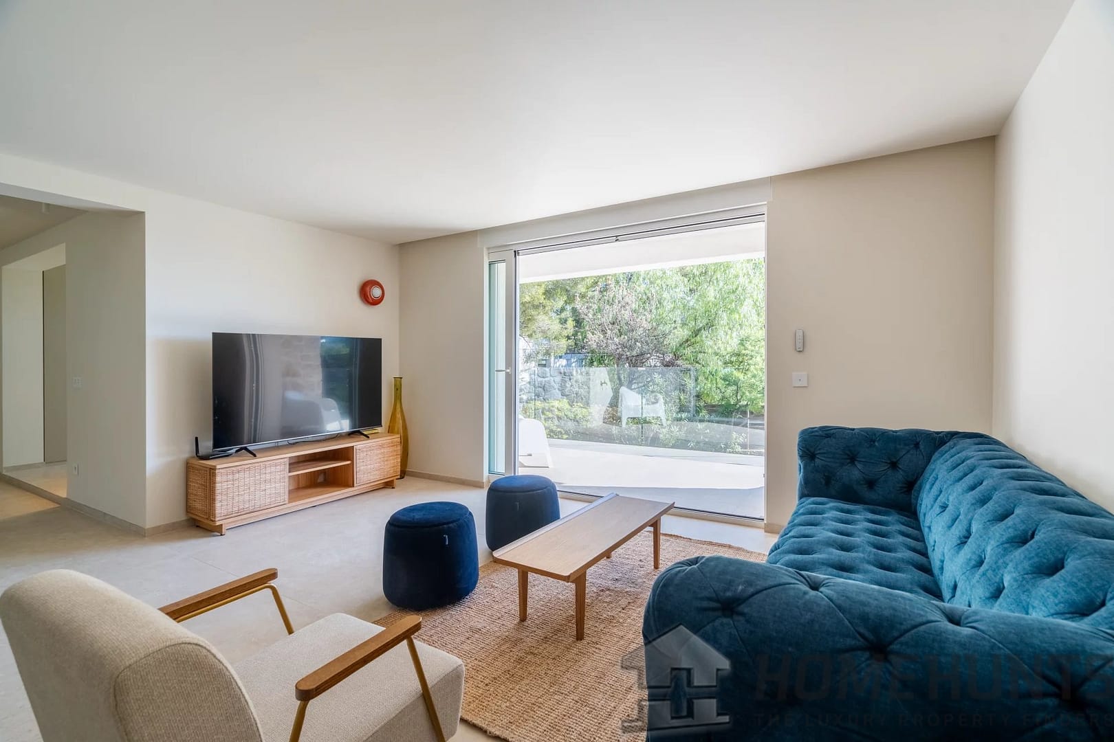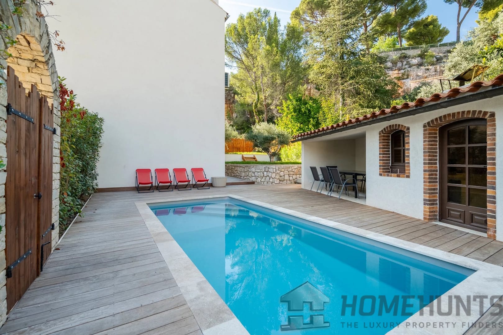 Outside, the atmosphere is one of serenity and Riviera charm, with a beautiful swimming pool, elegant pool house, and sun-drenched terraces framed by a lush Mediterranean garden.