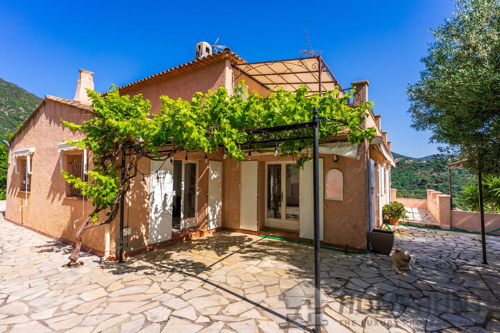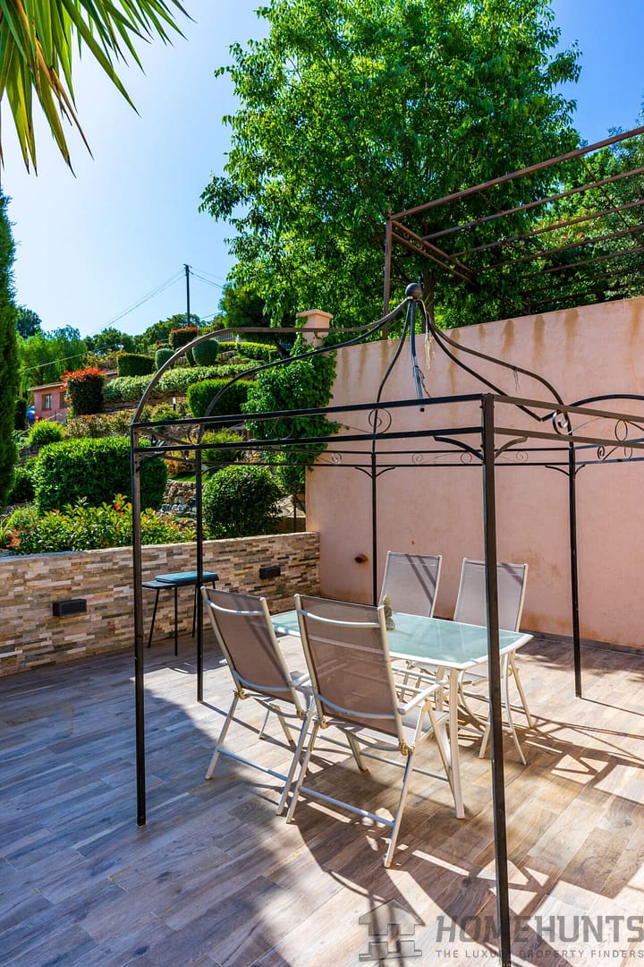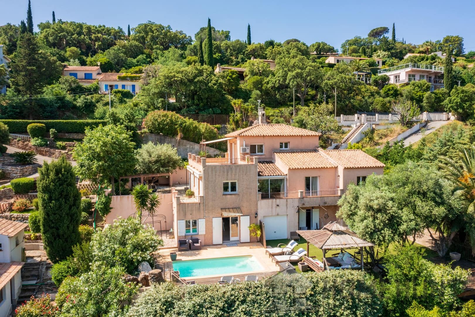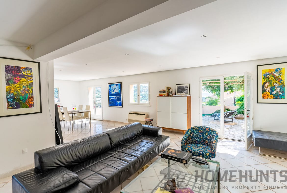 Ideally located in a quiet cul-de-sac in the Roseraie district, this villa is 240 m2 nestled into the hillside on a landscaped plot of 1,124 m2 with a sea view.