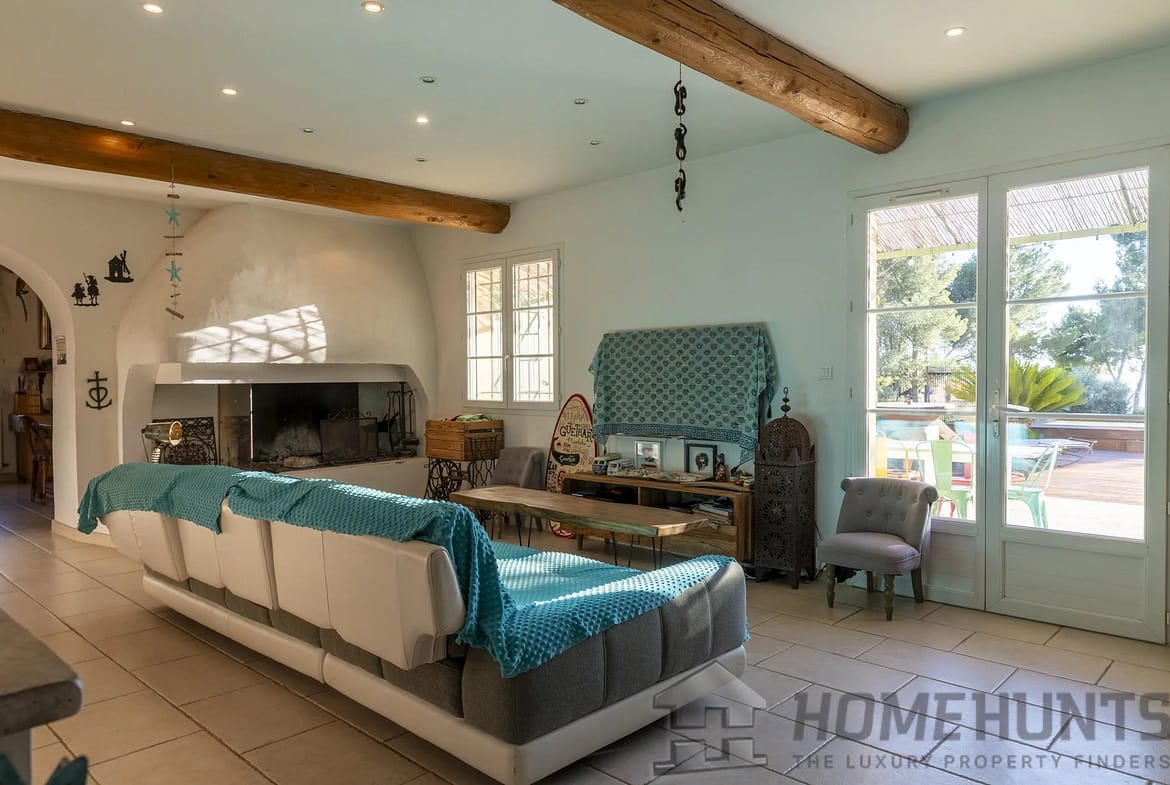 The living room opens onto a large sunny terrace with a sea view, perfect for enjoying the Mediterranean climate all year round.