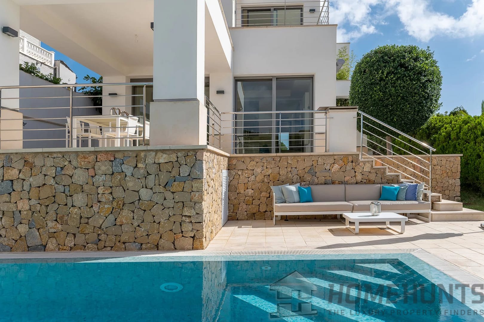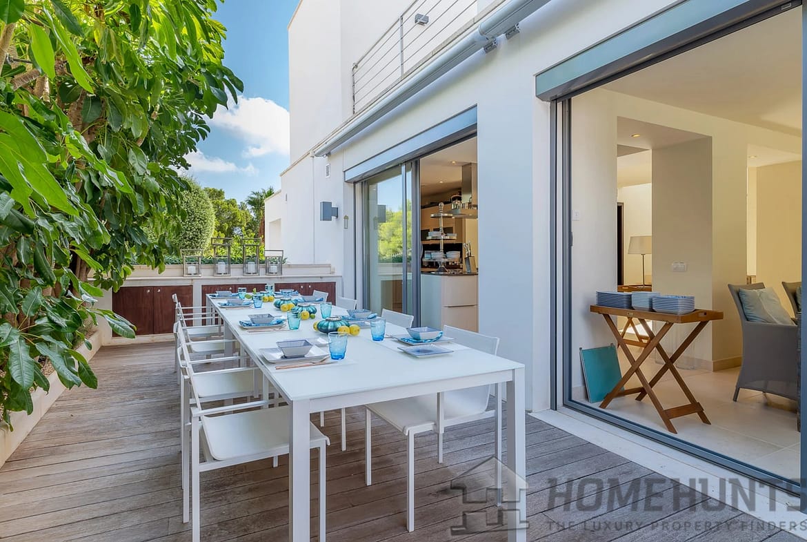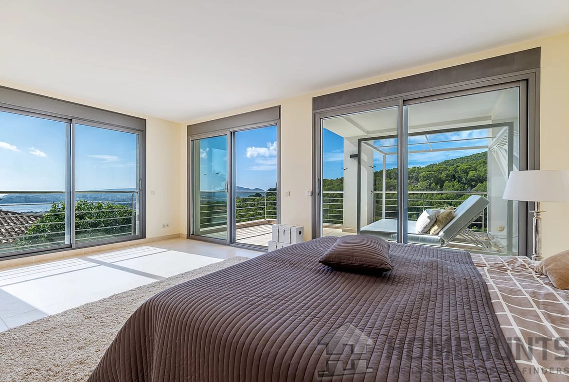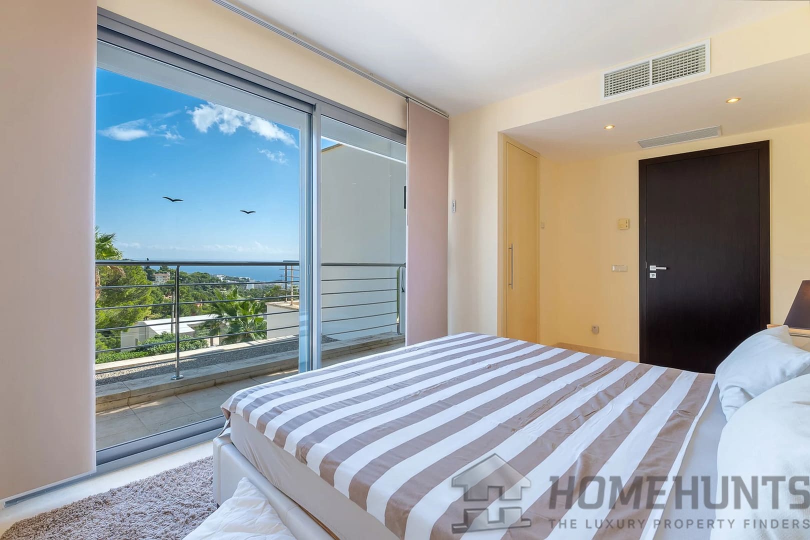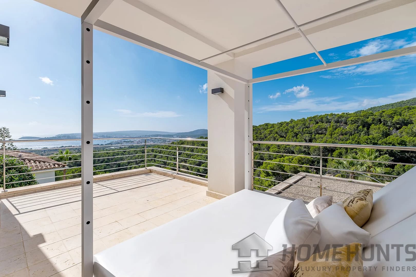 Upstairs there are three further bedrooms, two of which share a large bathroom, with their own terraces and private areas. The spacious and majestic master bedroom has an en-suite bathroom, a dressing room and a large terrace overlooking the bay of Palmanova, turning evenings into magical moments under the lights of the bay.
