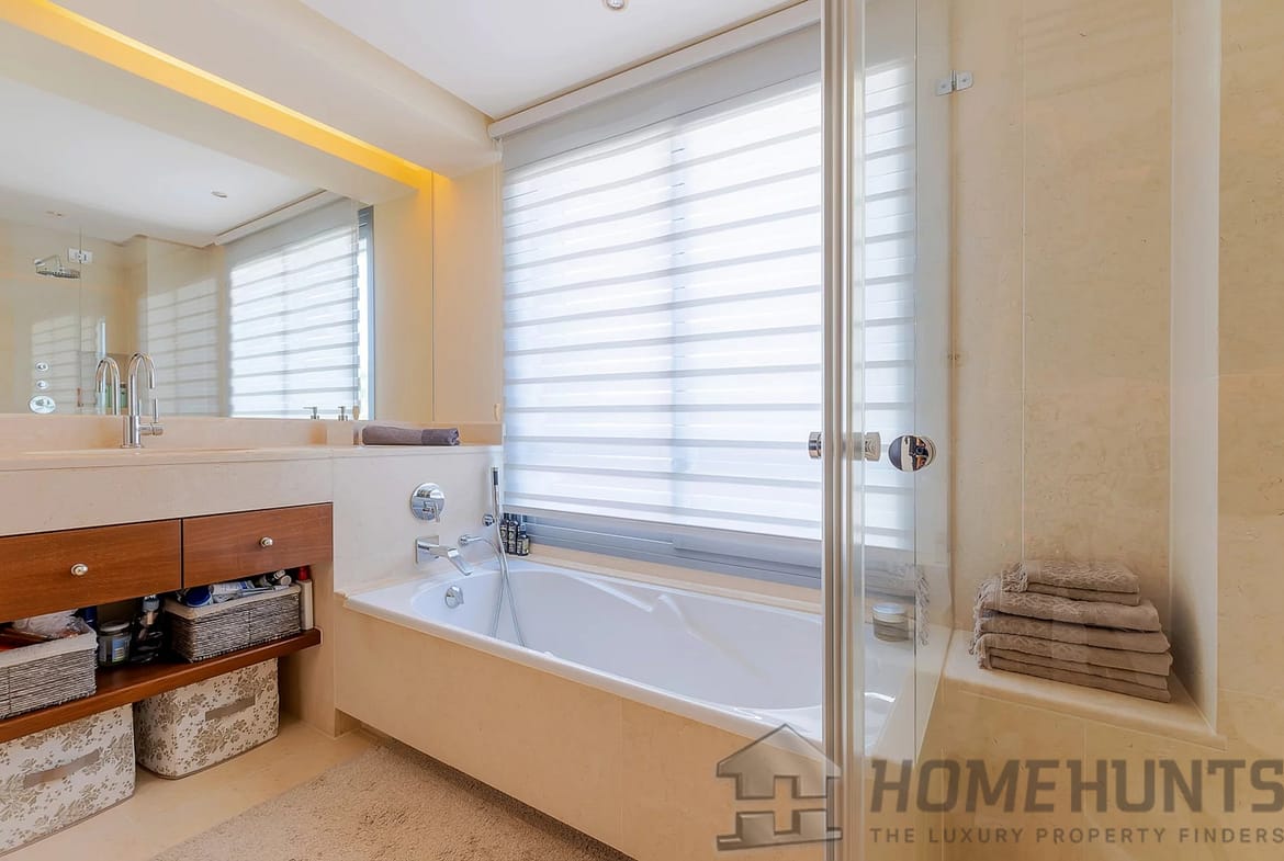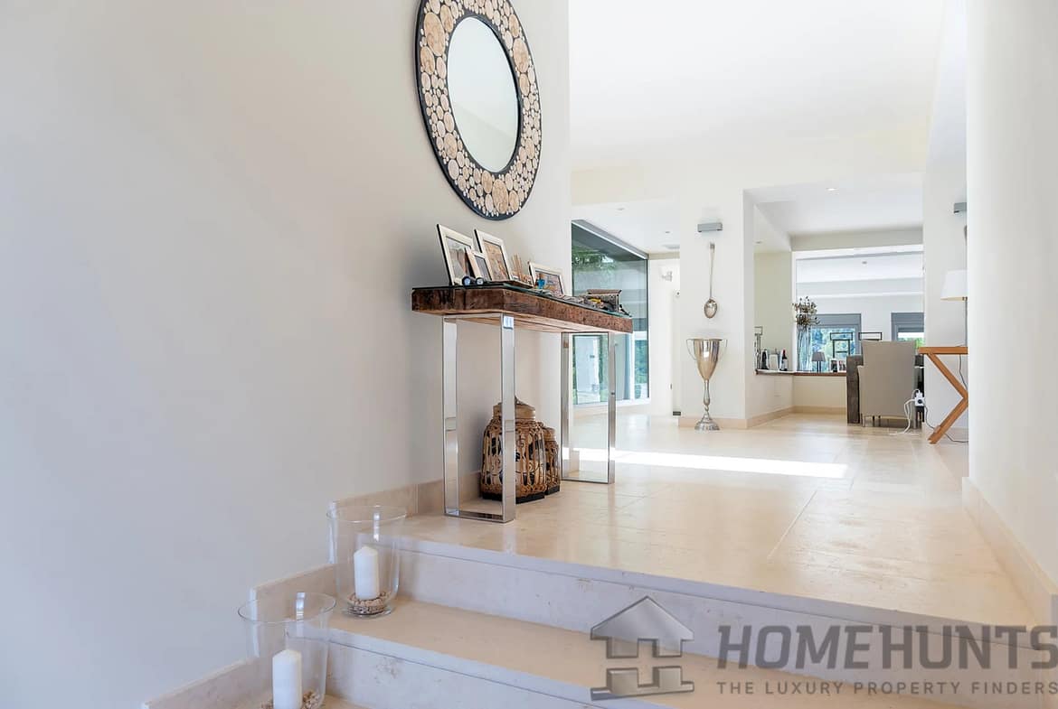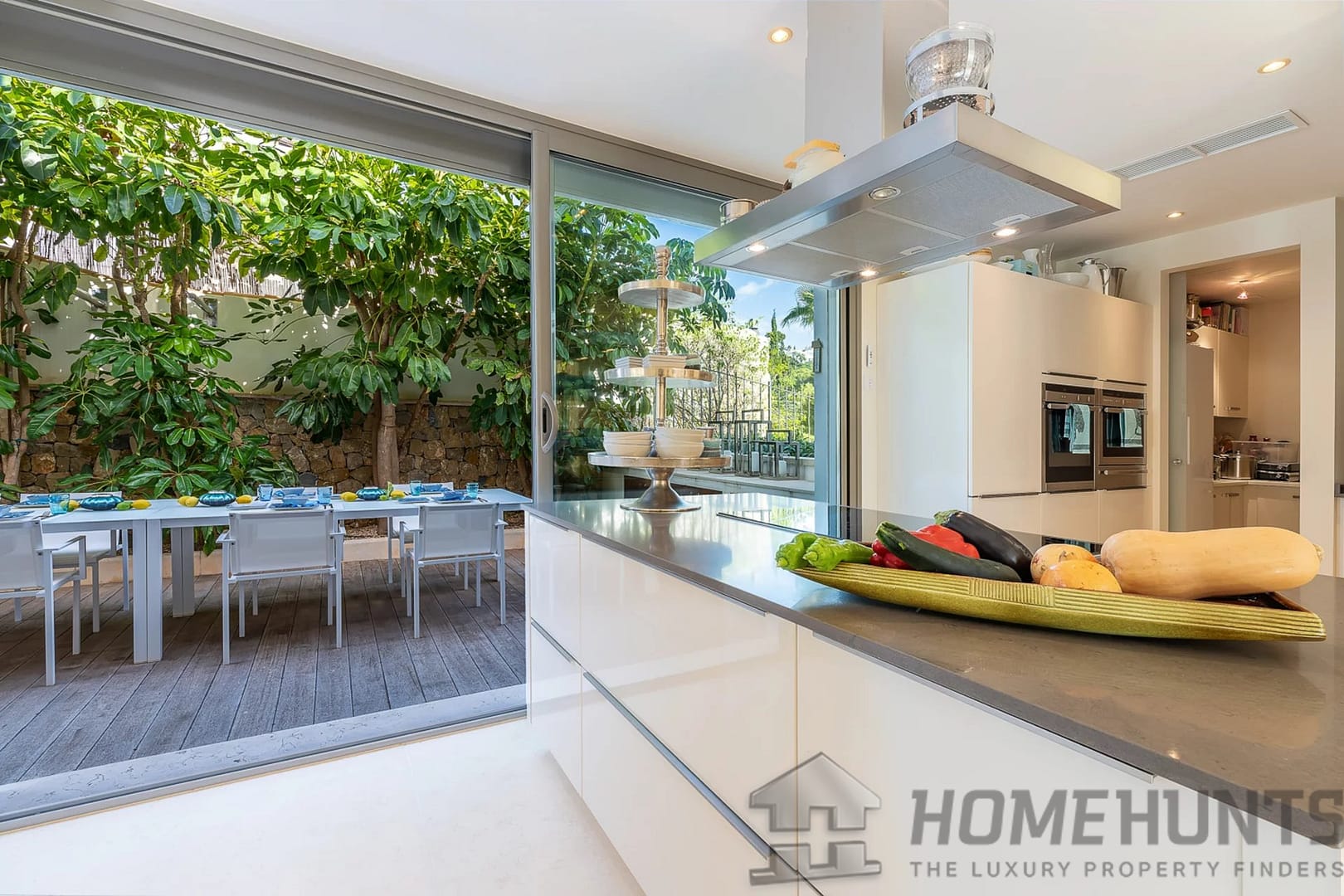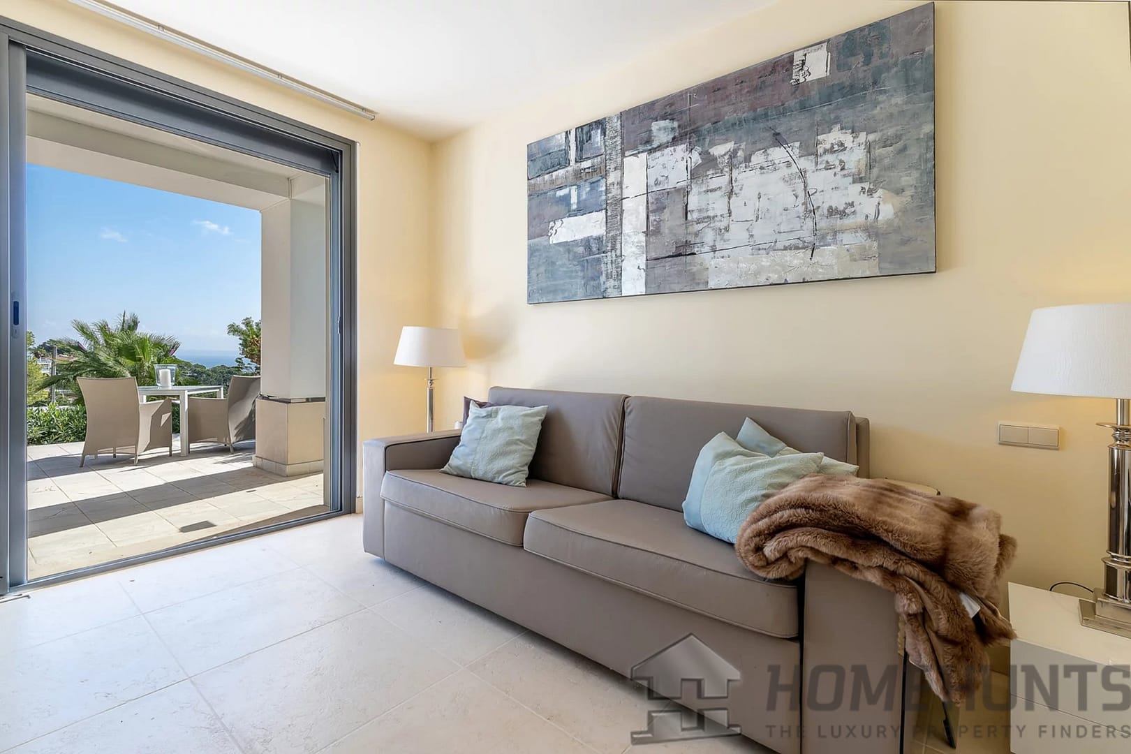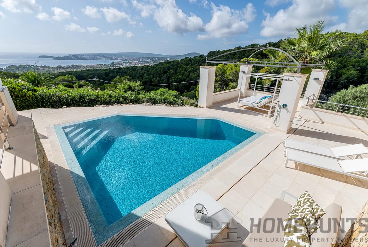 Upstairs there are three further bedrooms, two of which share a large bathroom, with their own terraces and private areas. The spacious and majestic master bedroom has an en-suite bathroom, a dressing room and a large terrace overlooking the bay of Palmanova, turning evenings into magical moments under the lights of the bay.