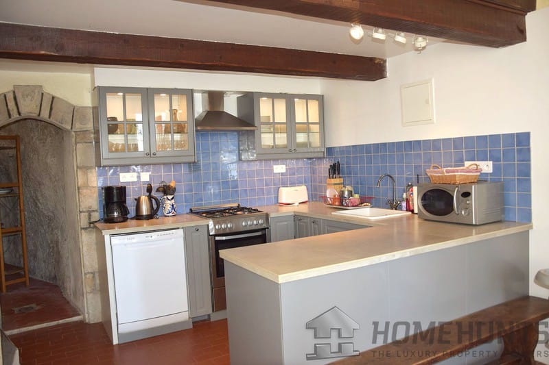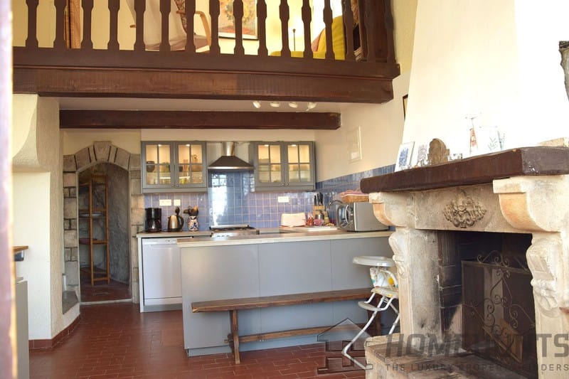 The main house includes a large living room with open kitchen and dining room, wine cellar and a mezzanine. On a level slightly shifted upwards, there are 3 bedrooms, one of which with a terrace, a bathroom and toilet separated.