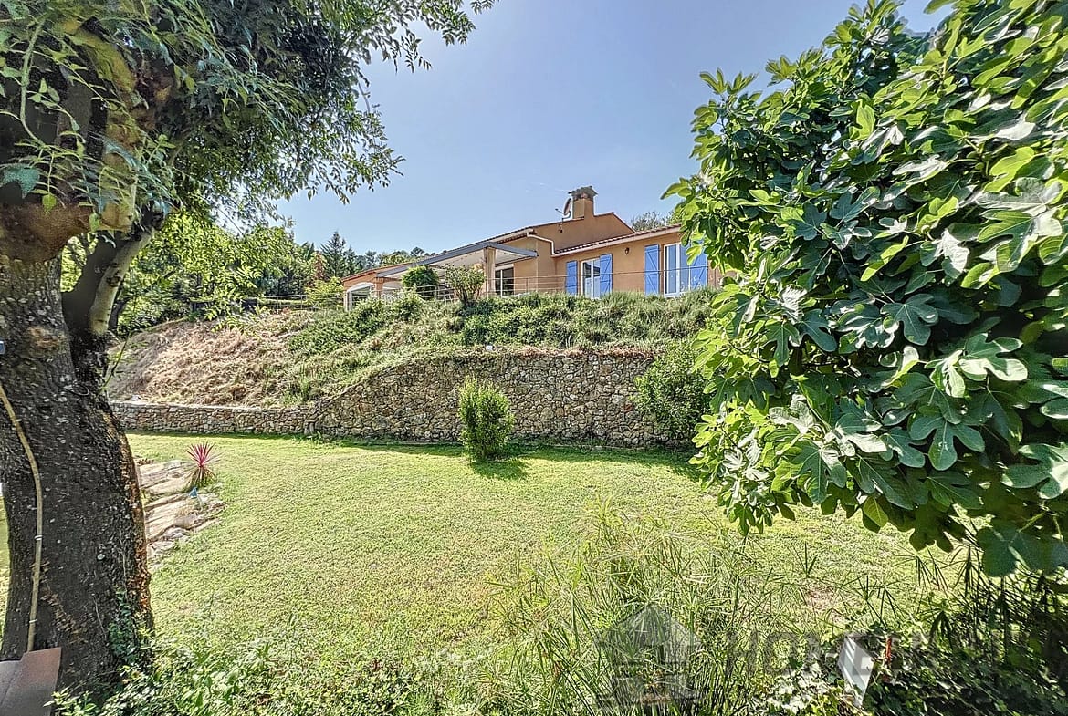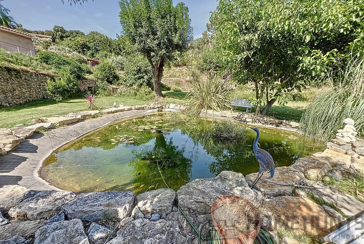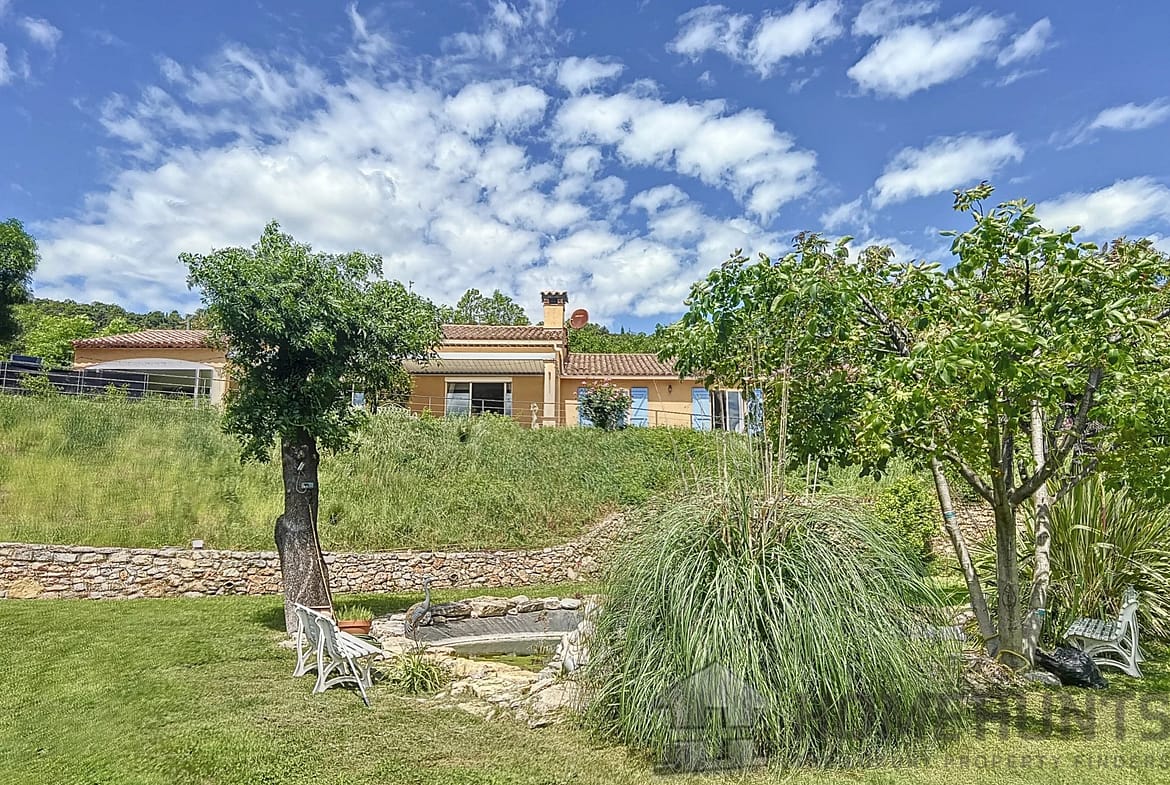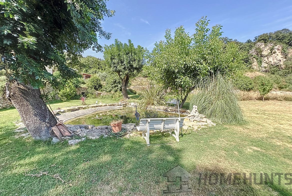 Nestled on the heart of a magnificent 7500 m2 garden on the edge of a river and waterfall, walking distance from the centre of the village while in a very quiet area, benefiting from a panoramic view on the surrounding hills.