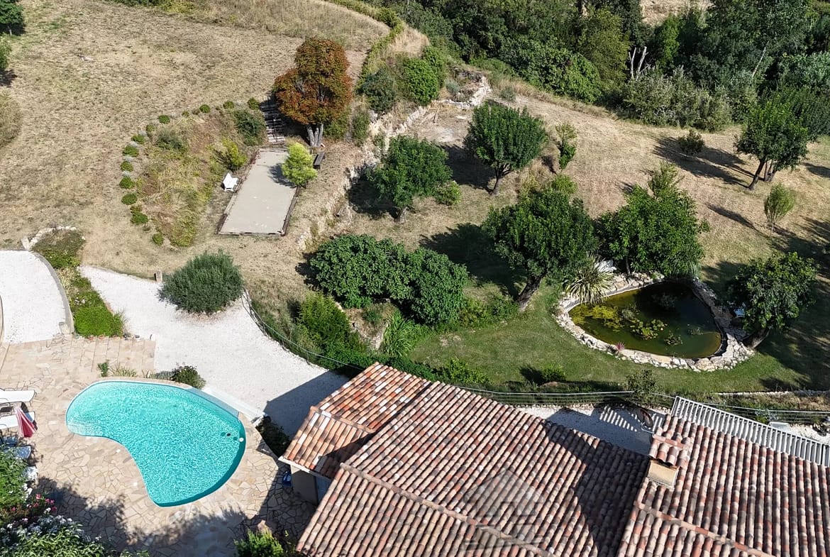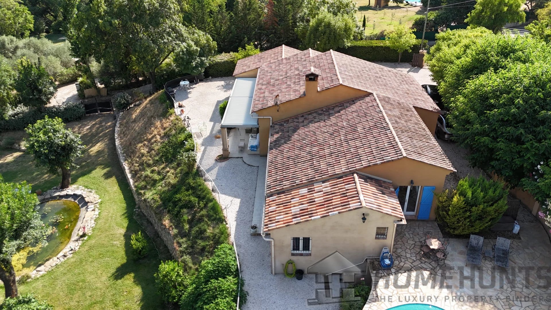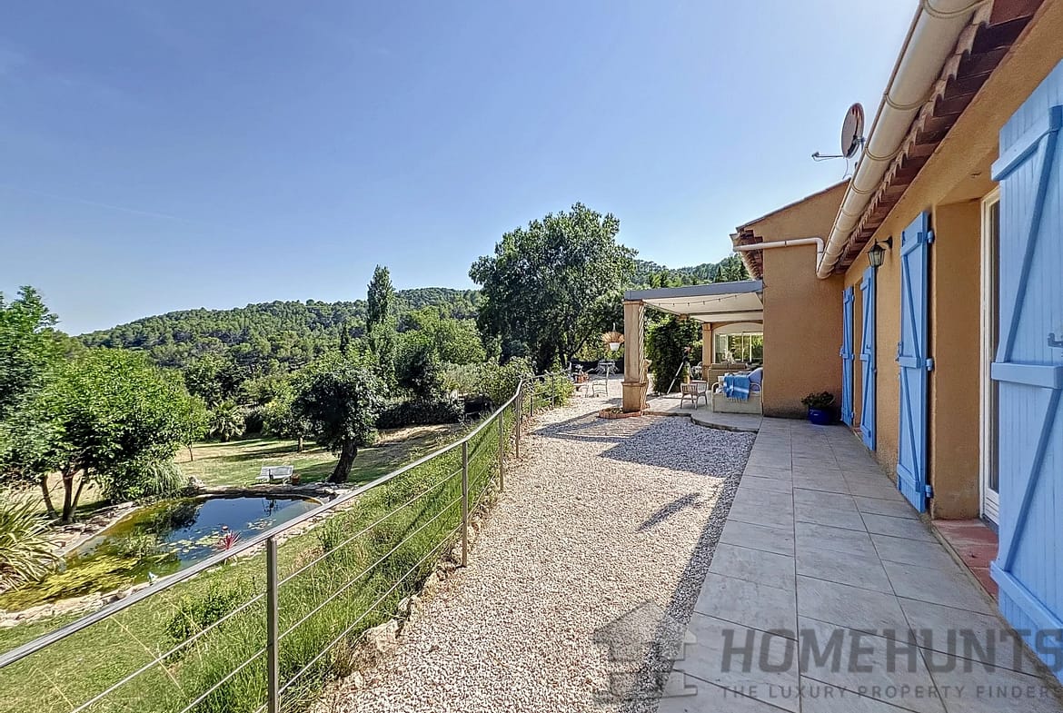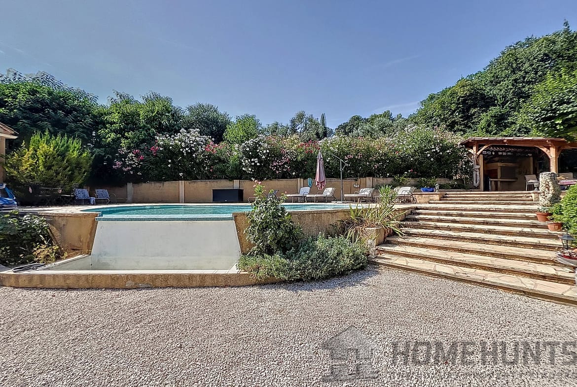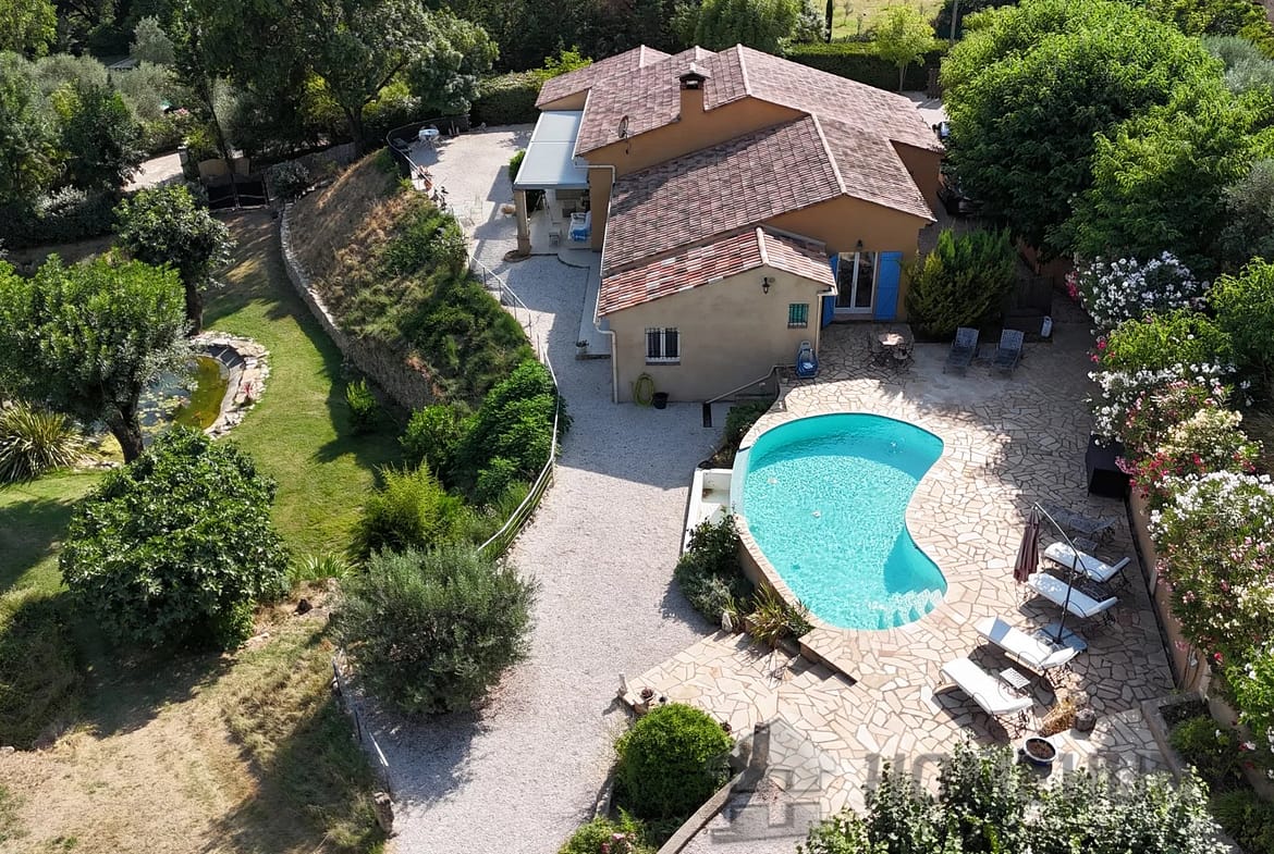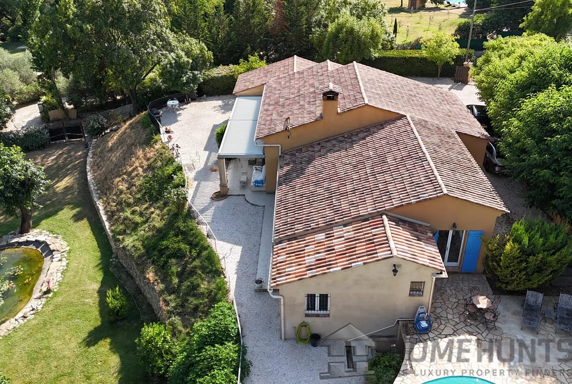 Vast terraces with electrical cover on the pergola, infinity pool and pool house, the garden is nicely planted with Mediterranean species and is benefiting from a charming pond.