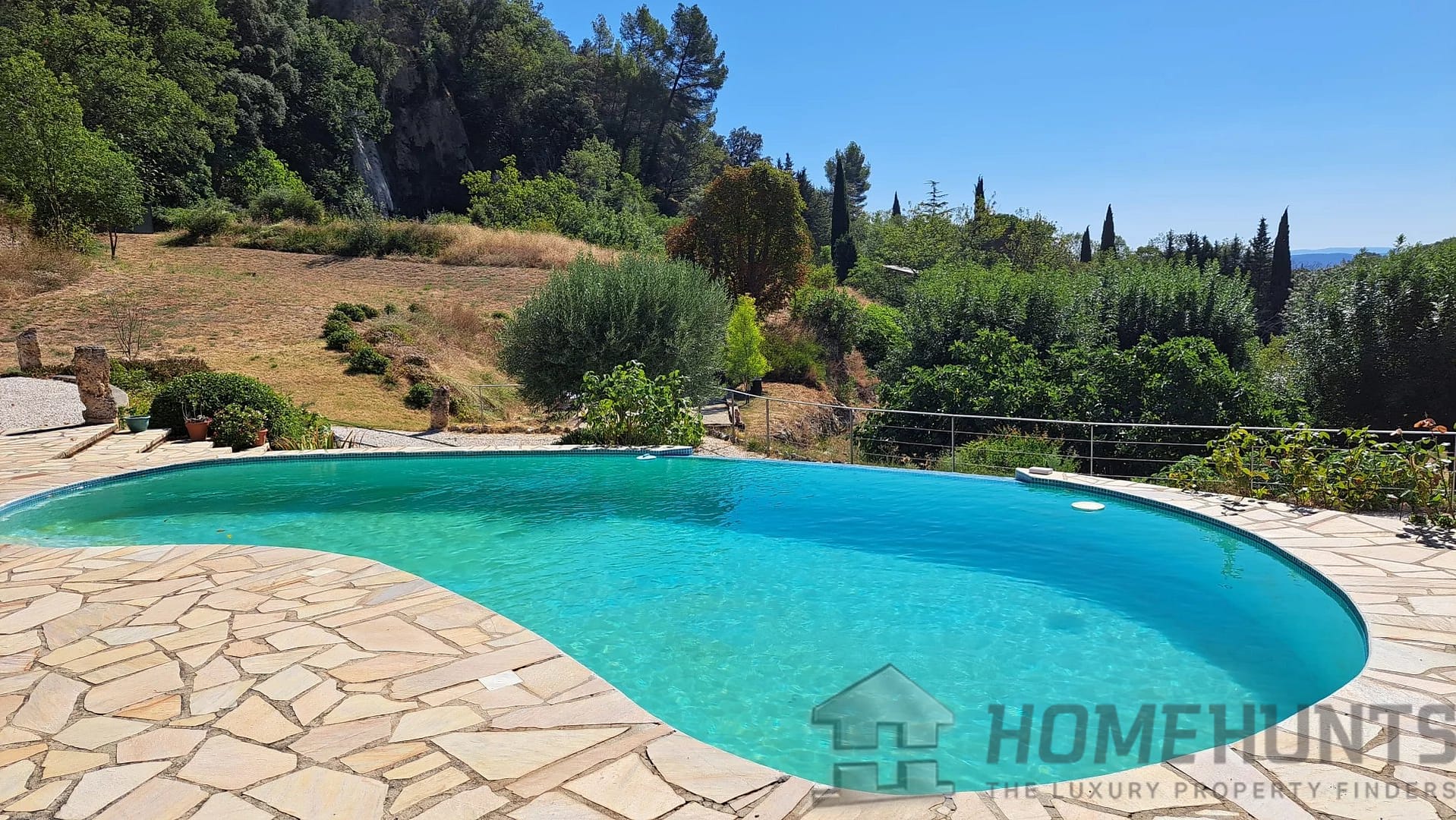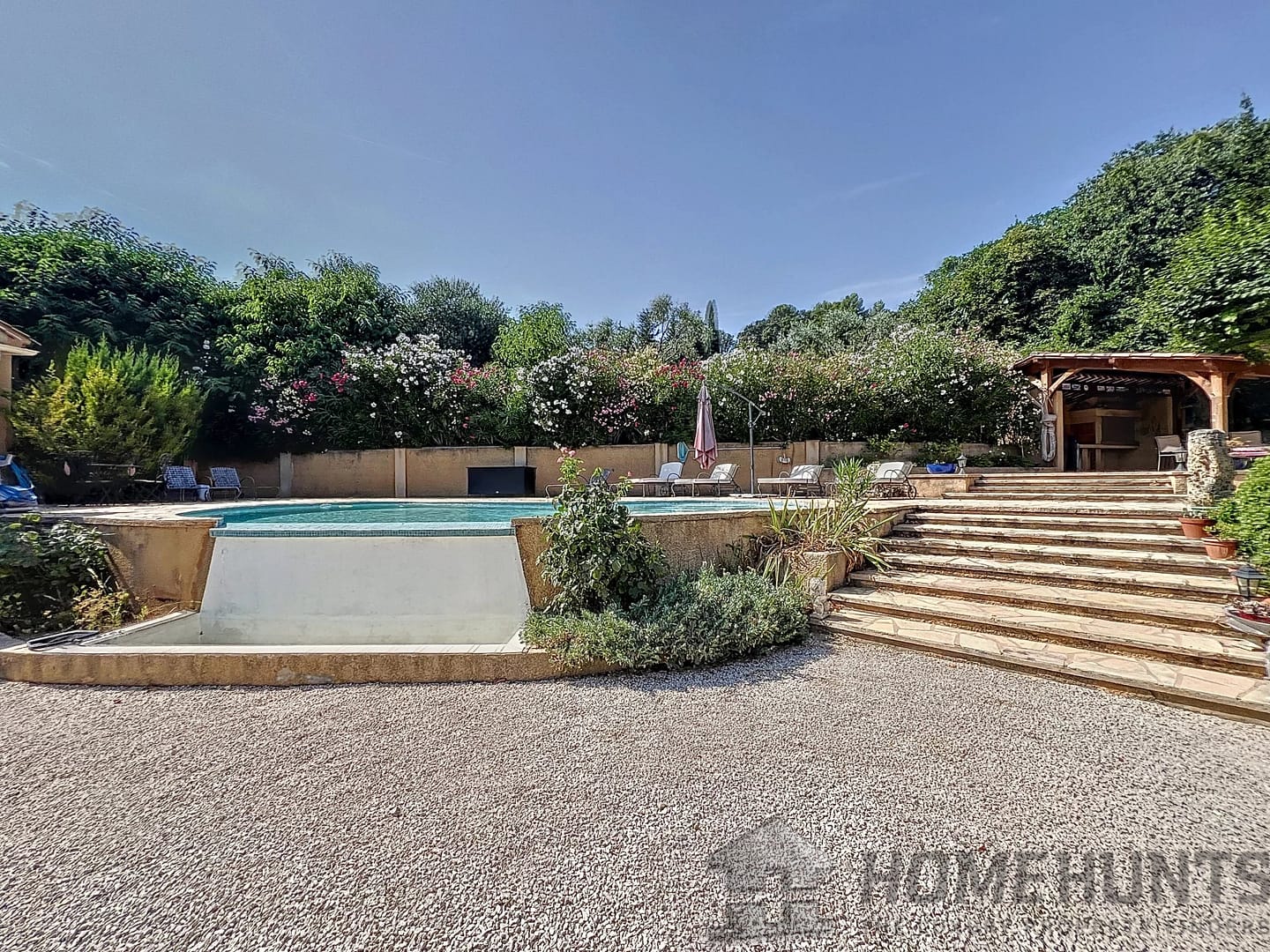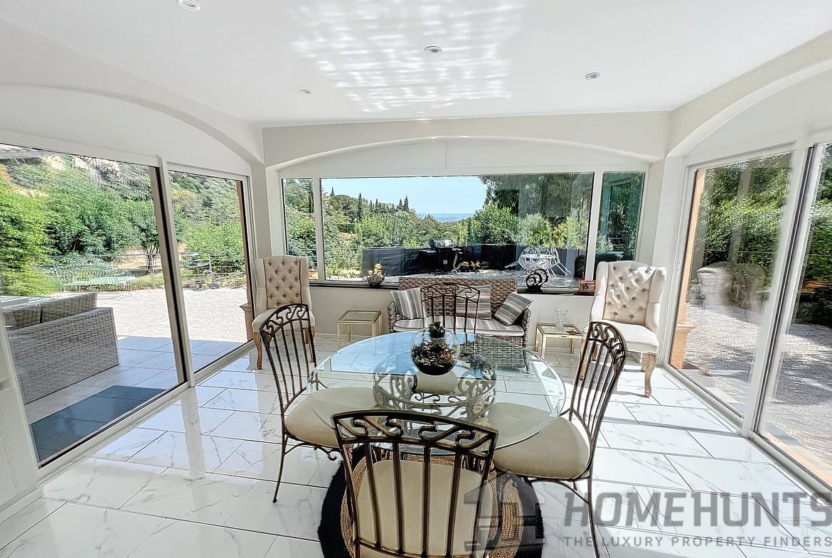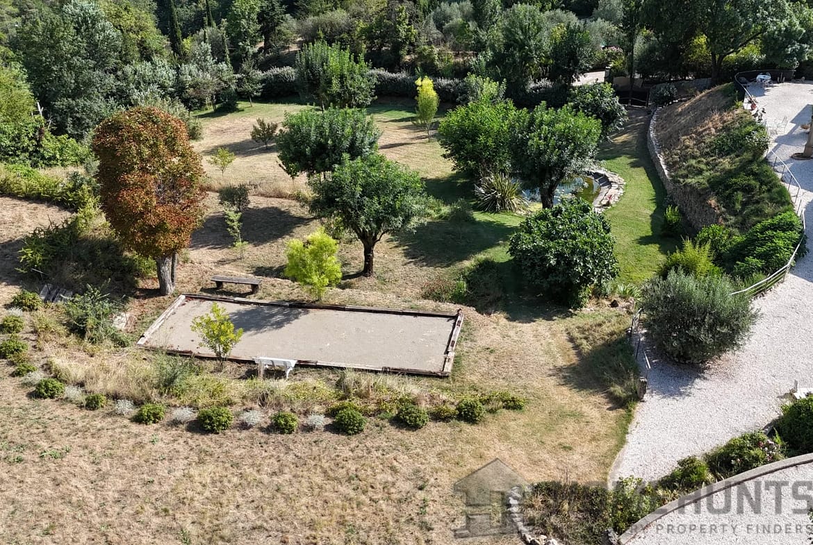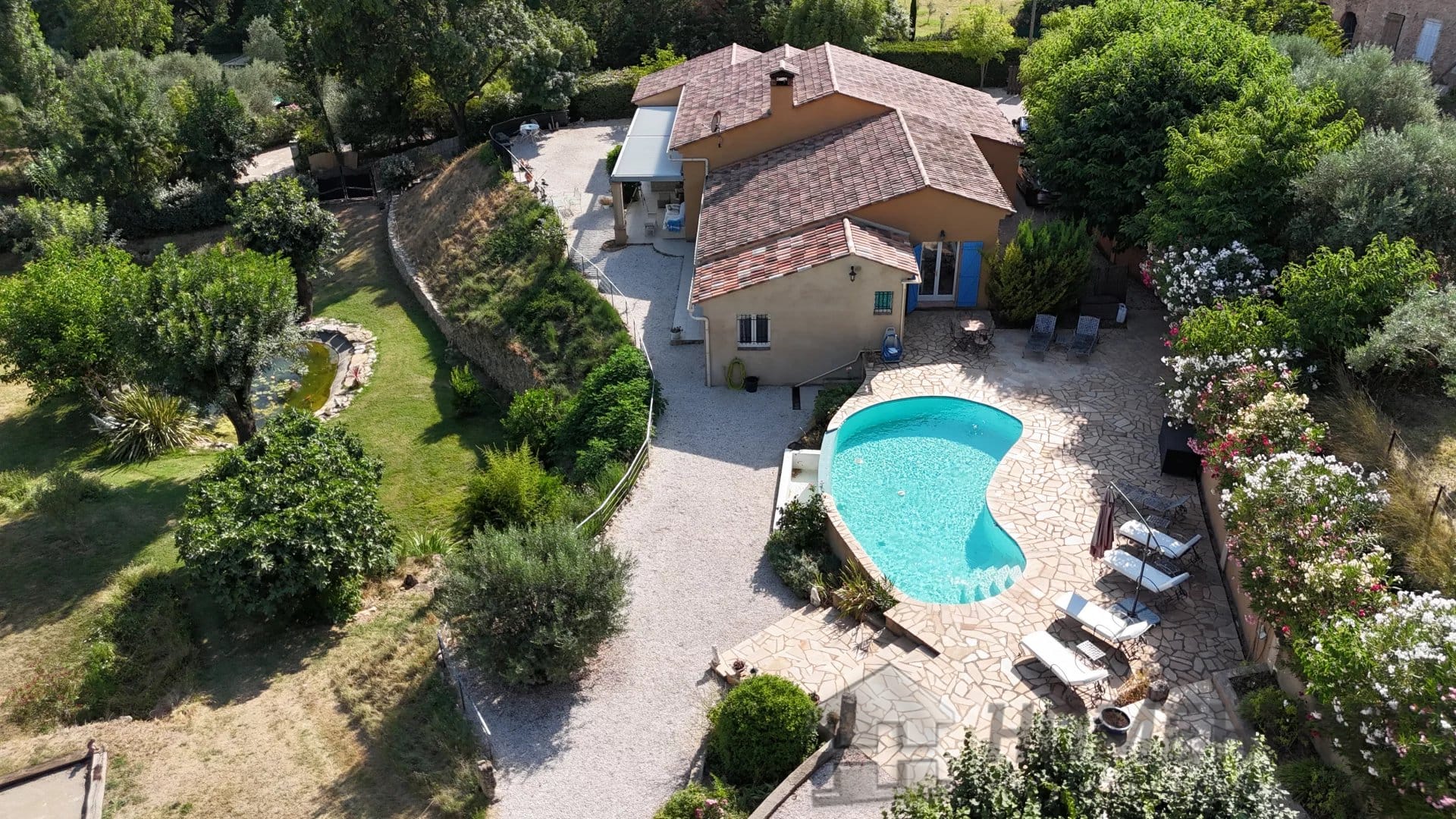 Vast terraces with electrical cover on the pergola, infinity pool and pool house, the garden is nicely planted with Mediterranean species and is benefiting from a charming pond.