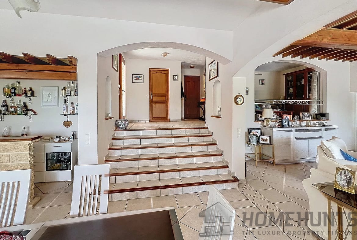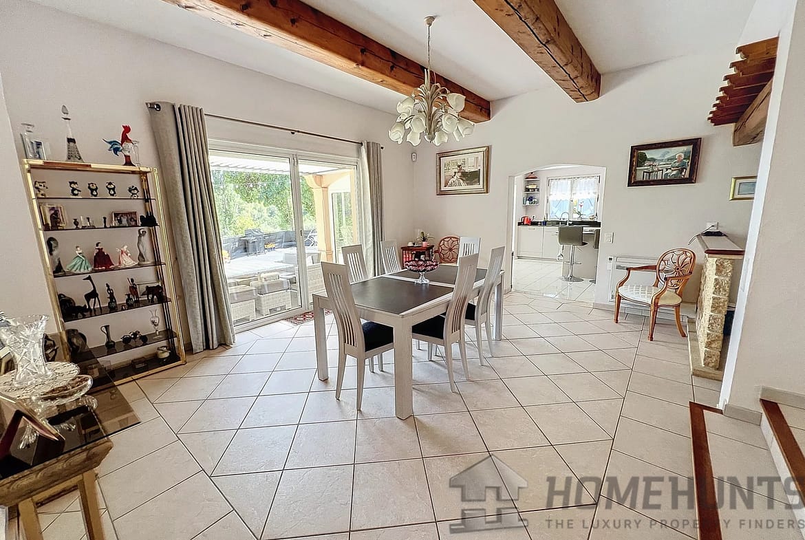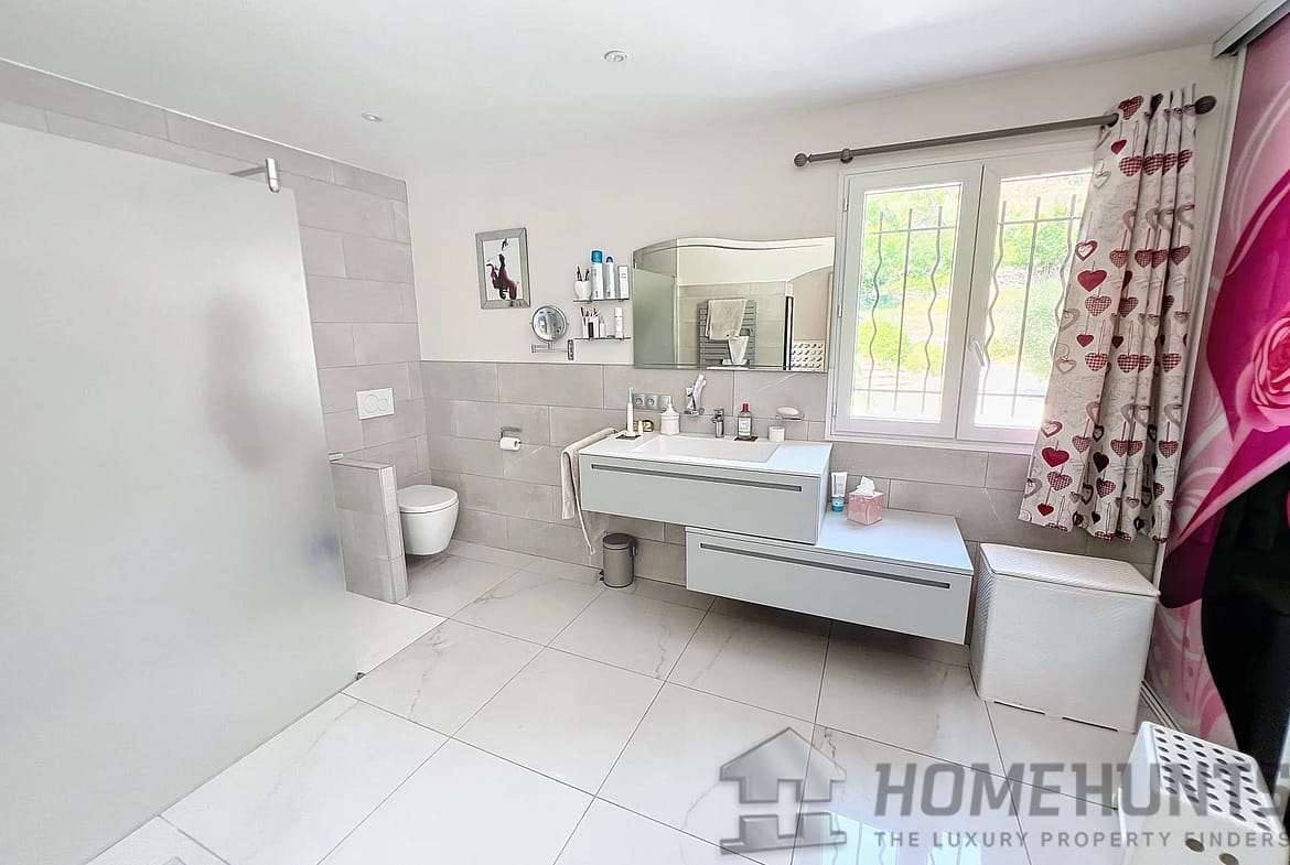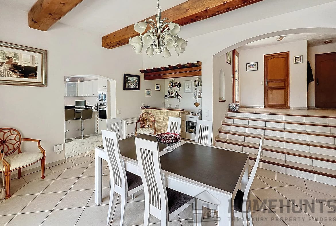 This 208 m2 villa offer a large entrance hall with dressing, wc, study overhanging the living room with stove, dining room, fitted kitchen, these rooms are opening on the terrace through large patio doors, veranda, 3 bedrooms of which 2 ensuite, bathroom with both shower and bath.