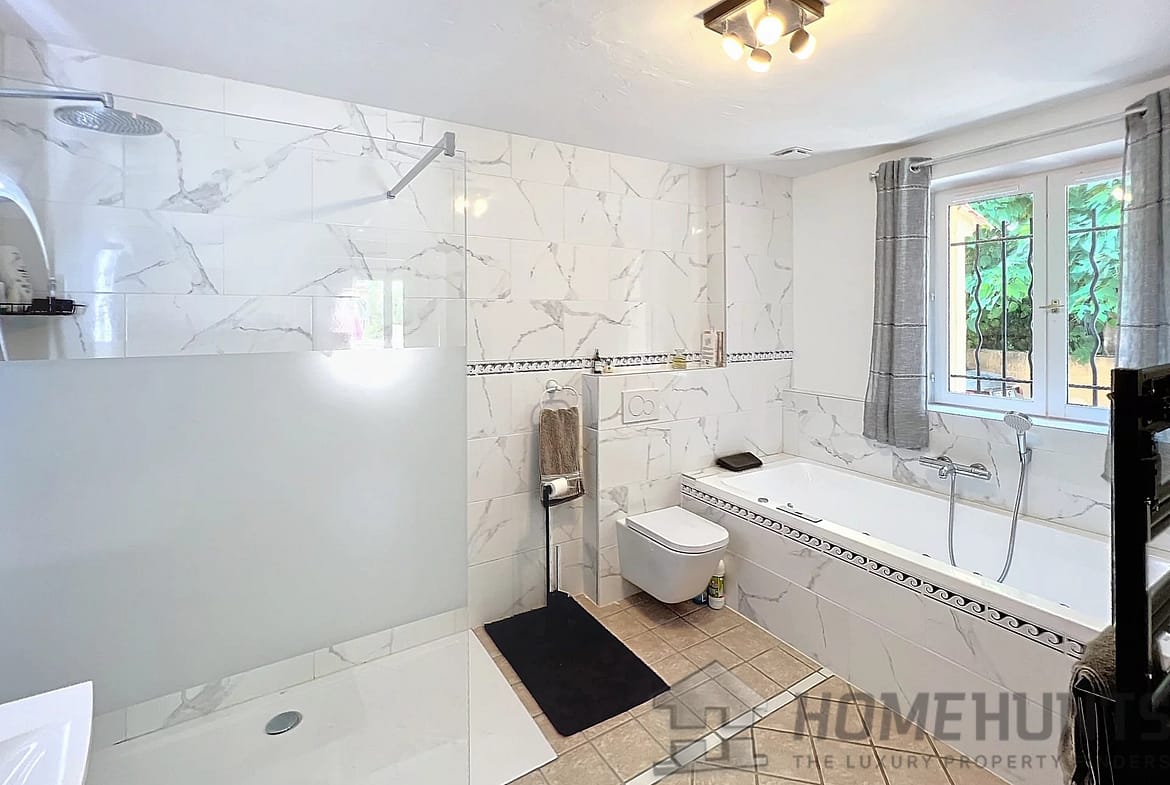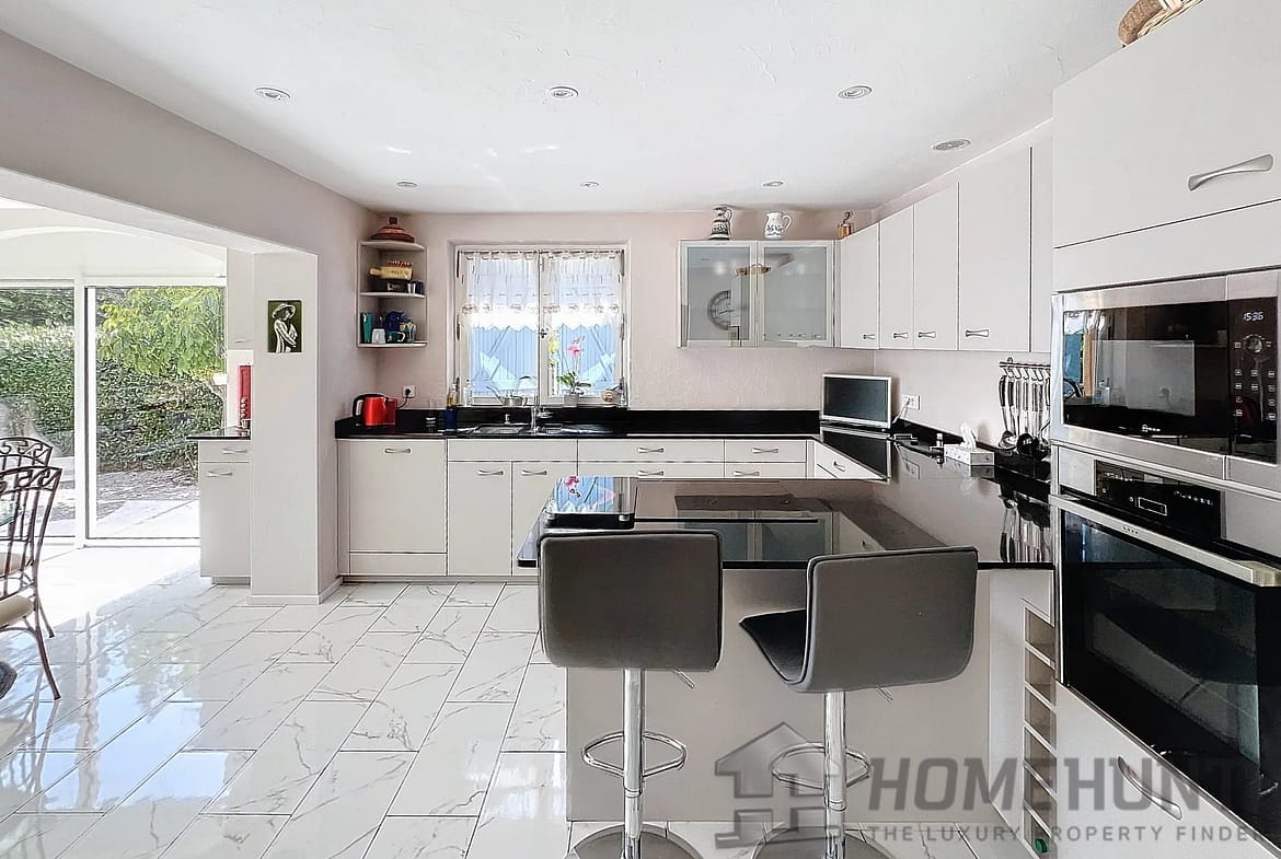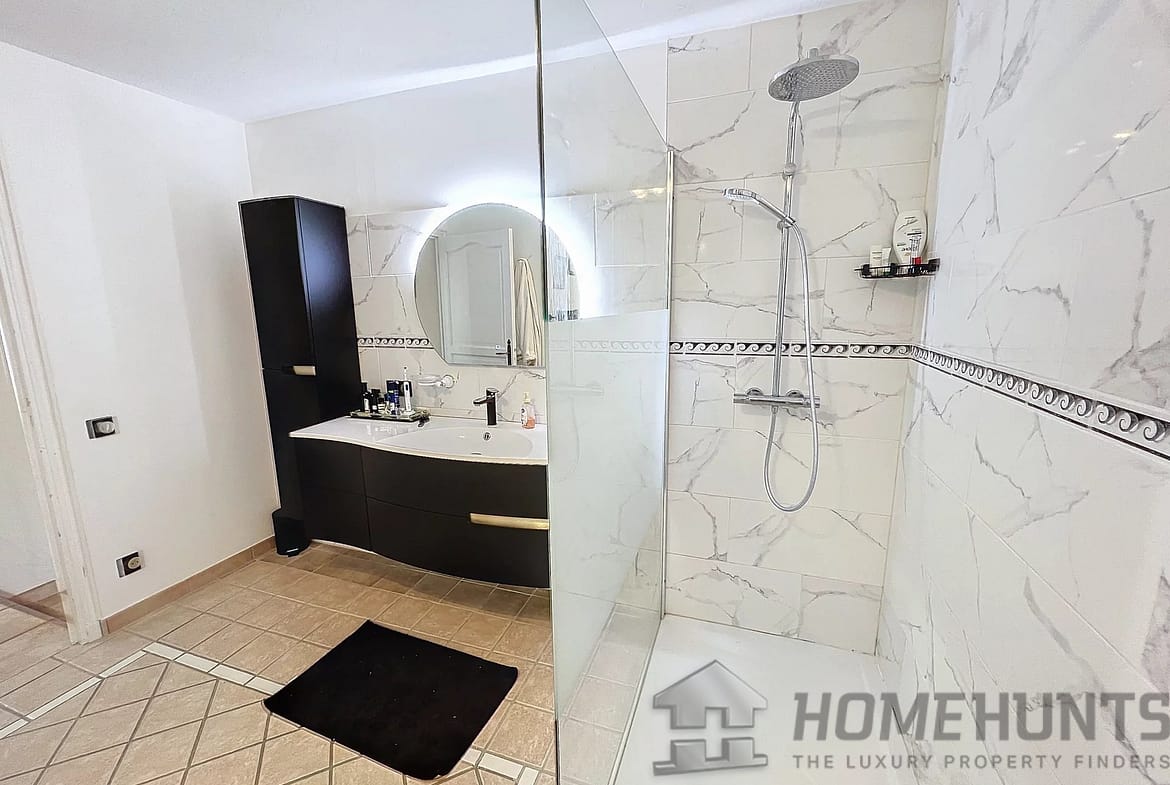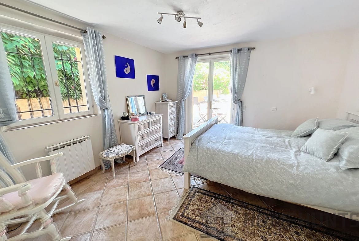 This 208 m2 villa offer a large entrance hall with dressing, wc, study overhanging the living room with stove, dining room, fitted kitchen, these rooms are opening on the terrace through large patio doors, veranda, 3 bedrooms of which 2 ensuite, bathroom with both shower and bath.