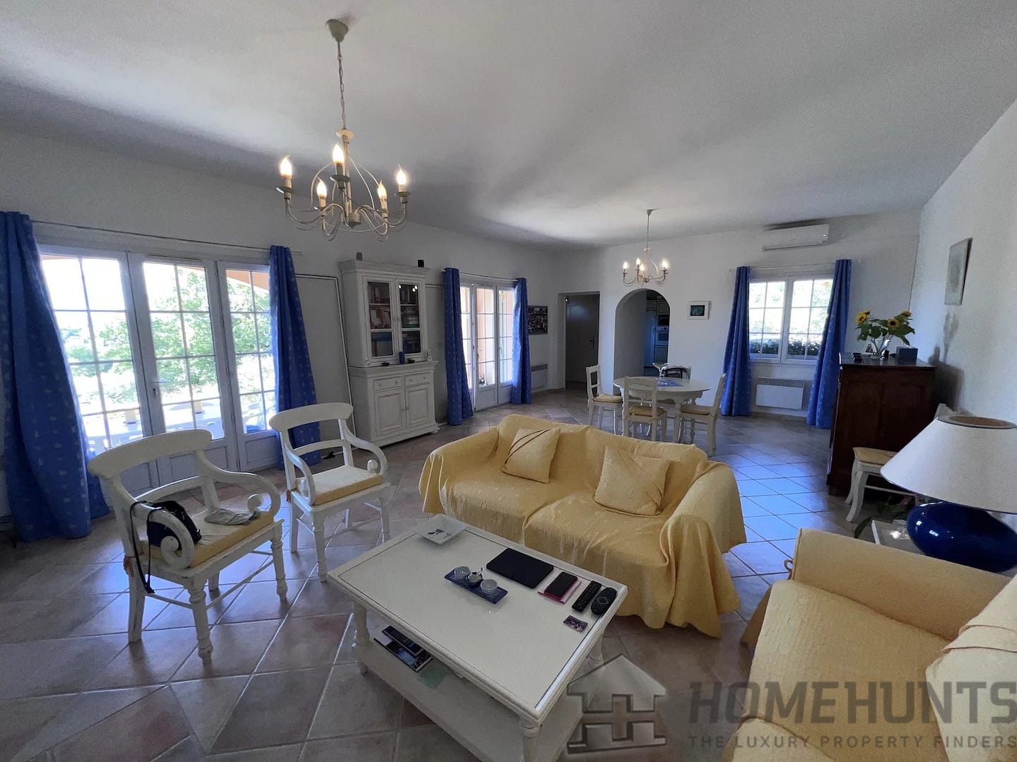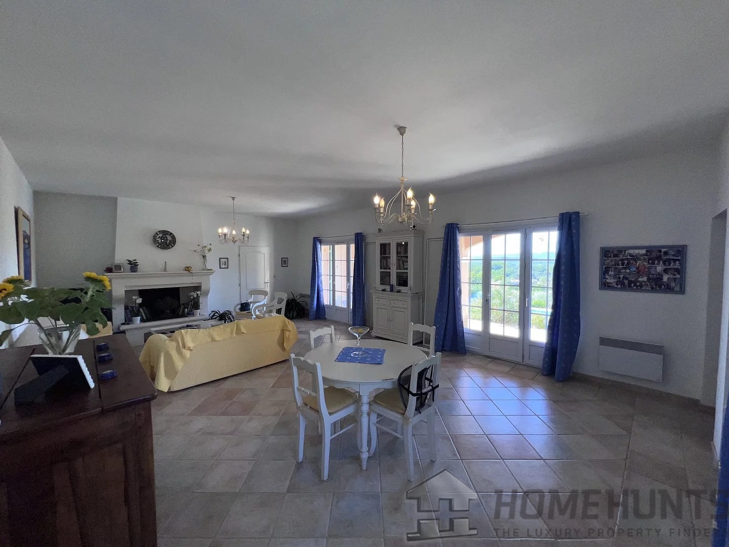 – Bright living / dining room with fireplace, opening onto a shaded south-facing terrace