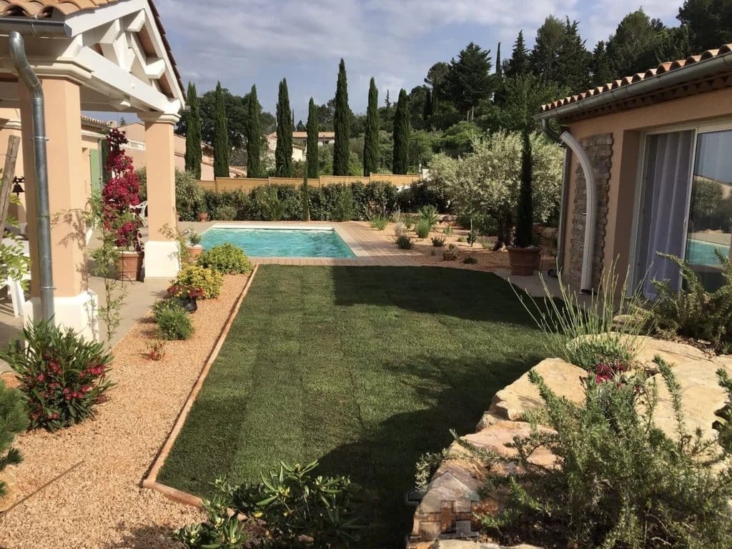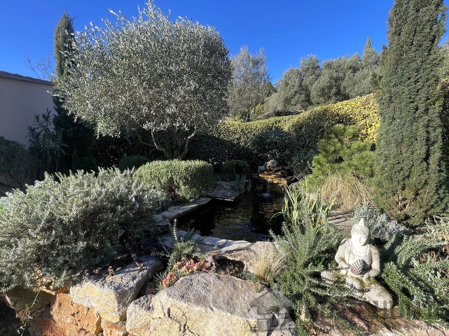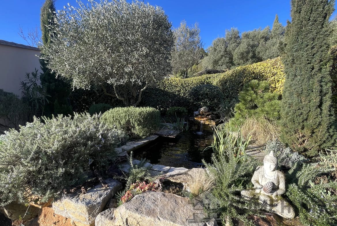 A Japanese-style basin has been created on the lawn. Its waterfall, aquatic vegetation, and the presence of two koi carp invite serenity…