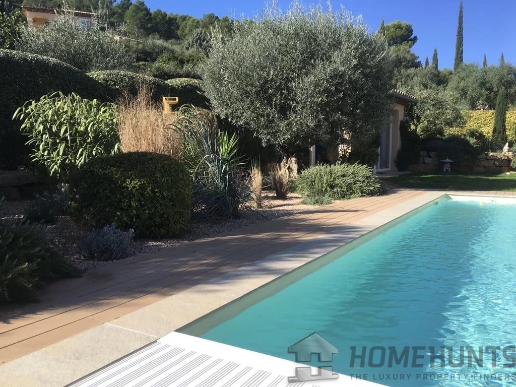 Sliding glass doors open onto the terraces, garden, and swimming pool.