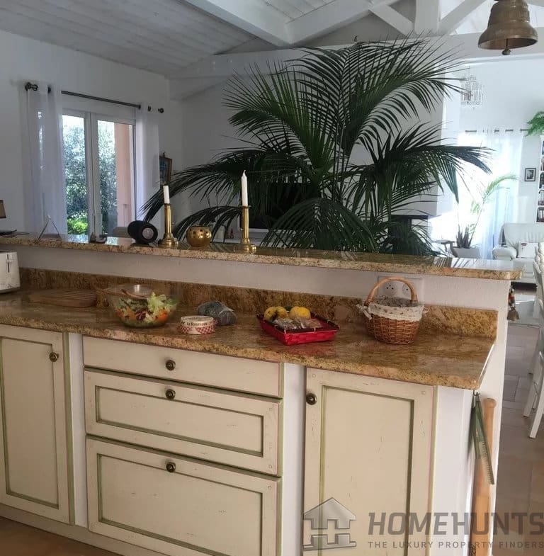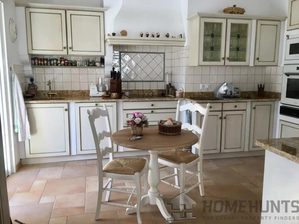 The kitchen was custom-designed, built, and furnished by master cabinetmakers from the “Compagnons du Tour de France des Devoirs Unis” (Tour of France Craftspersons). The countertops are made of solid pink granite, Juparana Gold Kashmir from India. The American fridge, built-in oven at eye level, plate warmer, microwave, dishwasher, and cooking hob complete the layout.