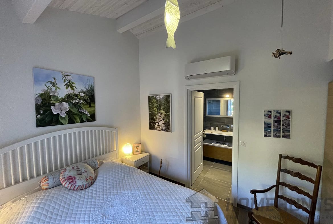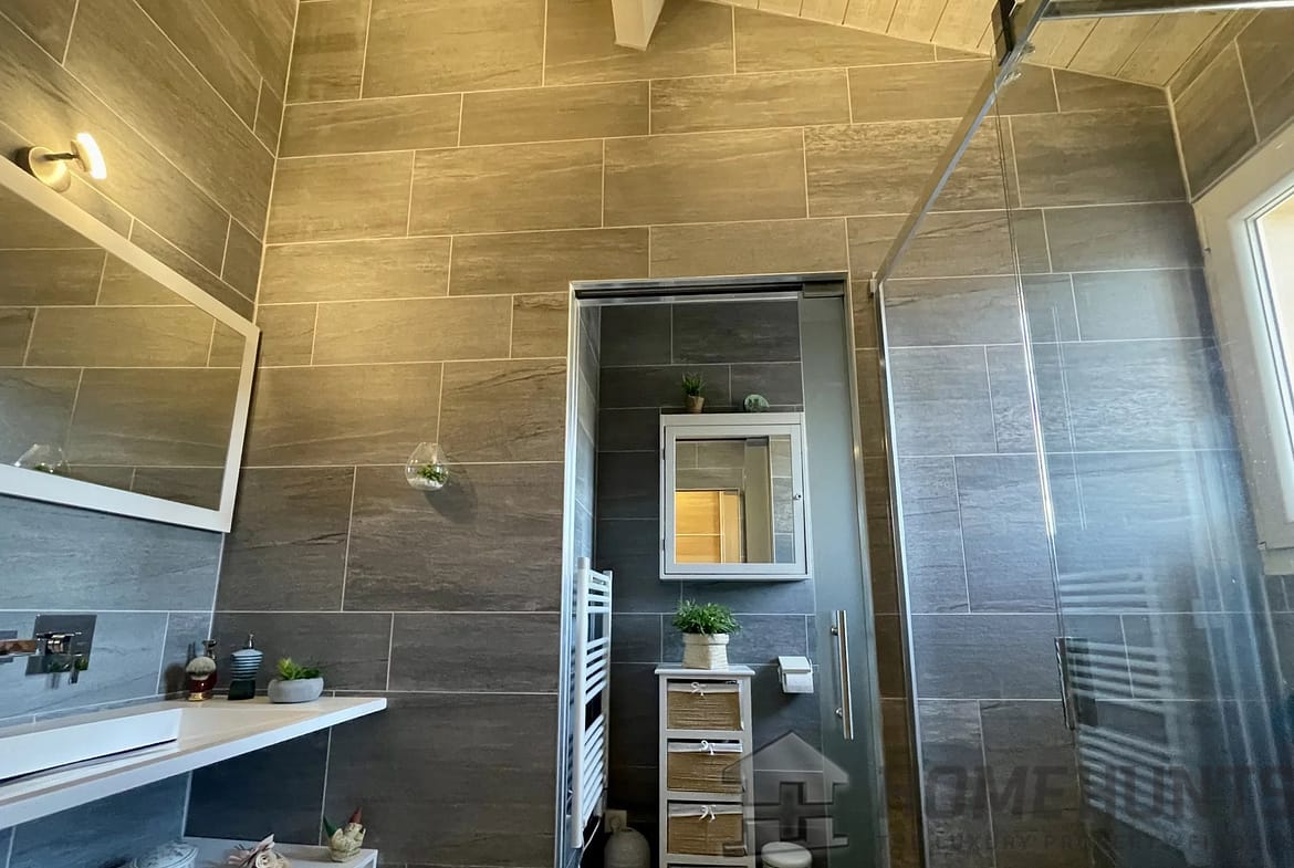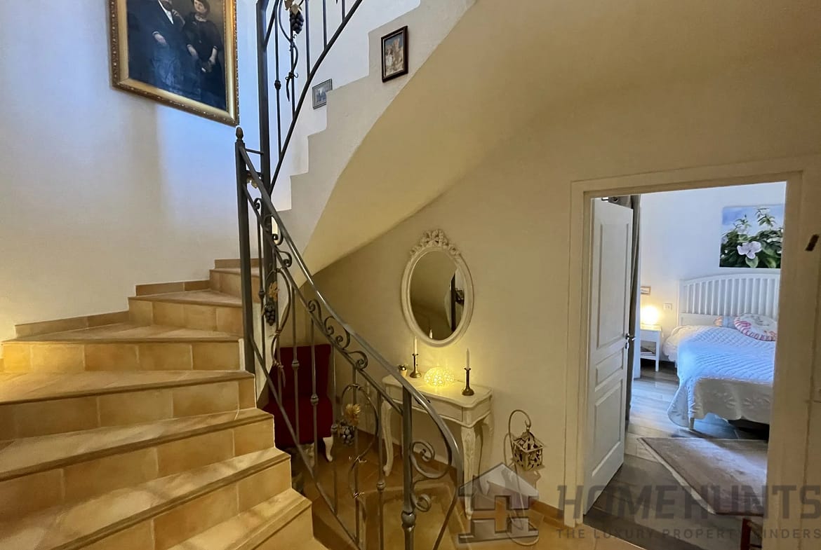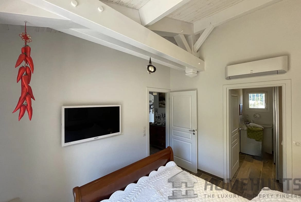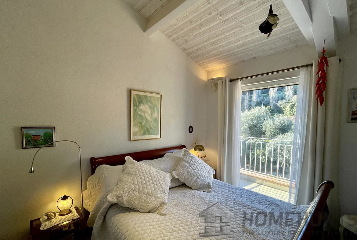 Upstairs, the Master Bedroom has its own balcony with a 180 degree view overlooking the Forest, the Sanctuaire Notre-Dame-De-Graces, the Garden, and the Pool. It features a spacious fitted dressing room, a private shower room with an Italian-style shower, a separate toilet with a heated towel rail, and sliding partition doors with frosted glass.