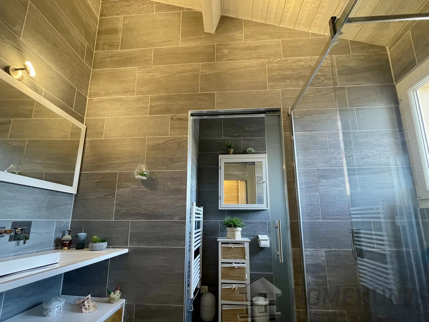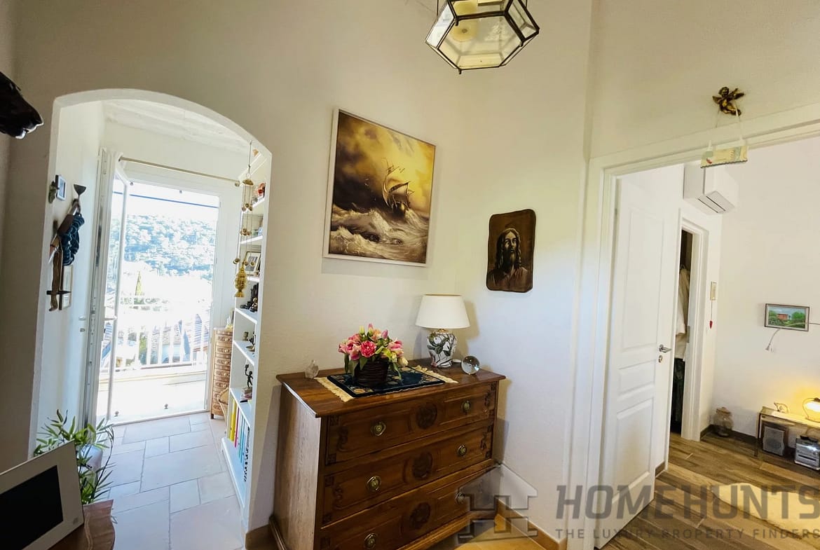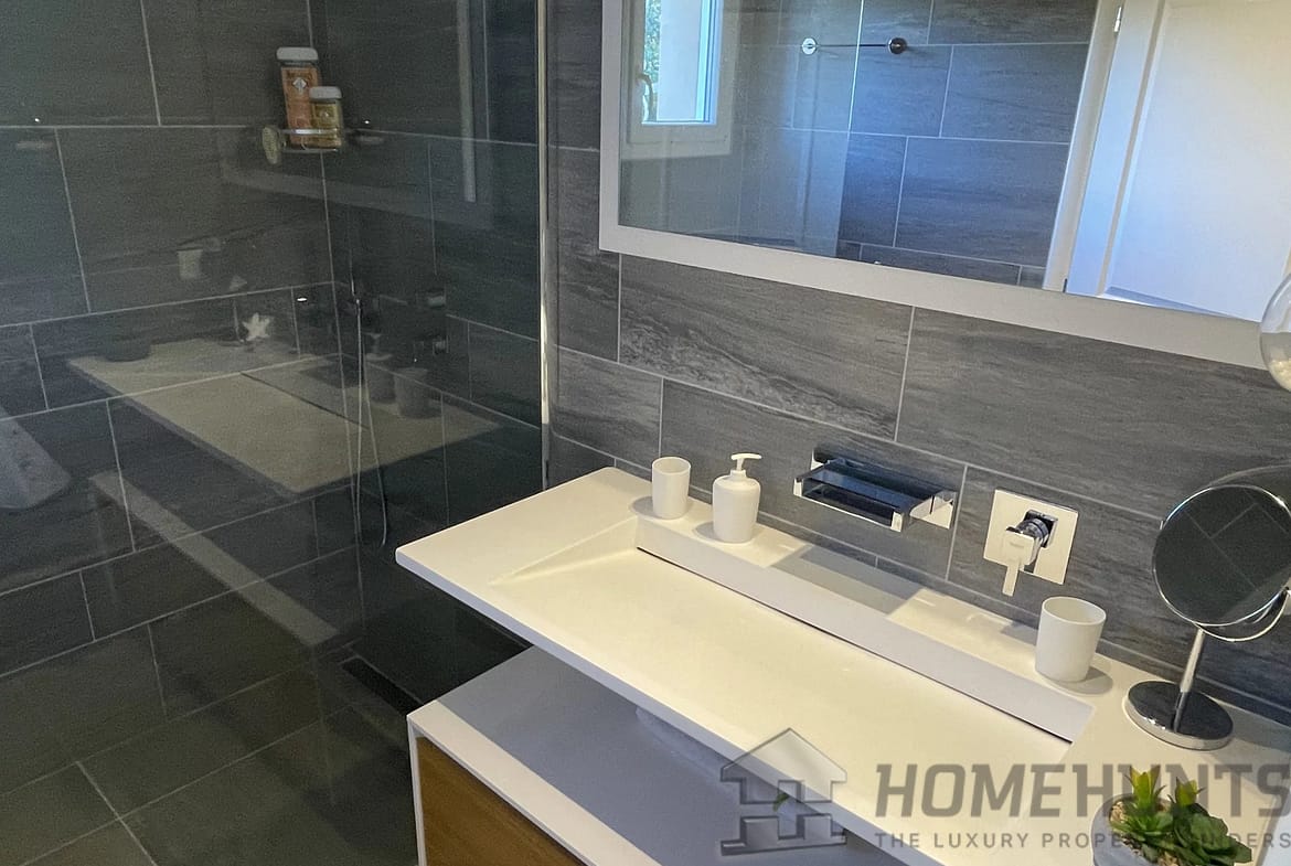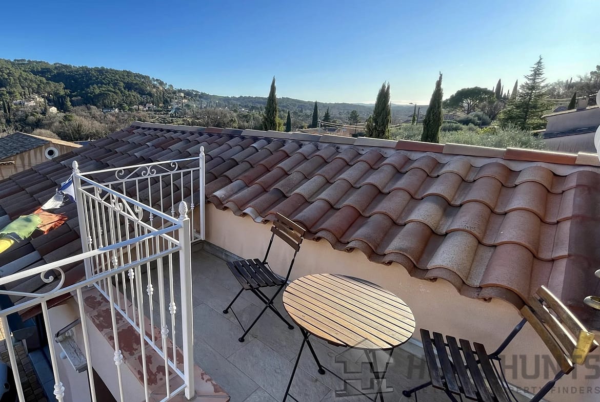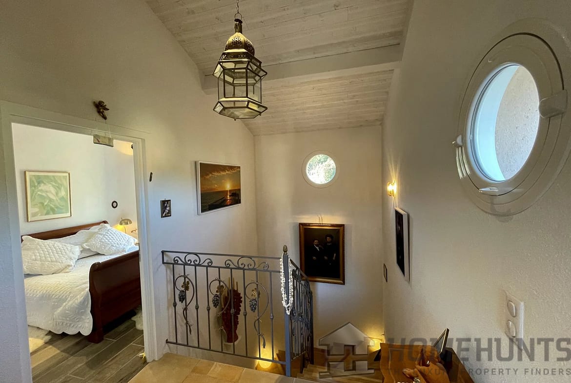 Upstairs, the Master Bedroom has its own balcony with a 180 degree view overlooking the Forest, the Sanctuaire Notre-Dame-De-Graces, the Garden, and the Pool. It features a spacious fitted dressing room, a private shower room with an Italian-style shower, a separate toilet with a heated towel rail, and sliding partition doors with frosted glass.