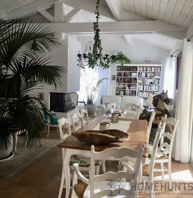 The living room spans a beautiful, bright area of 50m2 and is divided into 2 living areas and a dining area: